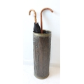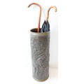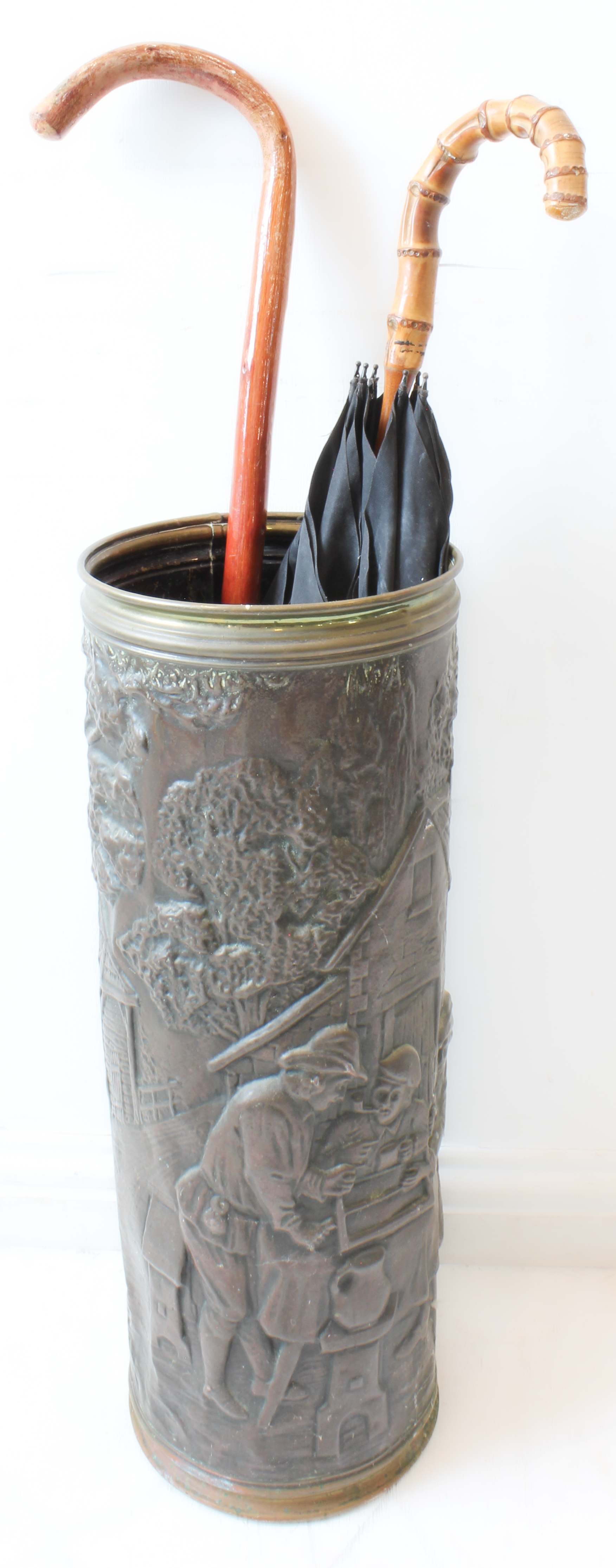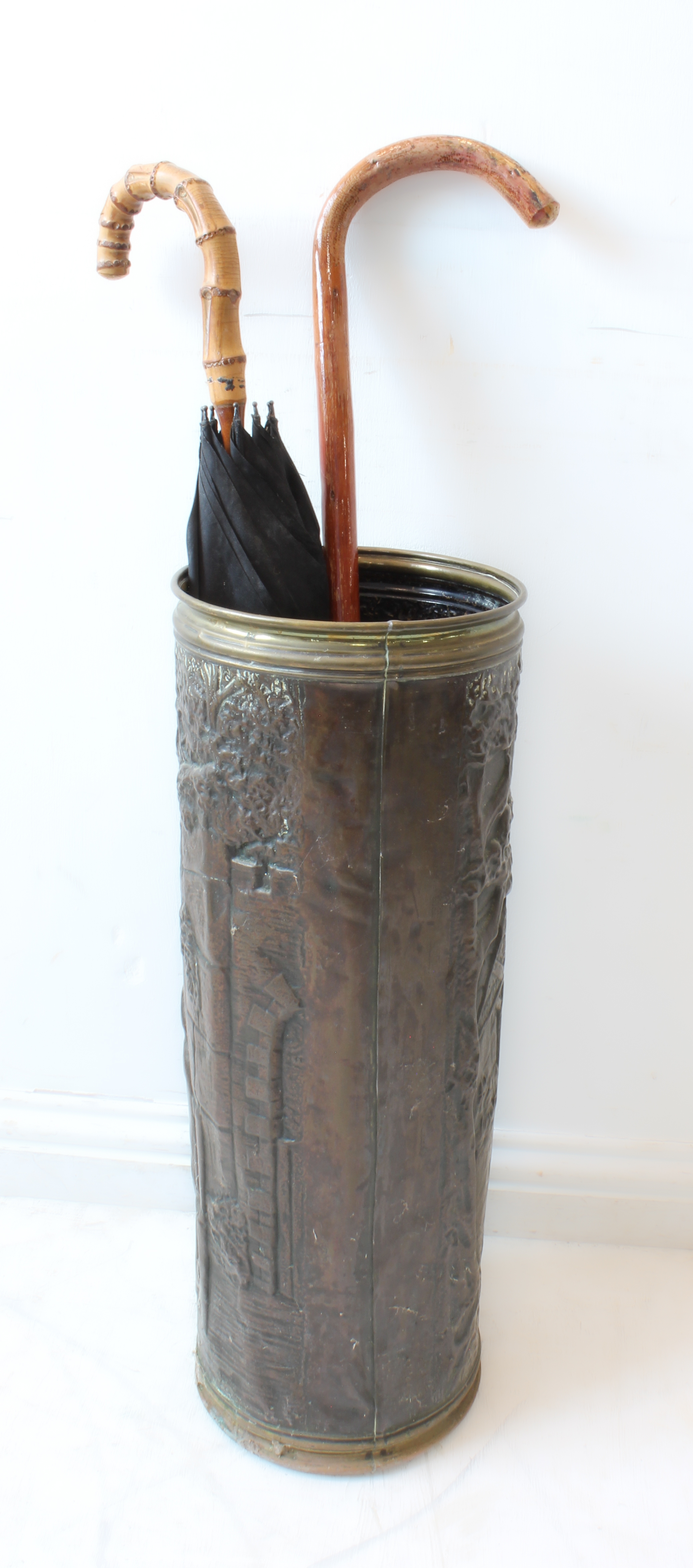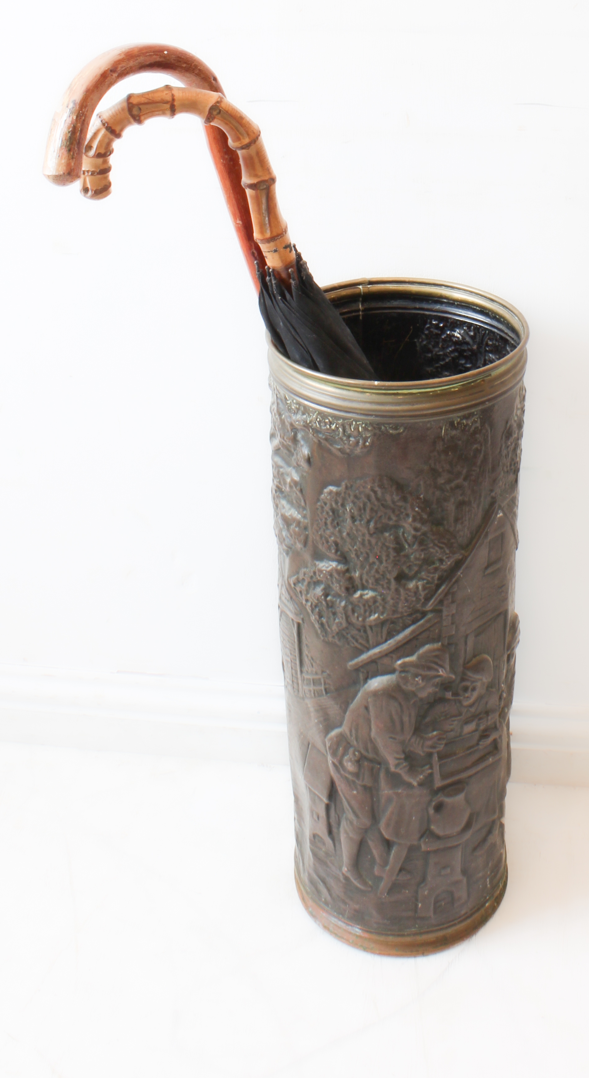 A large and decorative embossed-brass cylindrical umbrella-stand with two umbrellas (23 cm in diameter and 64 cm high)