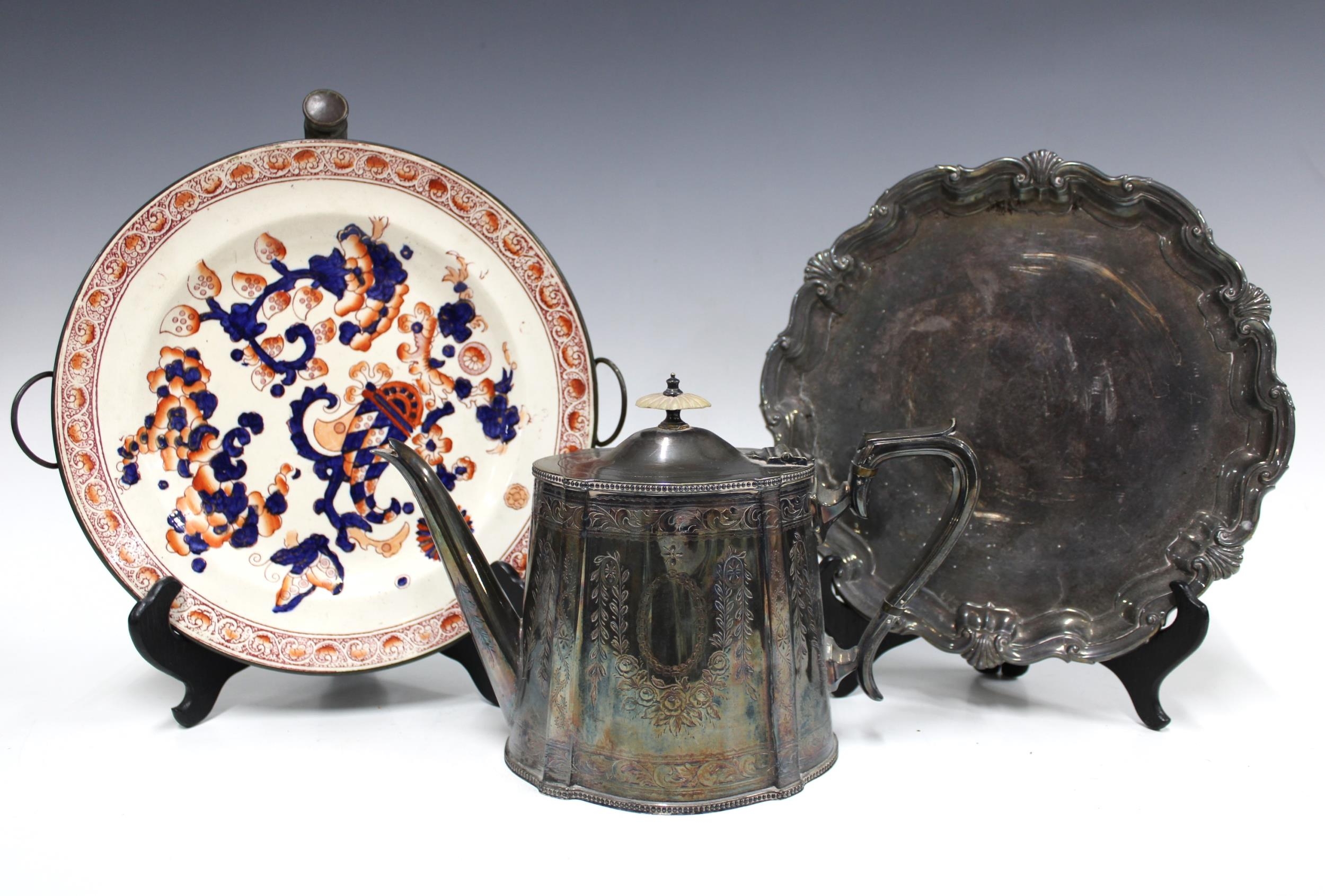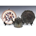 Imari warming plate, 17cm, together with a Mappin & Webb silver plated salver and Epns teapot (3)