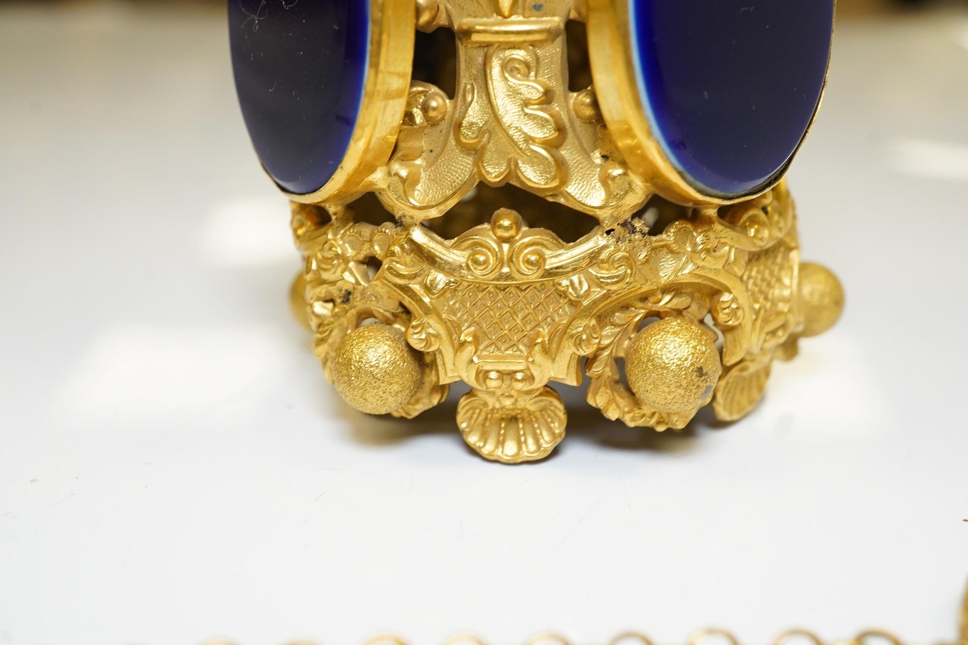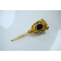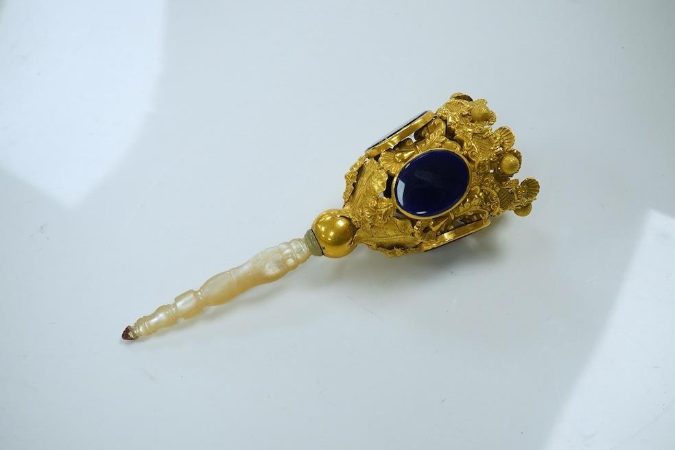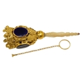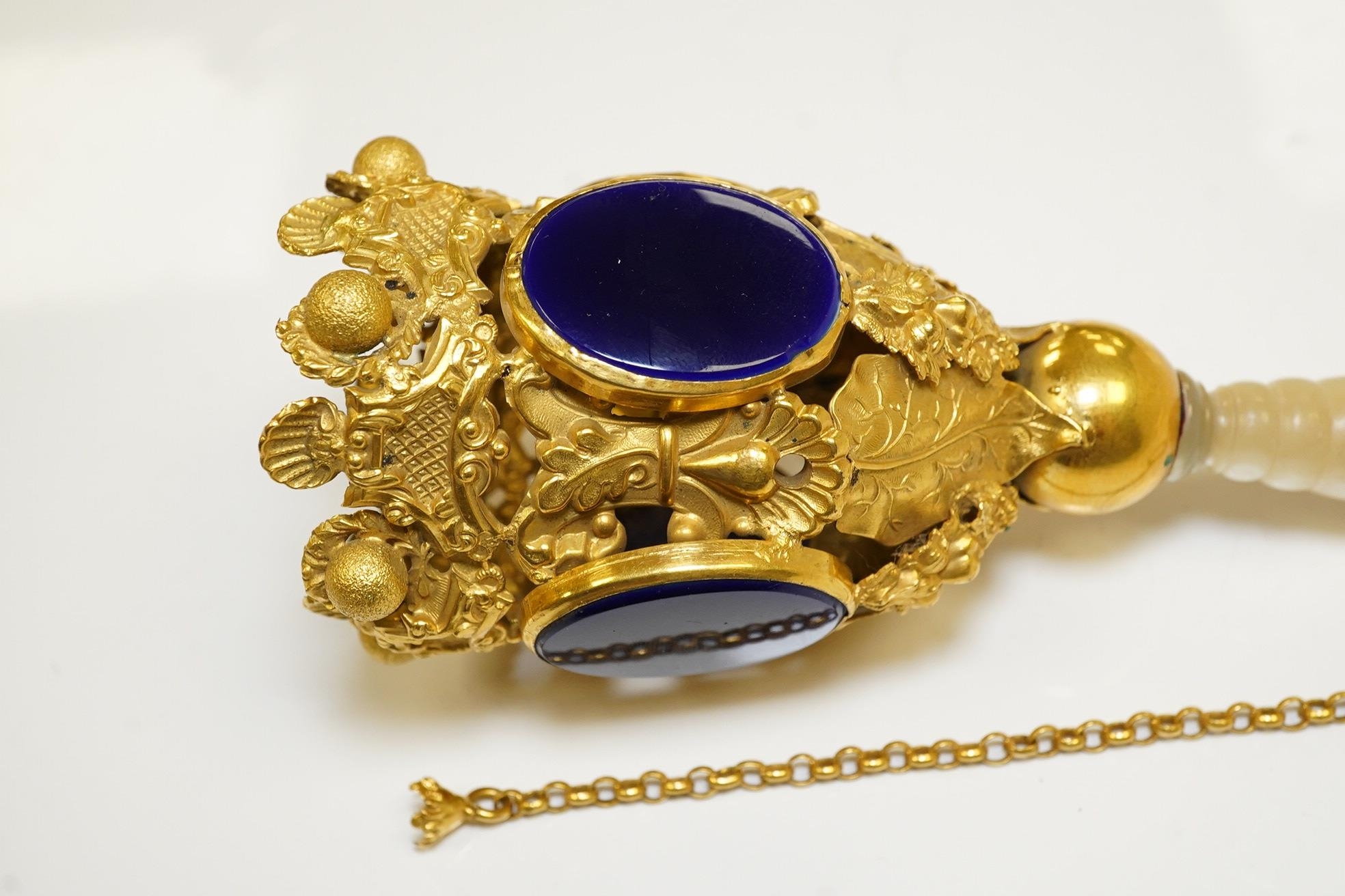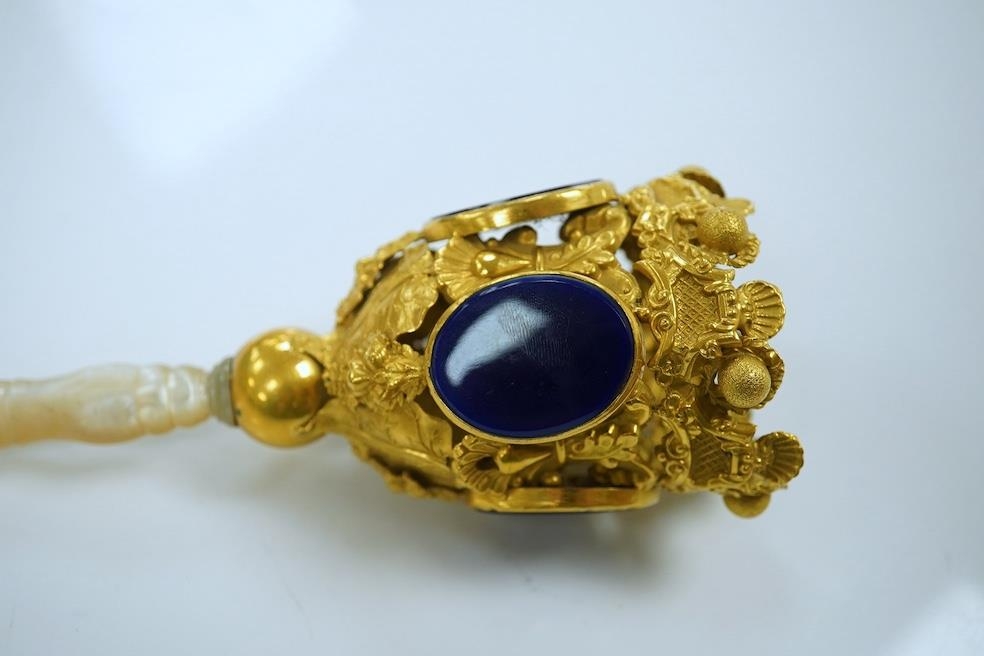 A 19th century Pinchbeck posy holder with mother of pearl handle and inset blue glass panels. Condition - safety chain detached
