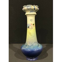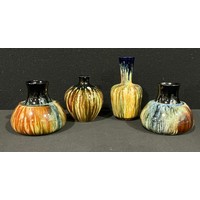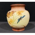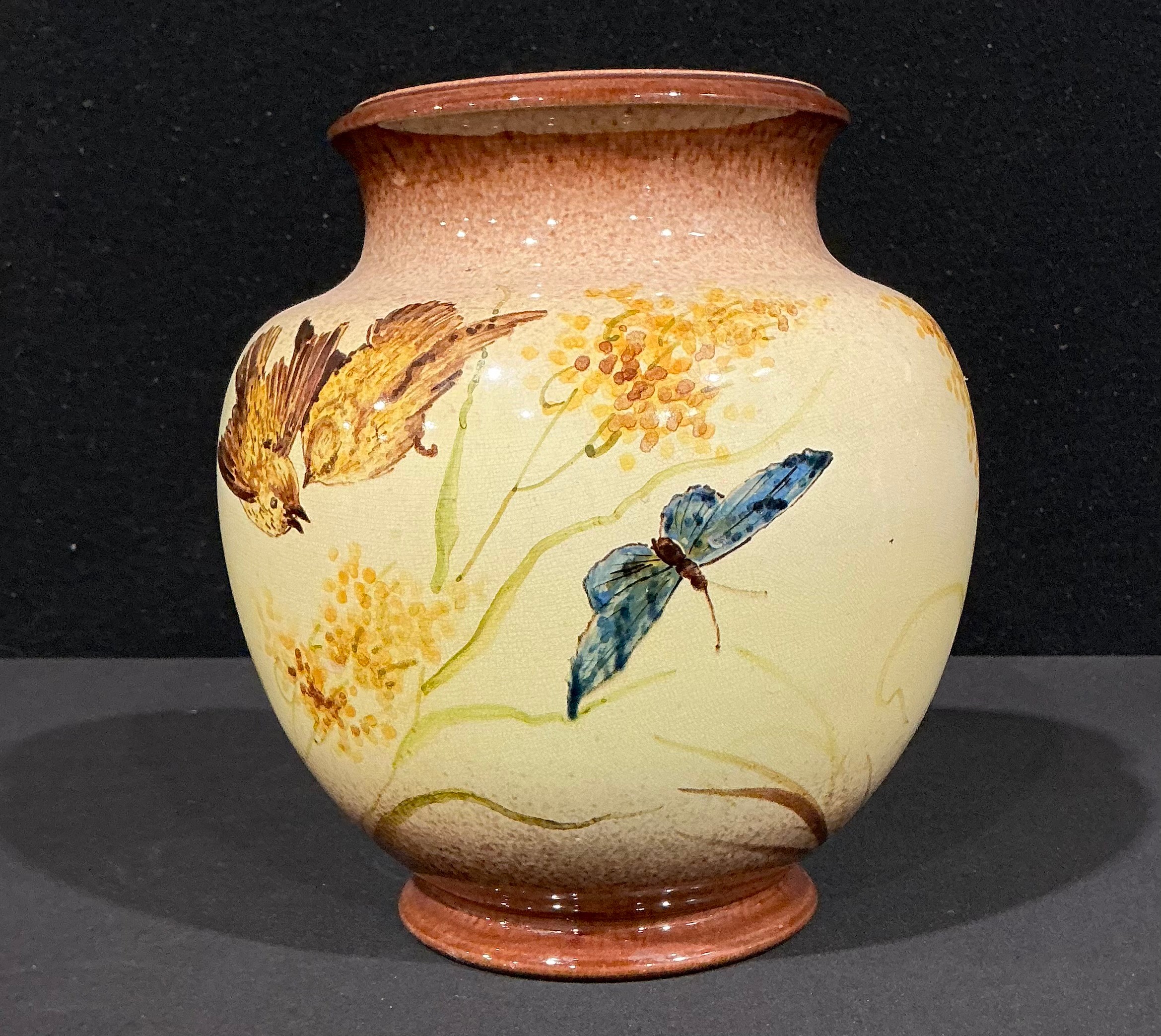 An Ault Pottery ovoid vase, designed by Christopher Dresser (1834 - 1904), decorated by Clarissa Ault, painted with a pair of sparrows with a butterfly, speckle glazed in shades of ochre, yellow, blue and brown, 22cm, monogrammed, c.1890