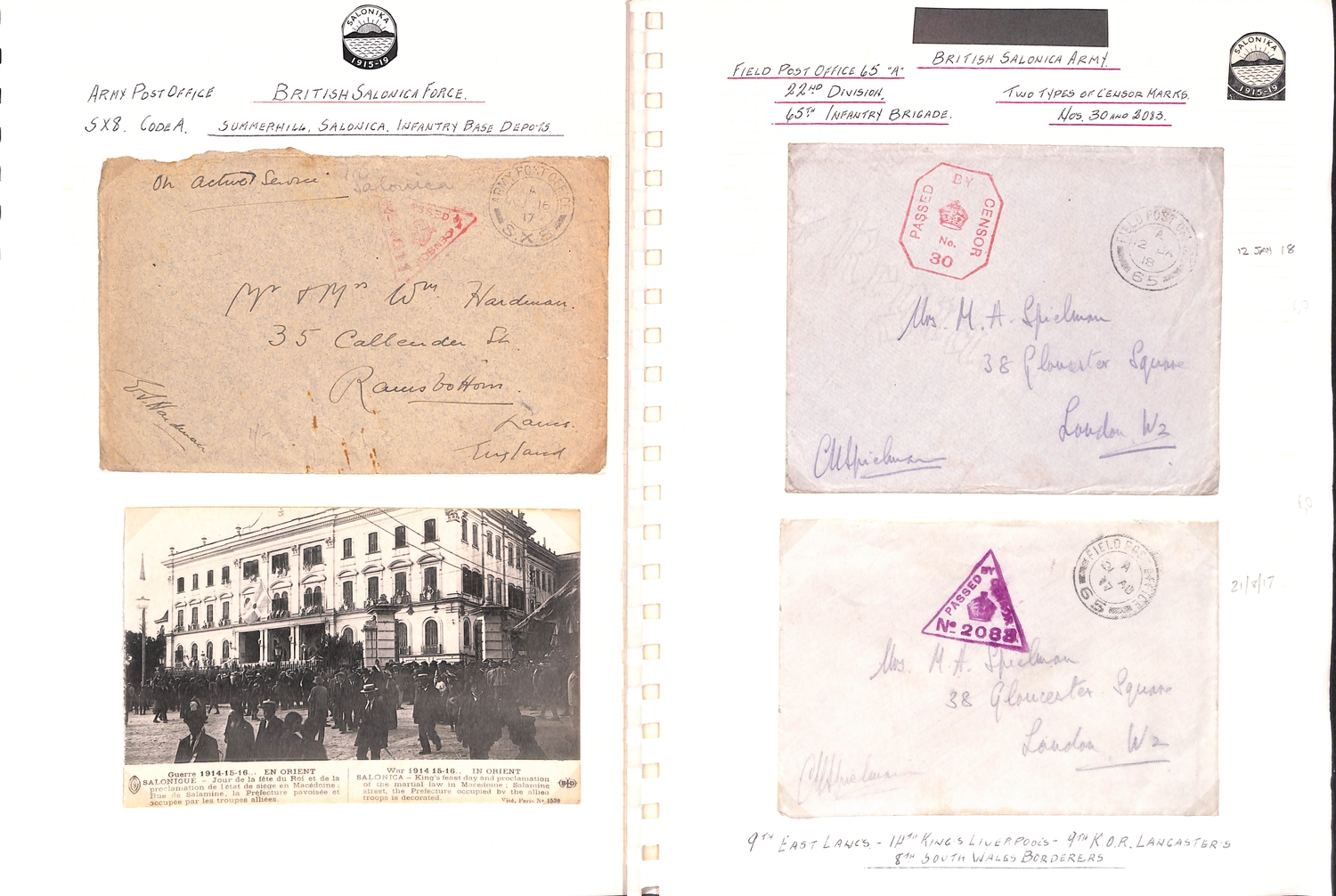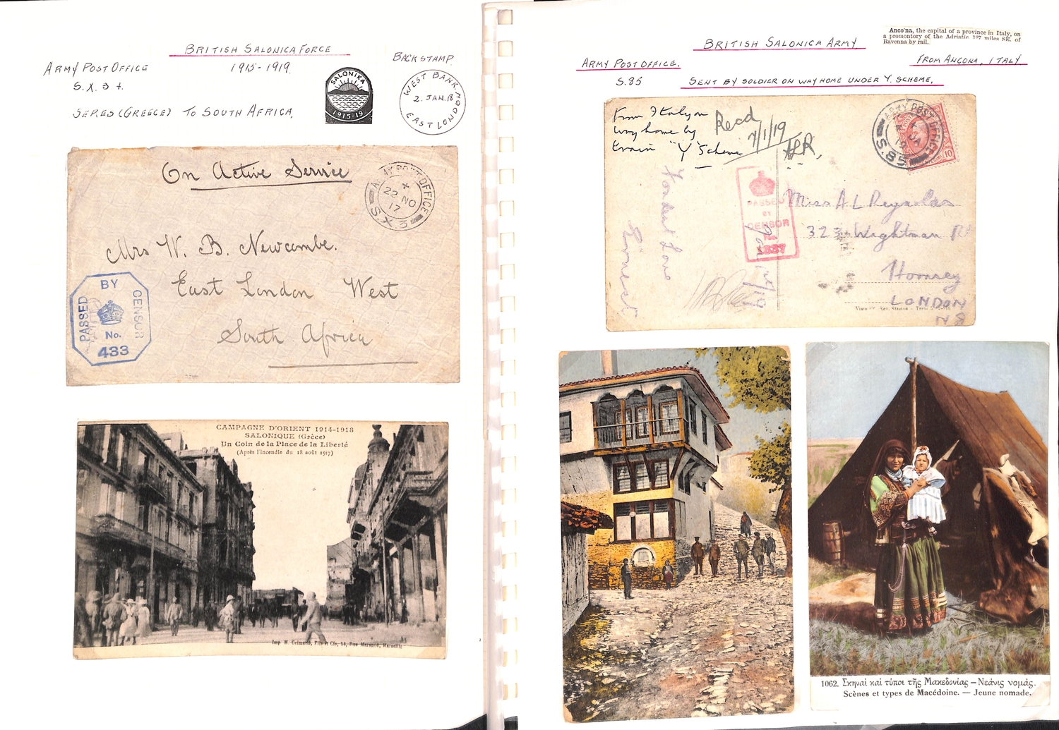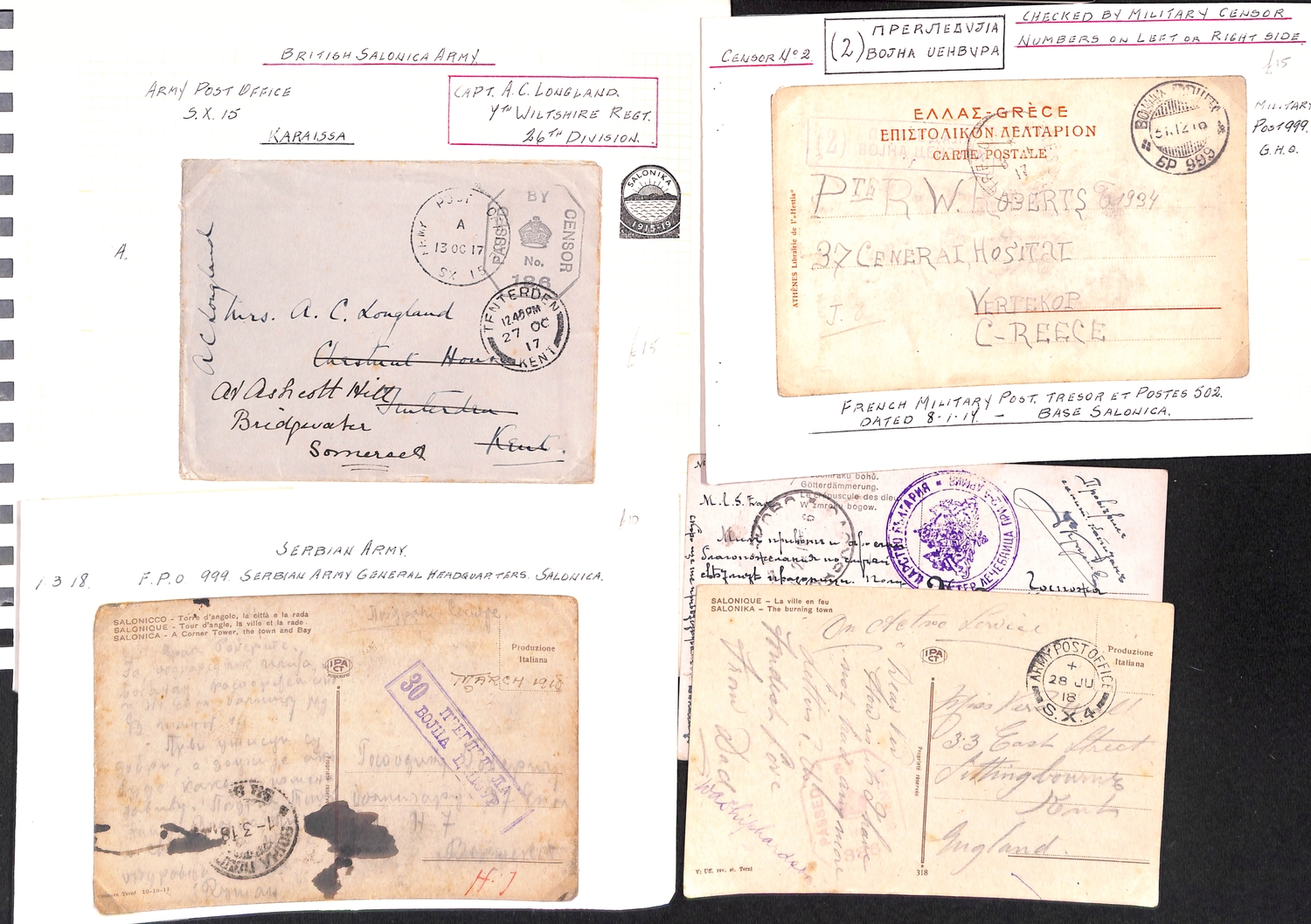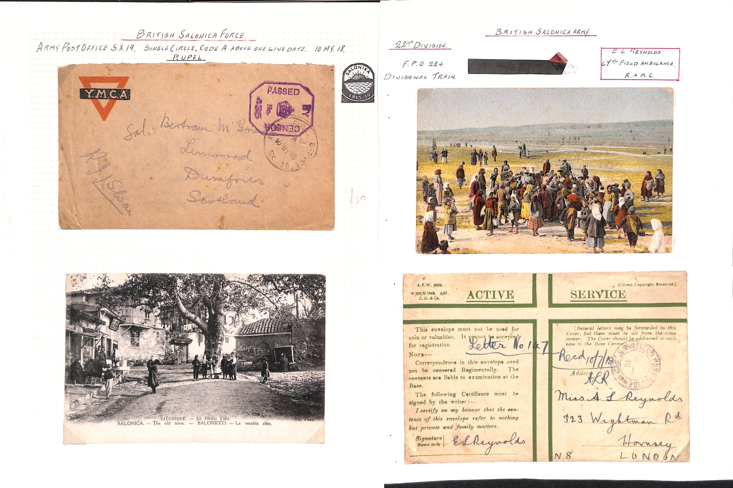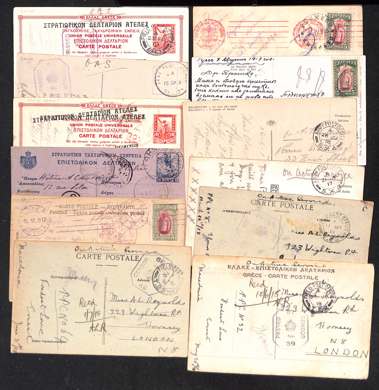 Russia/Salonica. 1917-19 Covers and cards including 1919 Greek 10L postcard overprinted for military use with F.P.O 80 c.d.s and stampless postcard with A.P.O SX 22 skeleton both from Batum; another 10L card overprinted for military use with double overprint variety, light F.P.O c.d.s but probably also from Batum; and other cards from Salonica, Serbian F.P.Os (2), Bulgarian forces, etc. (24).