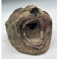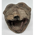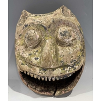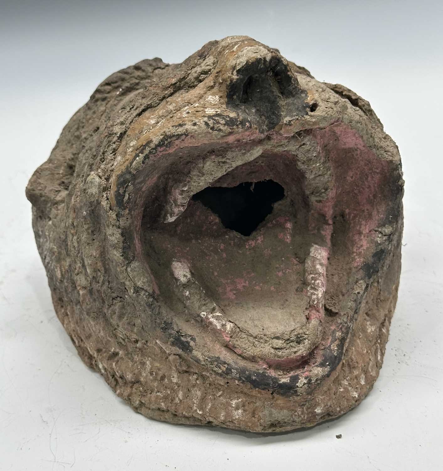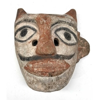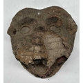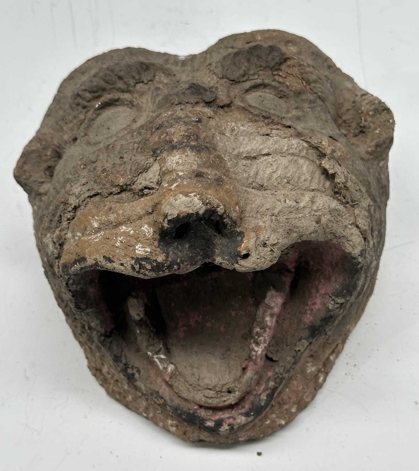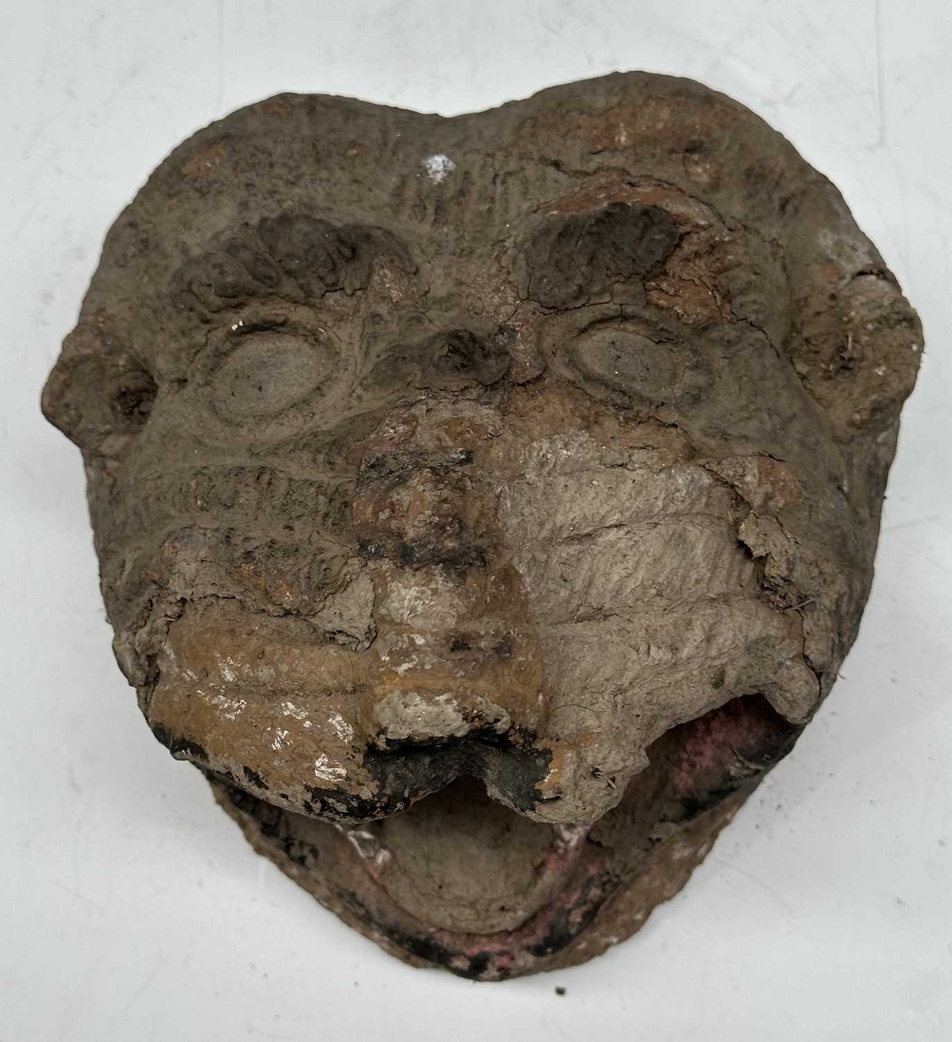 A tiger mask modelled with fierce staring eyes and open jaw, clay body with painted surface moulding, the mouth conceals a hole likely designed to accommodate a mounting pole, late 19th century/early 20th century, Terai district, Southern Nepal, 20 by 23cm Note: Bengal tigers, a real threat to Terai villages, have been incarnated through wearable masks or mounted on posts, functioning as deterrents.
