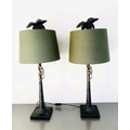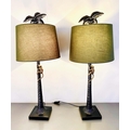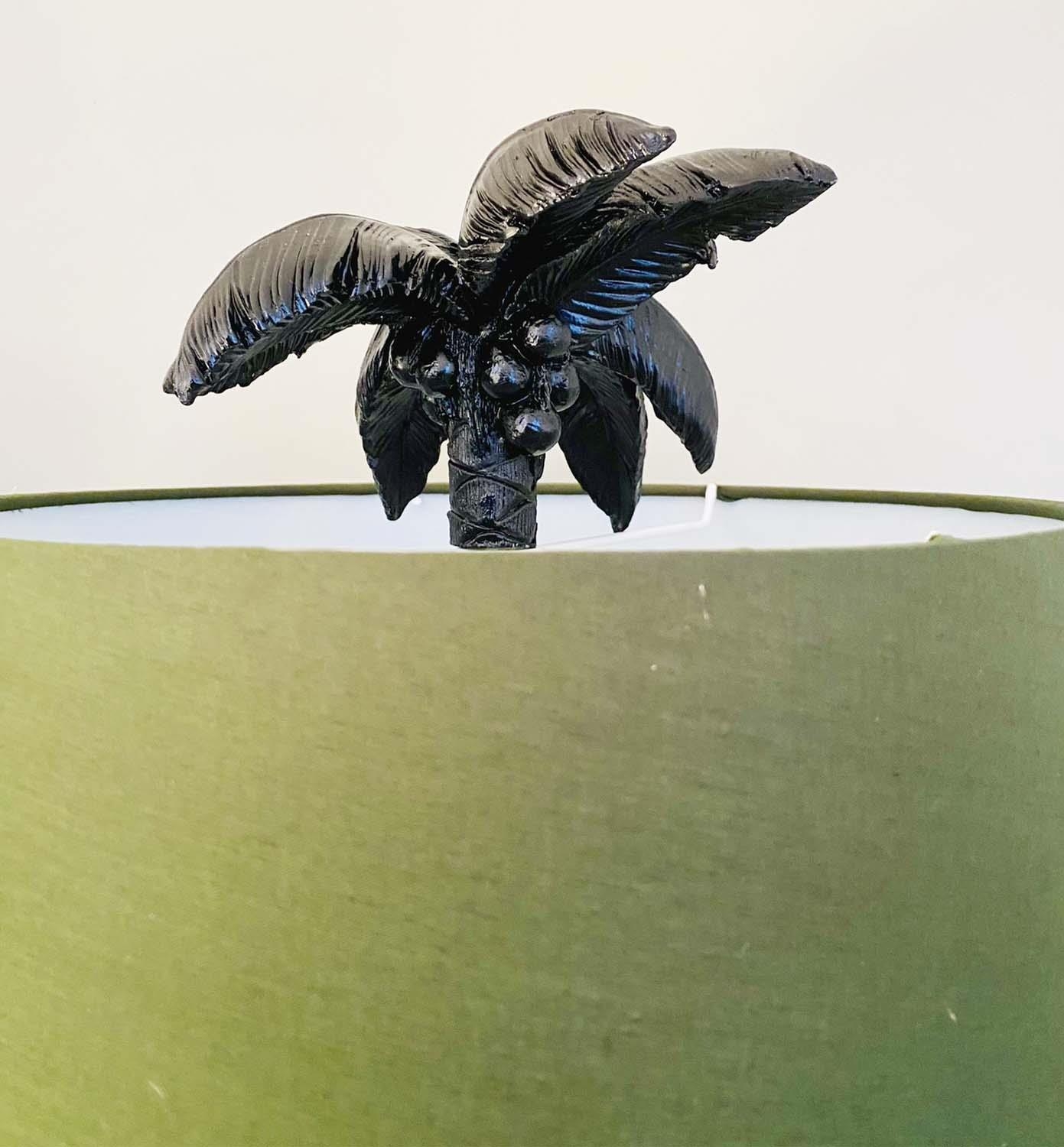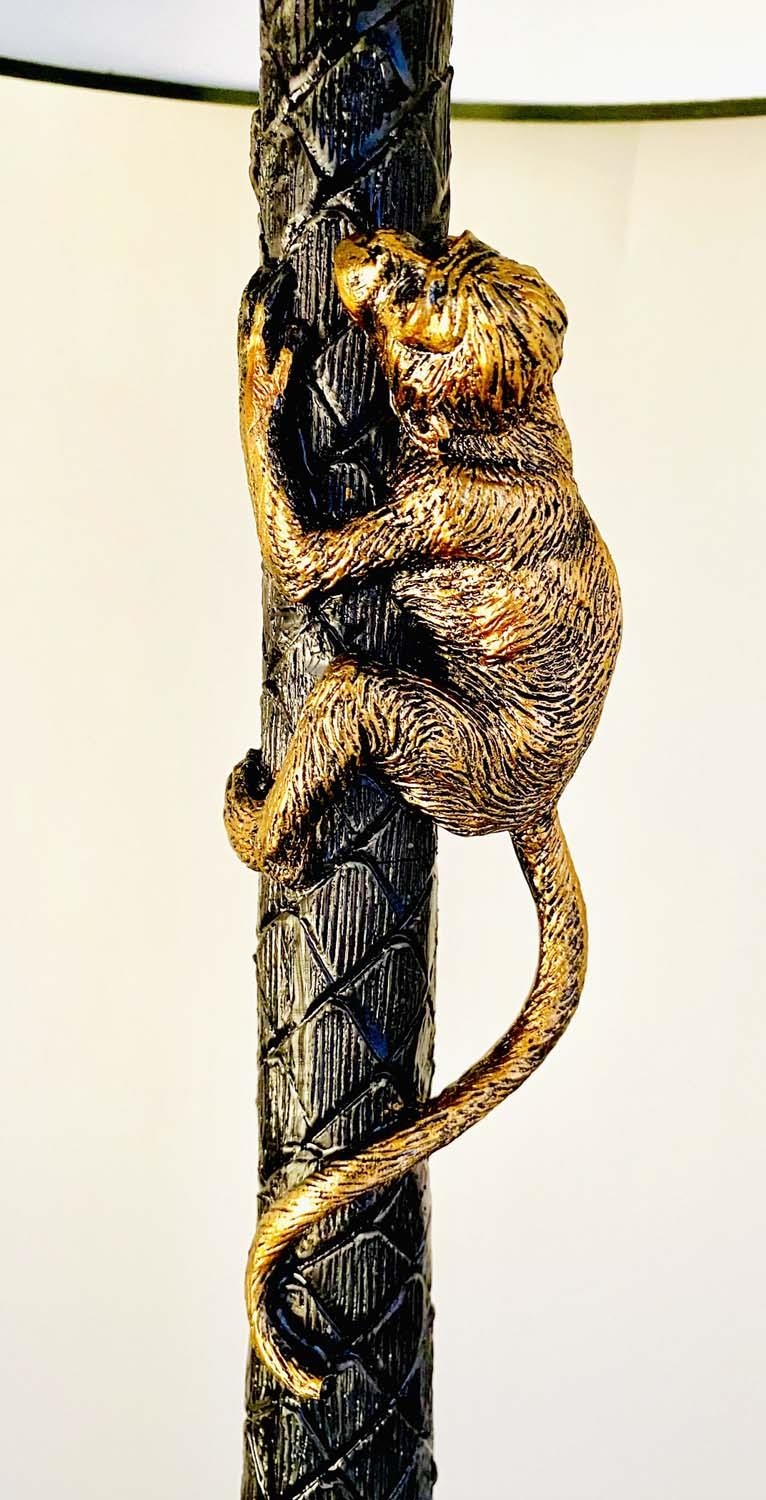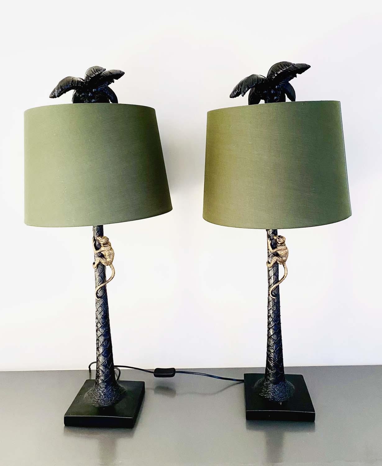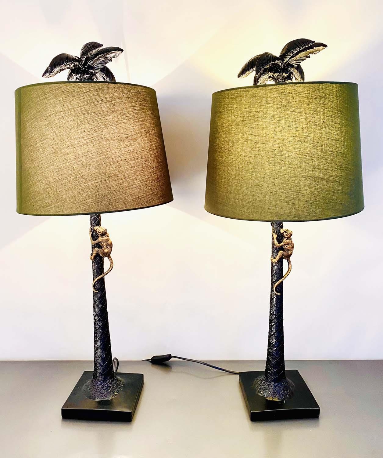 TABLE LAMPS, a pair, in the form of monkeys climbing palm trees, with shades, 84cm x 56cm x 56cm. (2)