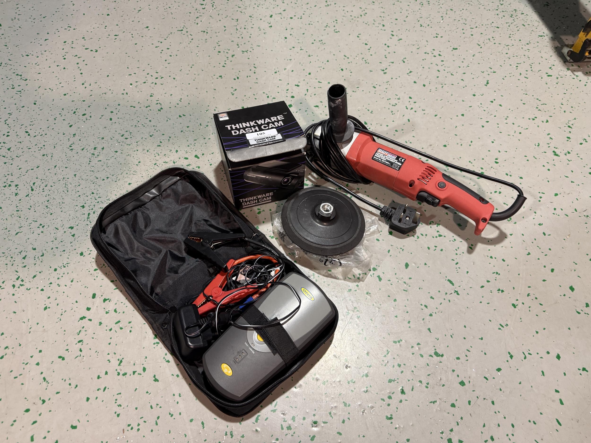 A Sealey 150mm variable speed polisher, a Thingware Dashcam and a Ring booster starter