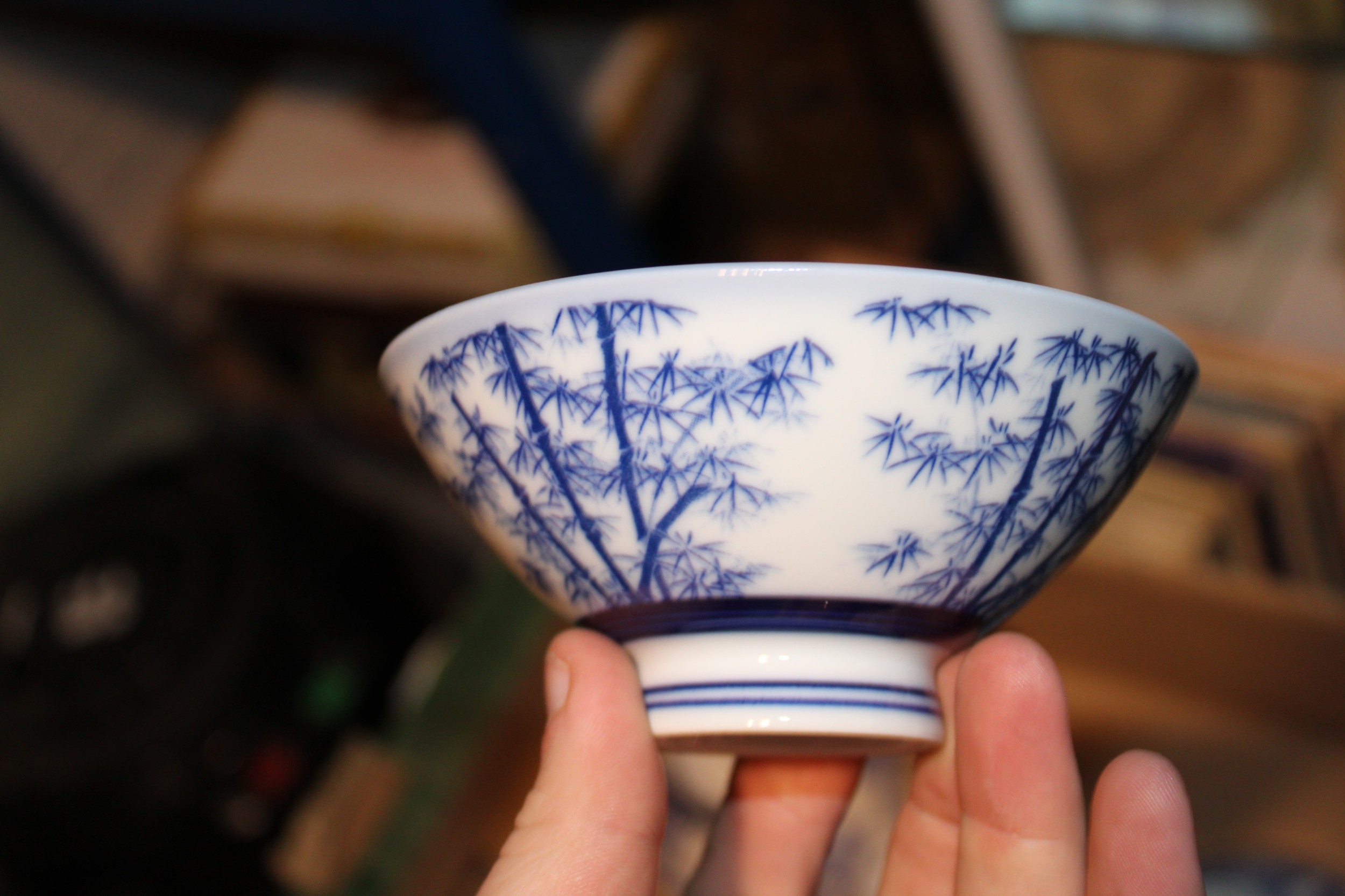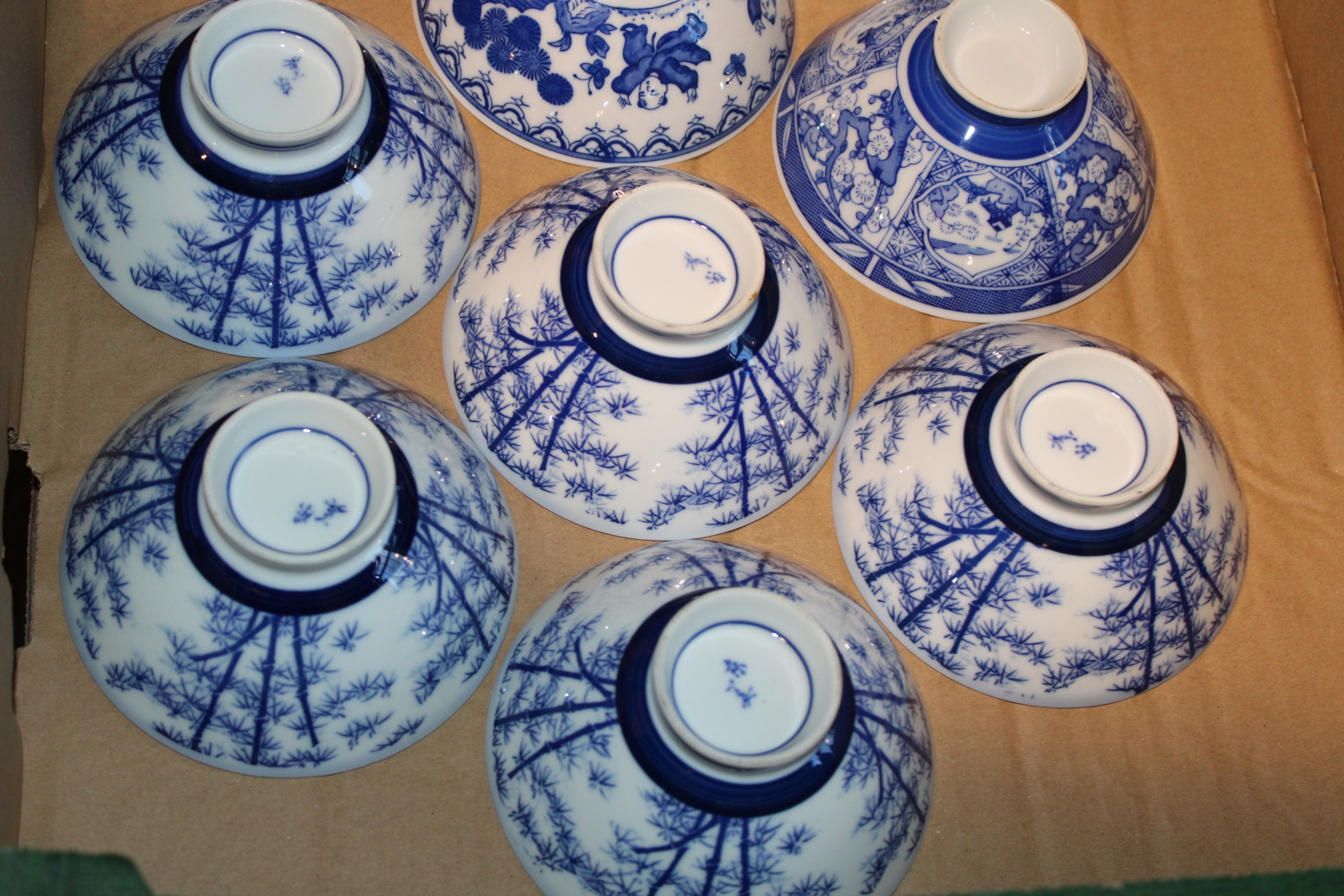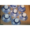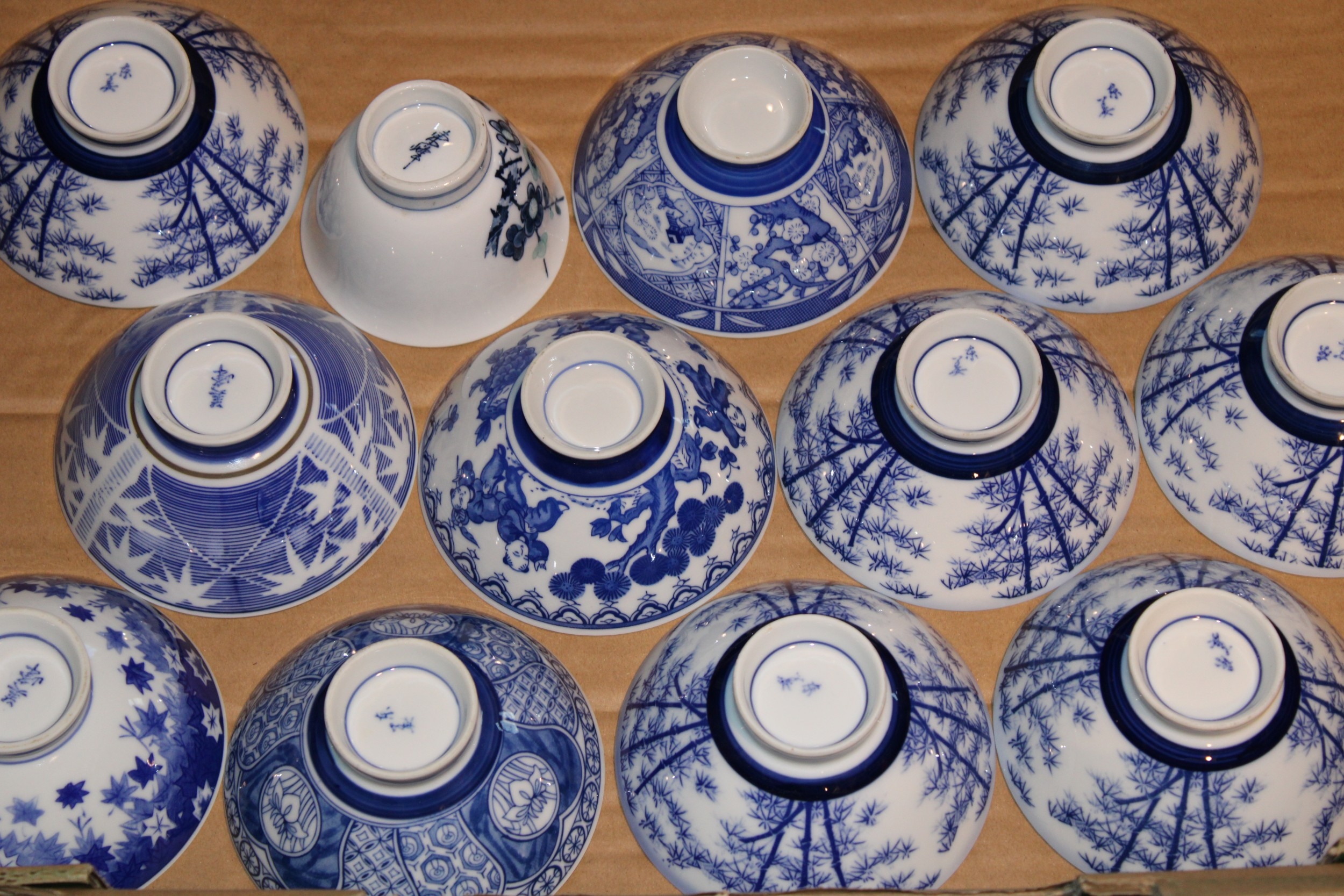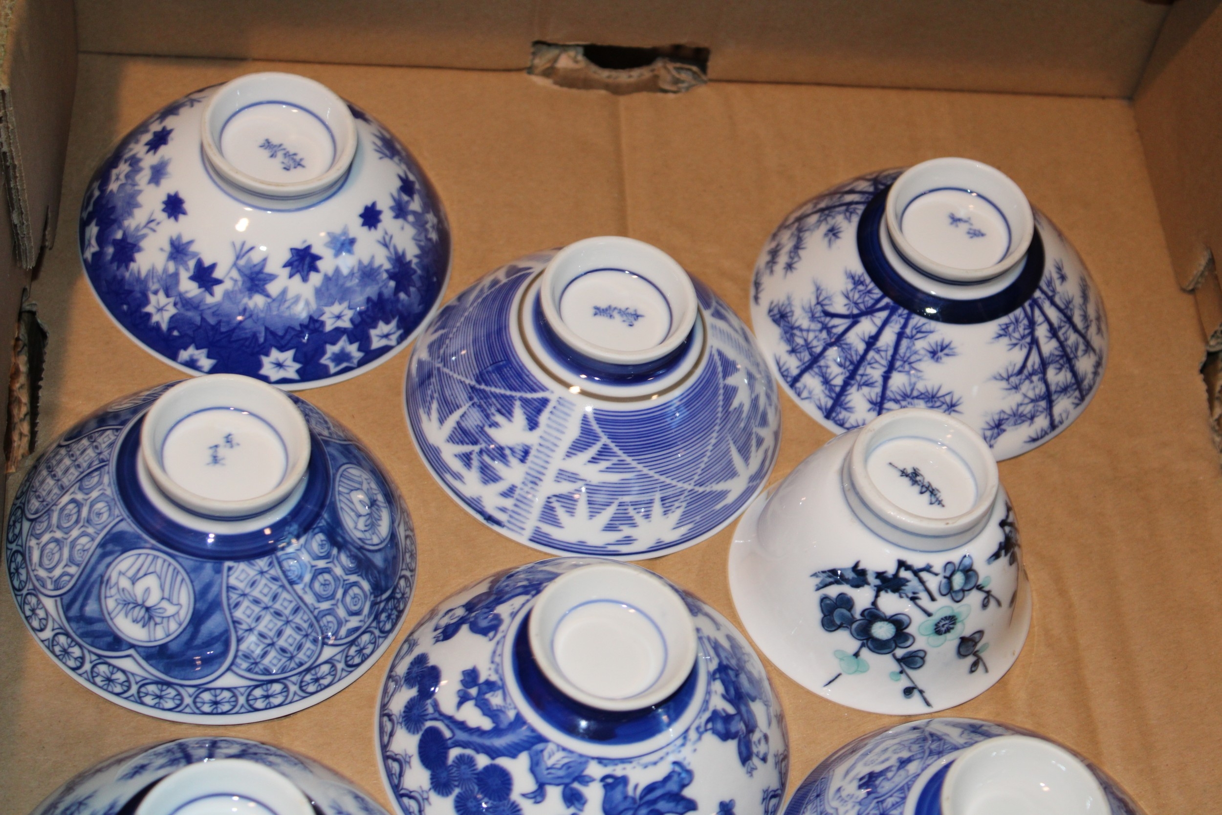 Set of eleven Japanese blue and white rice bowls, together with a sake cup, (12).