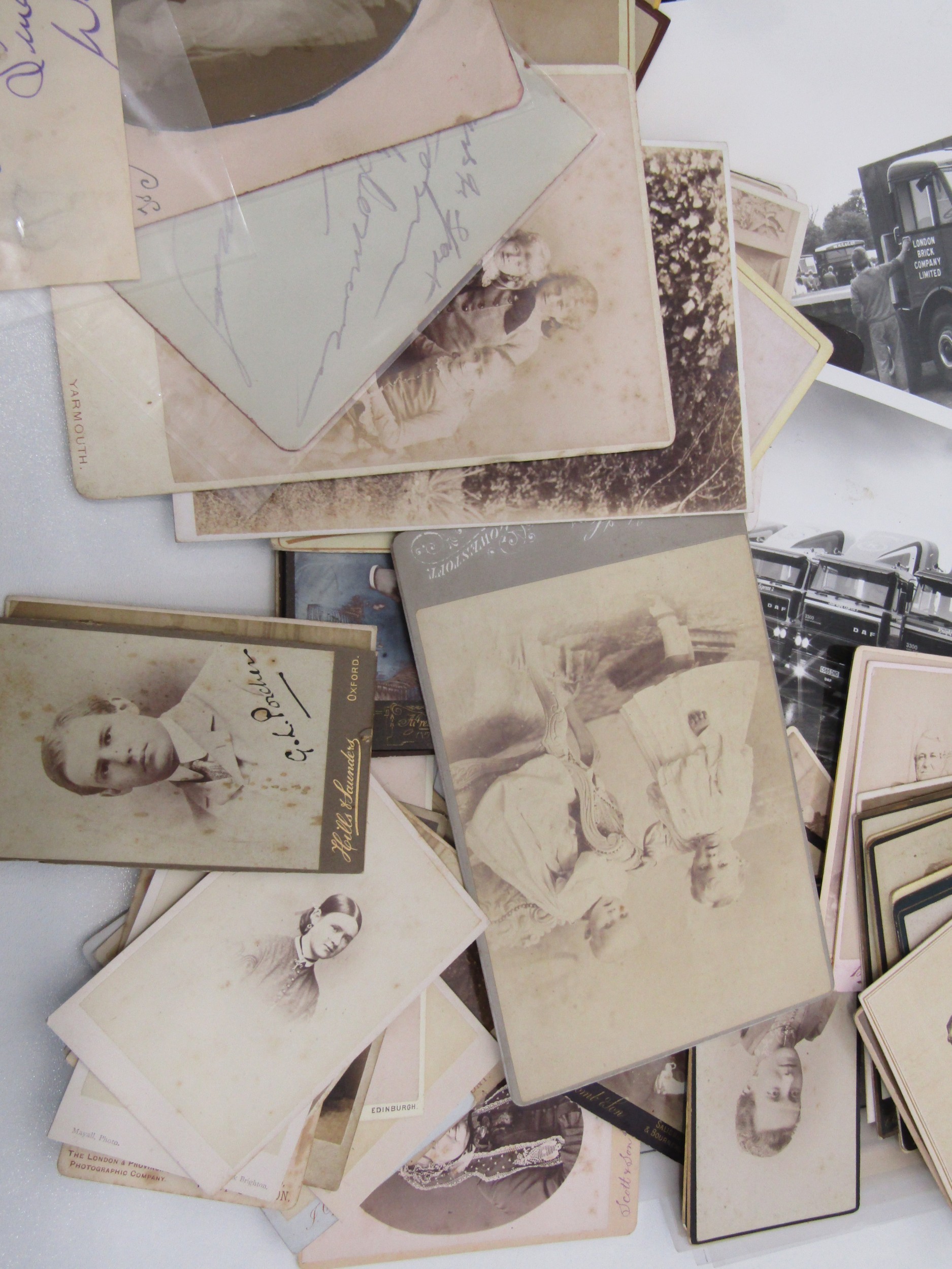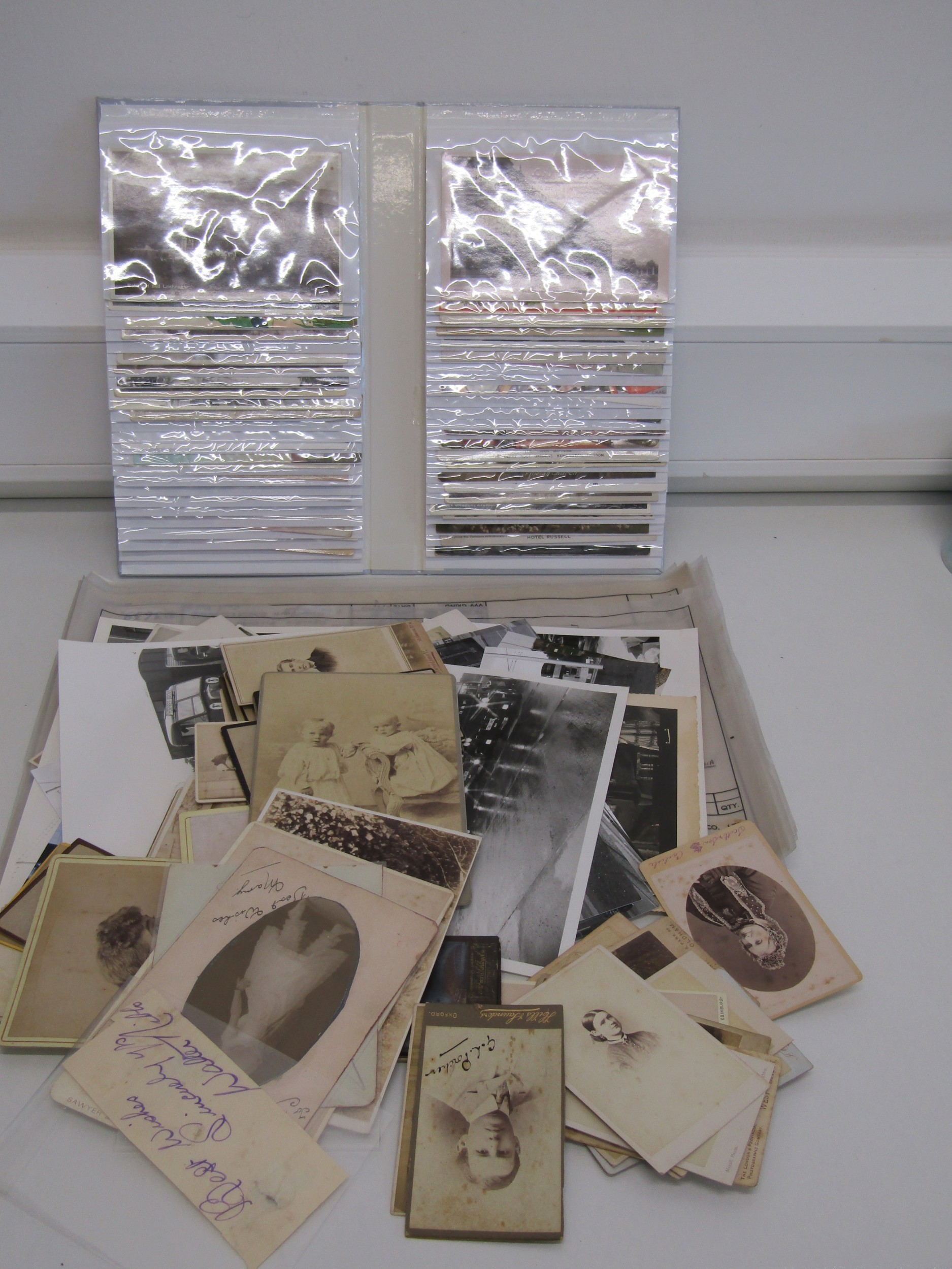 Tray of various ephemera including a full Postcard album, Photograph's, Victorian cabinet cards, Autograph's, Engineering etc.