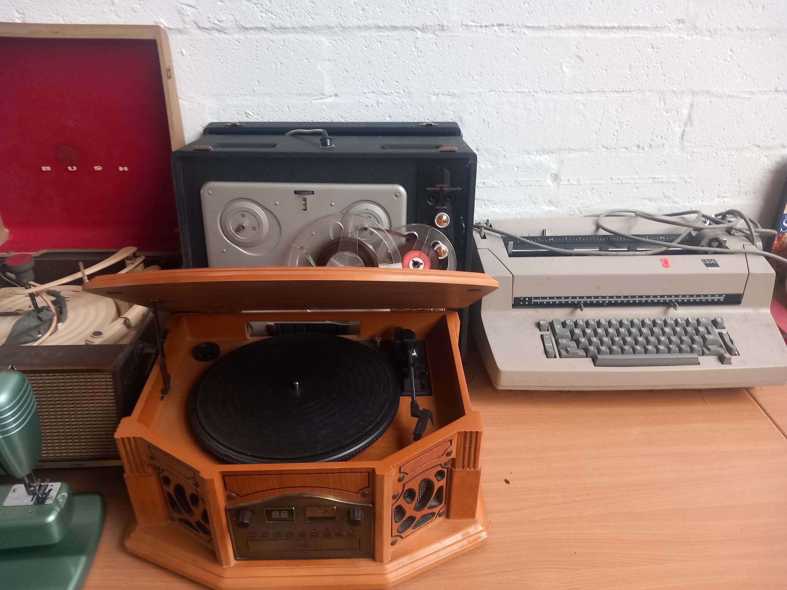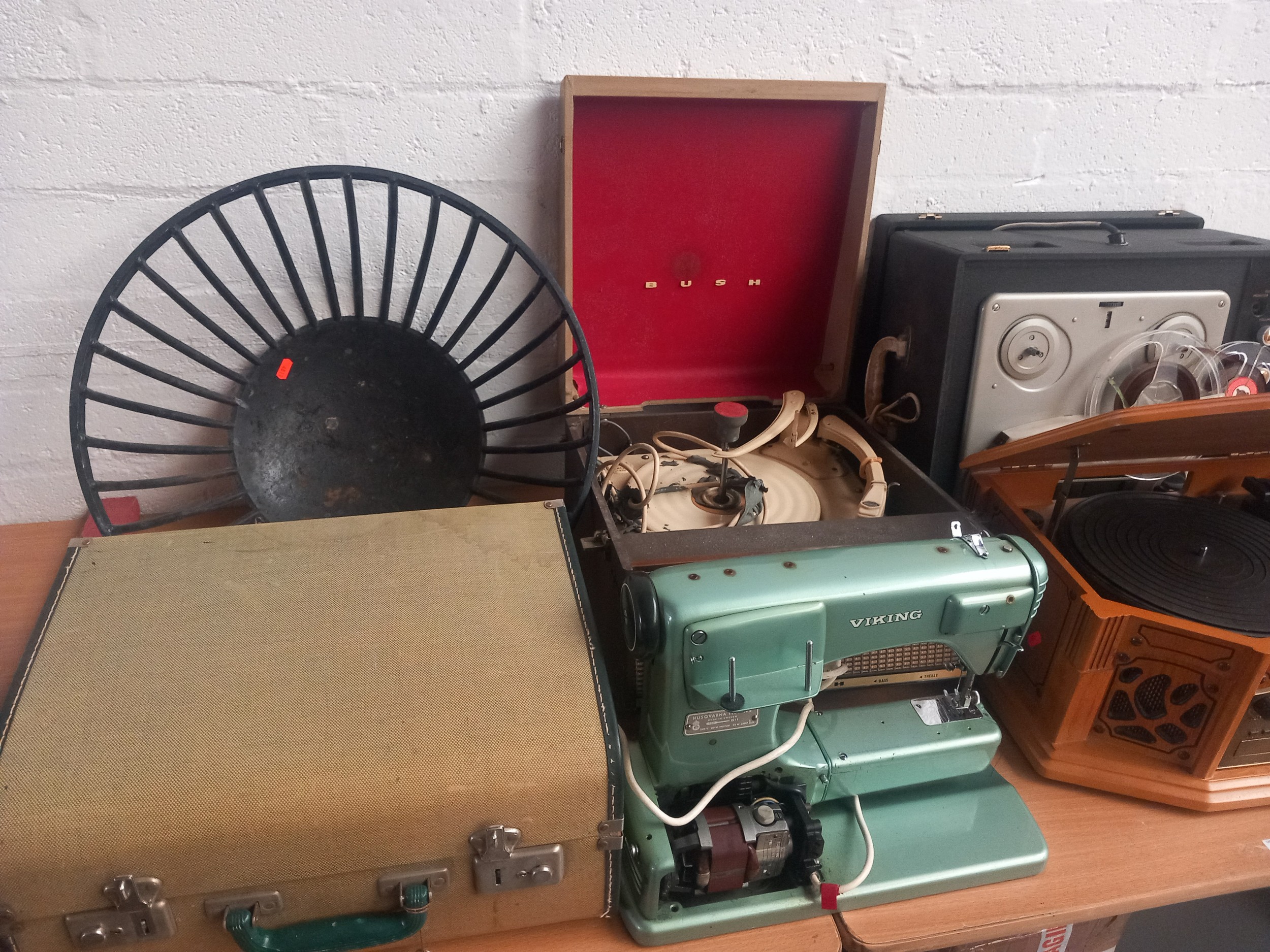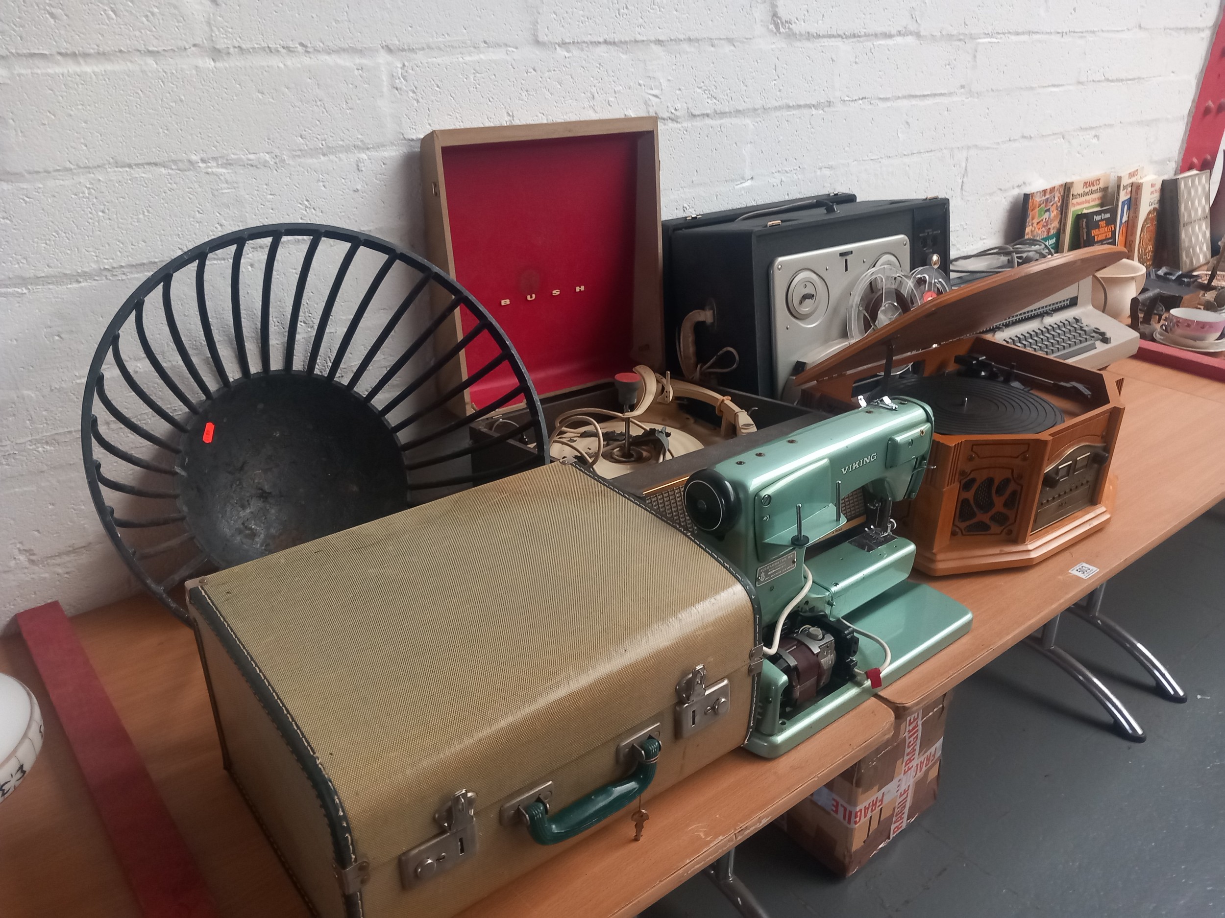 Vintage reel to reel tape, sewing machine, typewriter, record players etc
