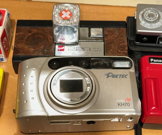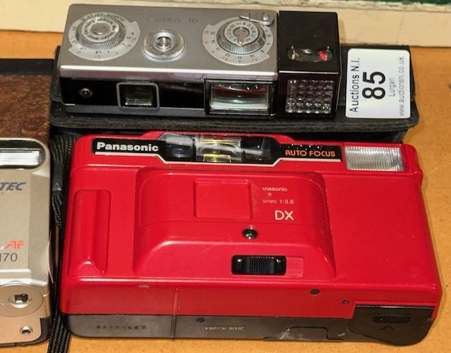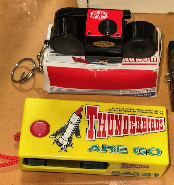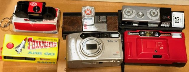 6 x Vintage Cameras - 1993 Thunderbirds, Boxed Kinon Kitkat Micro 110, Gaf 220 Pocket Camera, Pretec Zoom KH70, Panasonic DX & Exida 16 In Case