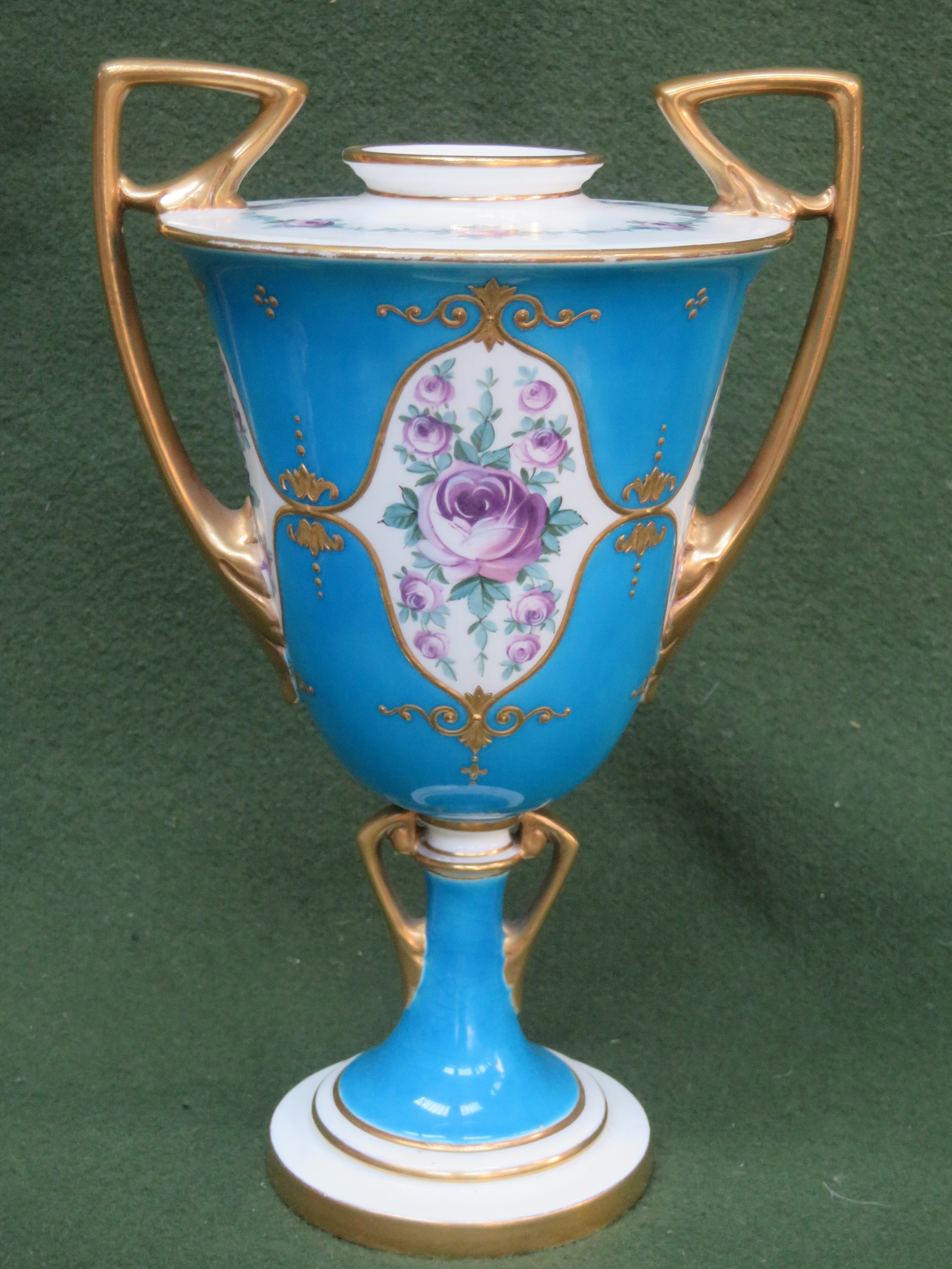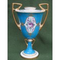 Mintons decorative gilded two handled urn, decorated with floral panels. Approx. 26cms High
