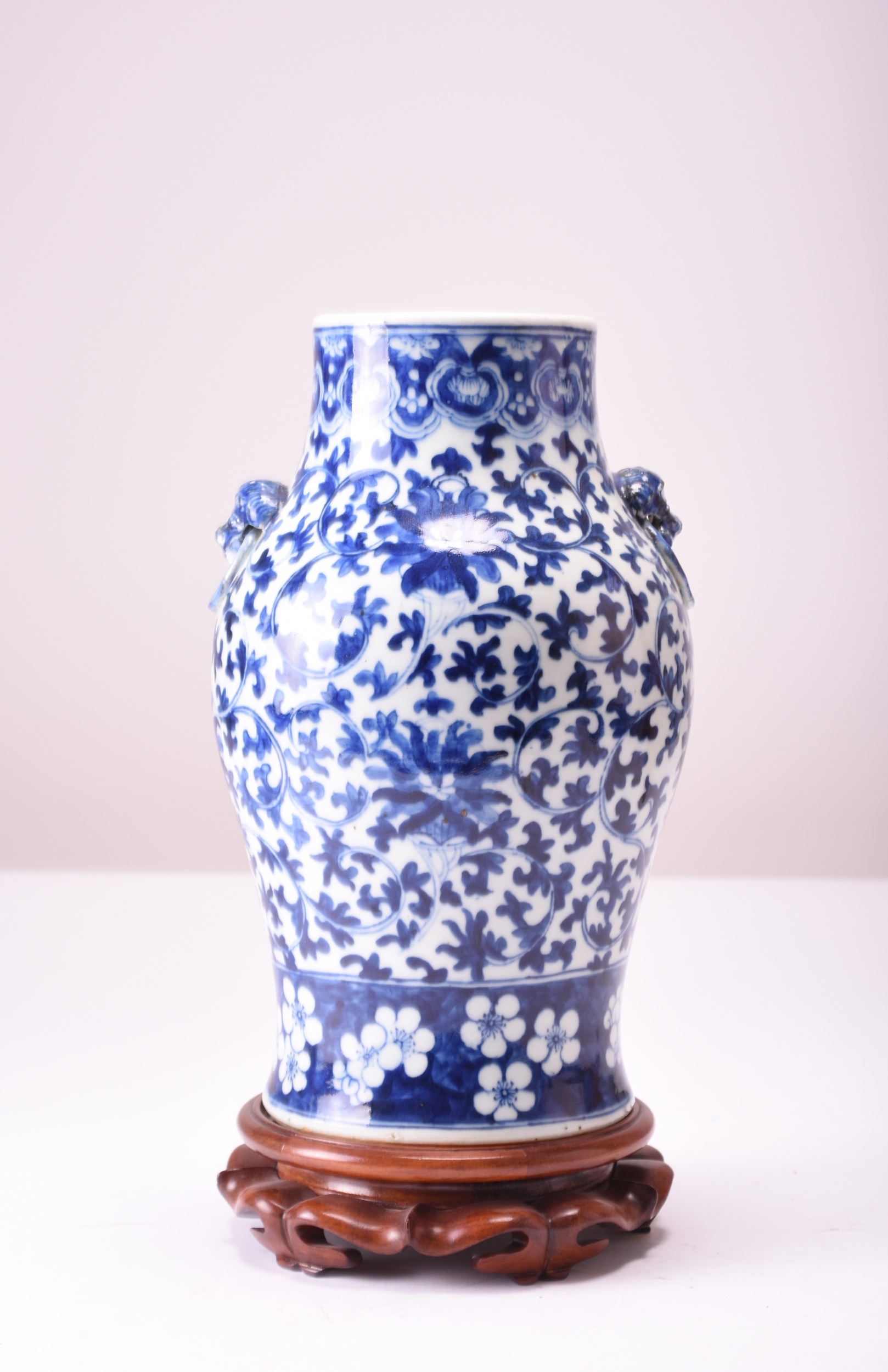 A Chinese blue and white vase, 18th/19th century Of ovoid form with twin lion-head handles, decorated with lotus flowers and scrolling foliage, with associated hardwood stand. 30cm high