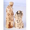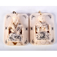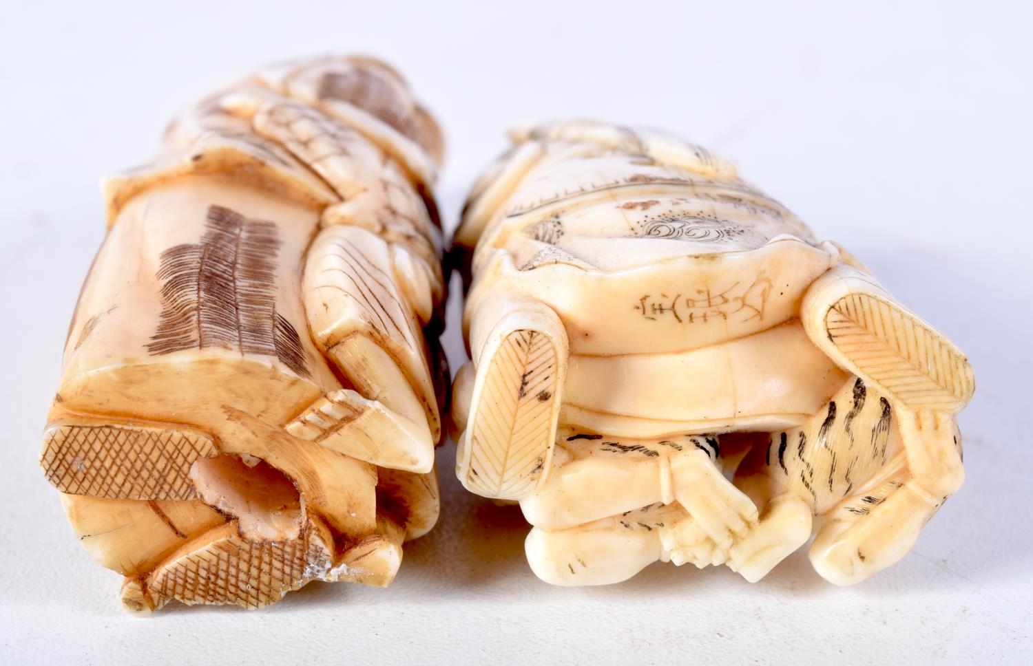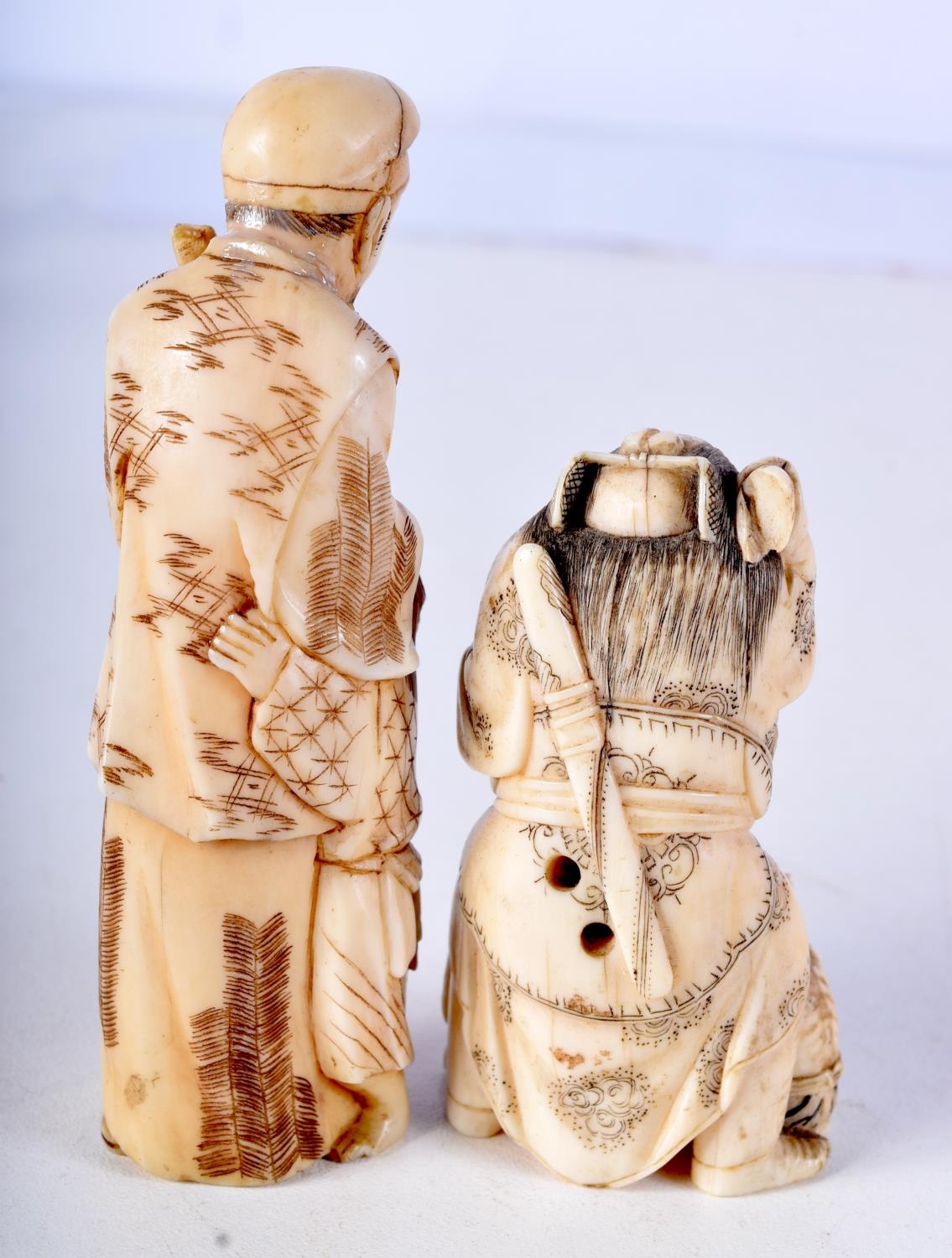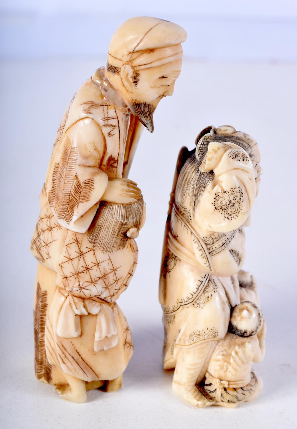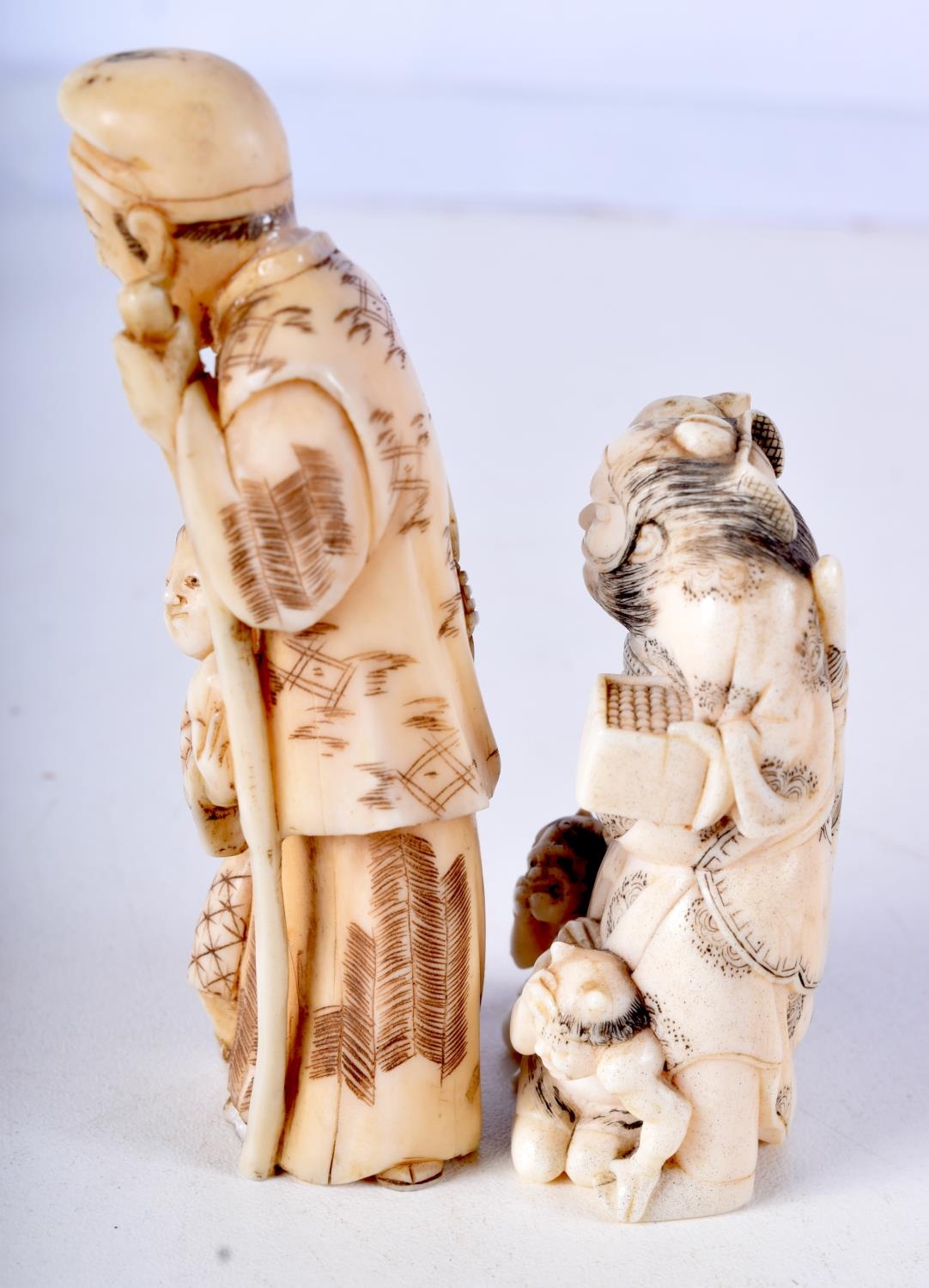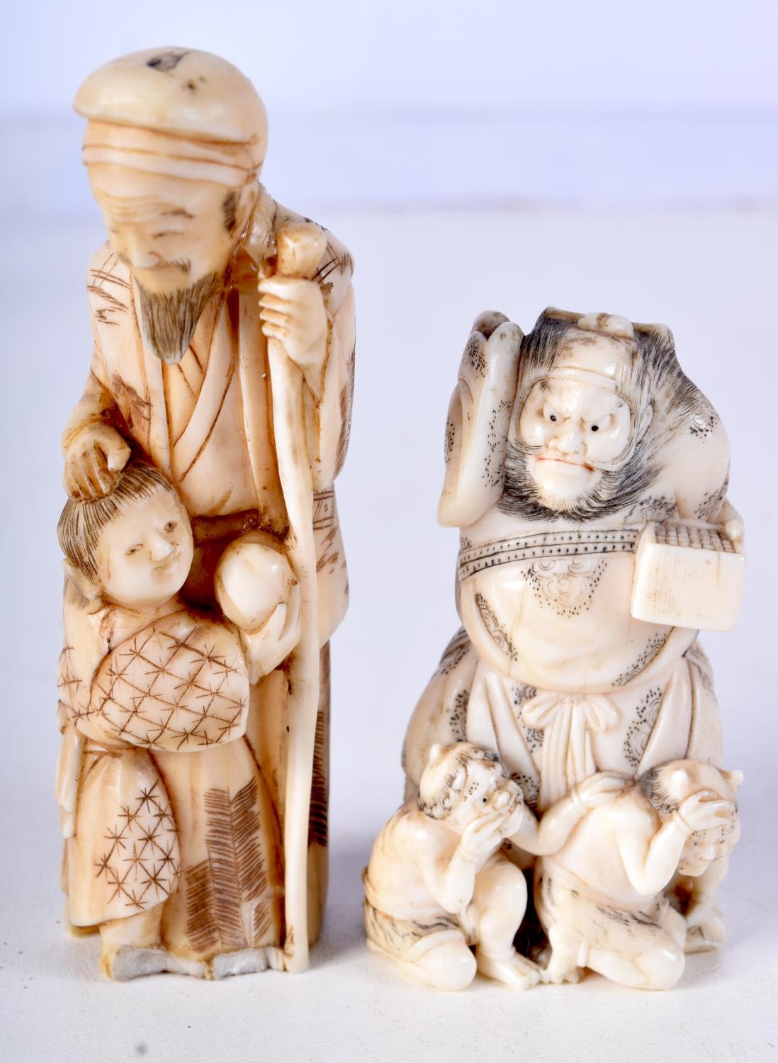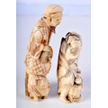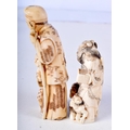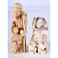 A 19TH CENTURY JAPANESE MEIJI PERIOD CARVED IVORY NETSUKE together with a larger okimono. Largest 8 cm high. (2)