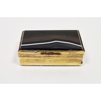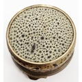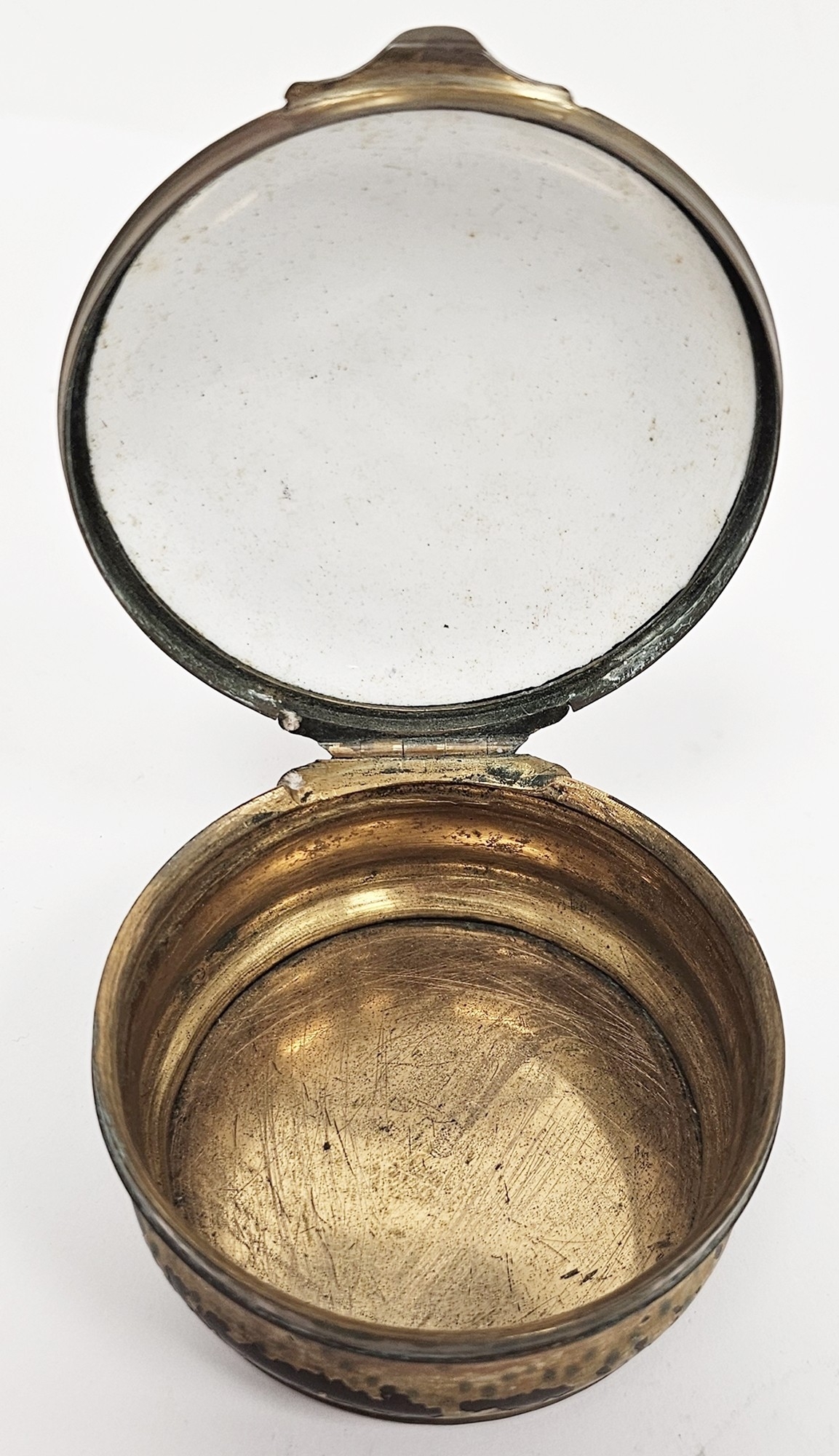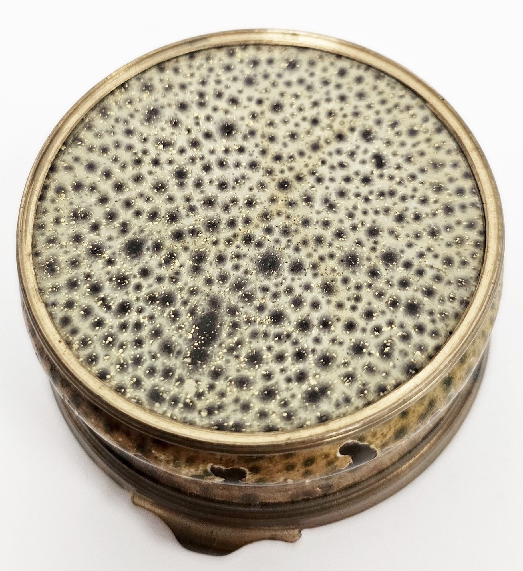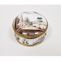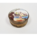 Staffordshire enamel and gilt-metal mounted snuff-box, 18th century, the cover decorated in the German style with a traveller before buildings in river landscape, the box in simulated shagreen, 6 cm diam.