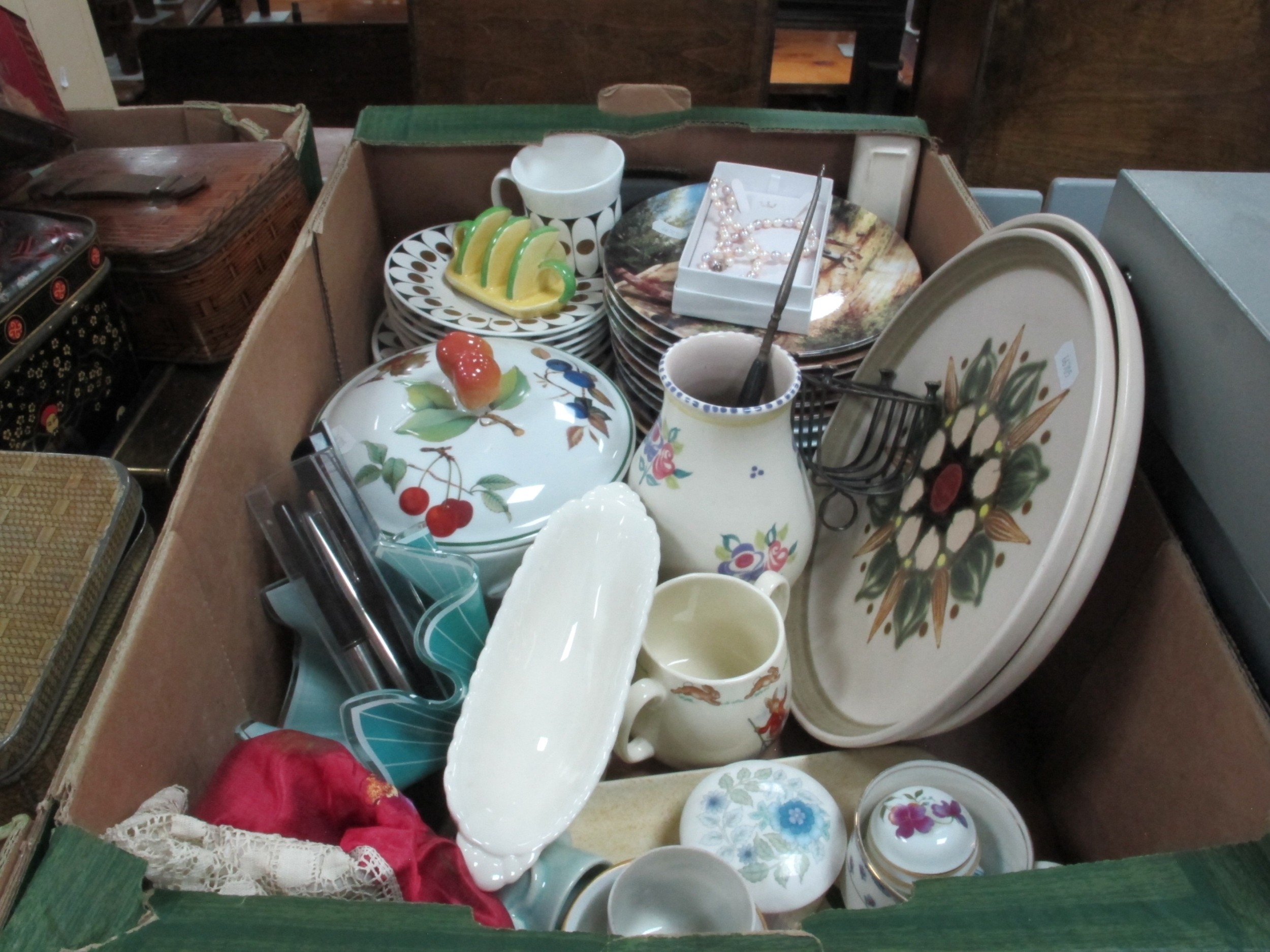 Ypres Table Cover, necklace set, glass handkerchief vase, toast rack, ink pens, Carlton toast rack, Poole, Denby, Wedgwood, together ceramics, etc:- One Box.