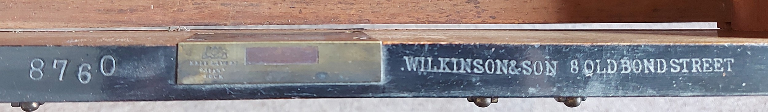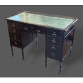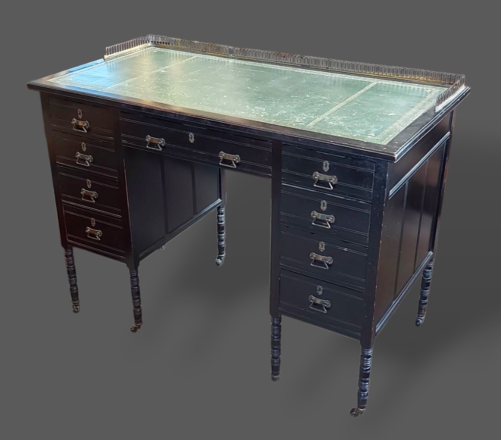 A Victorian ebonised writing desk by Wilkinson and Son, 8, Old Bond Street, London, the brass galleried back above a tooled leather writing surface and nine drawers with brass handles raised upon turned legs, 107cms wide, 55cms deep and 76cms tall