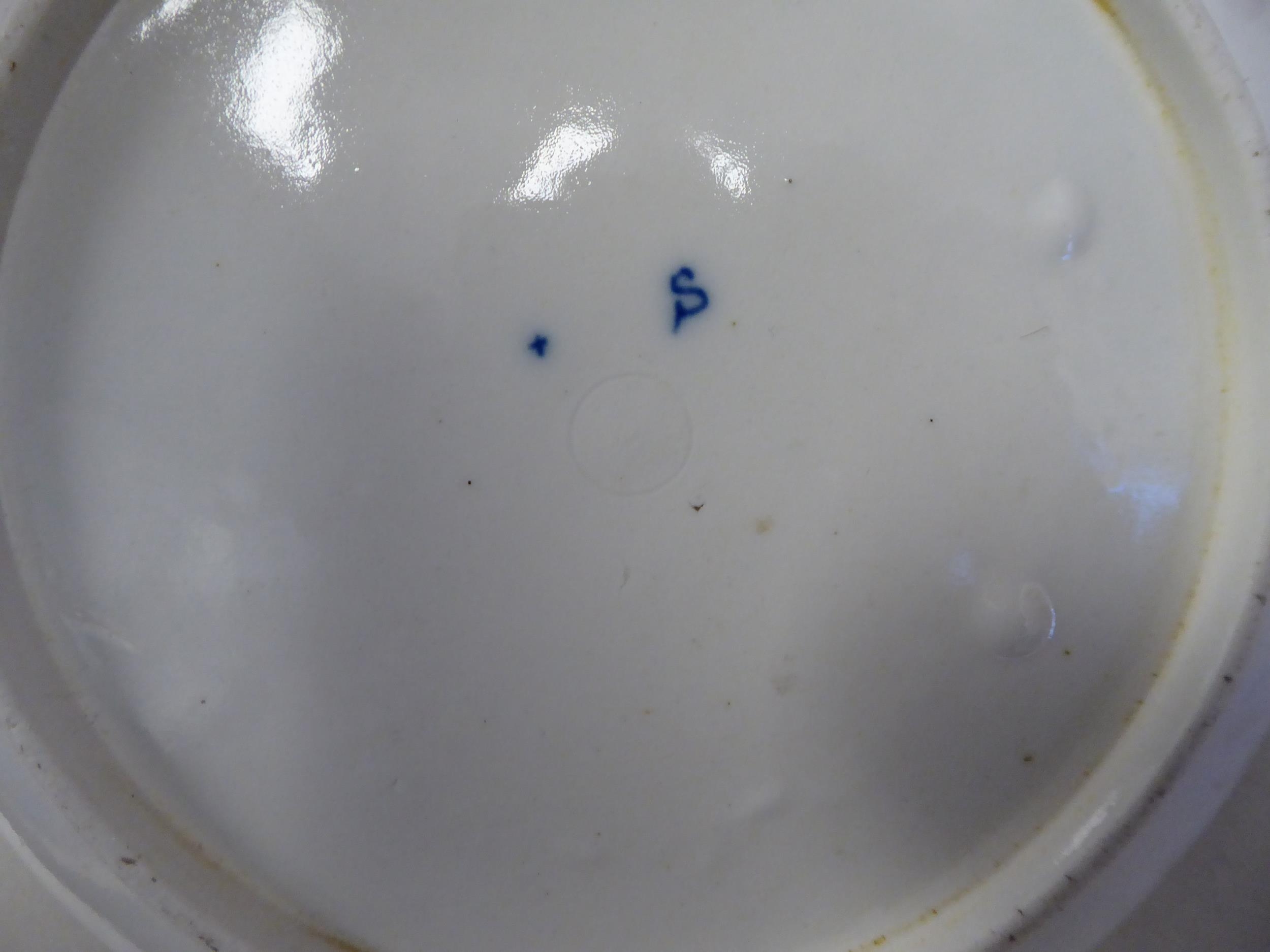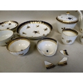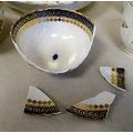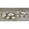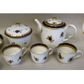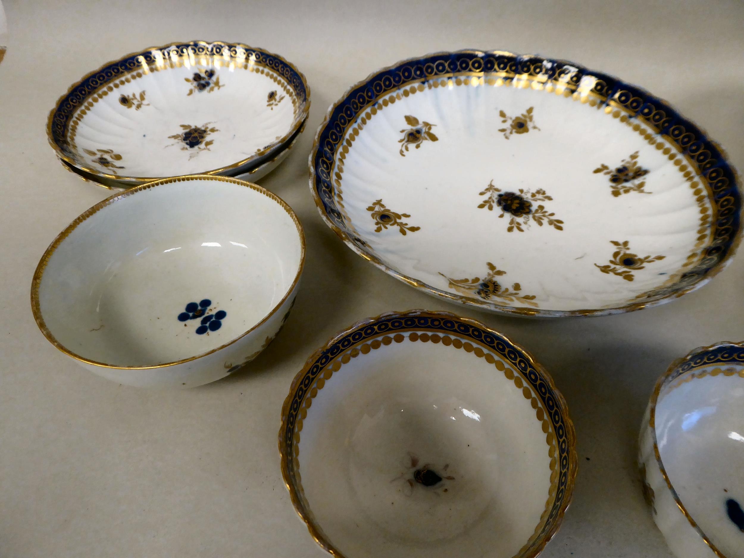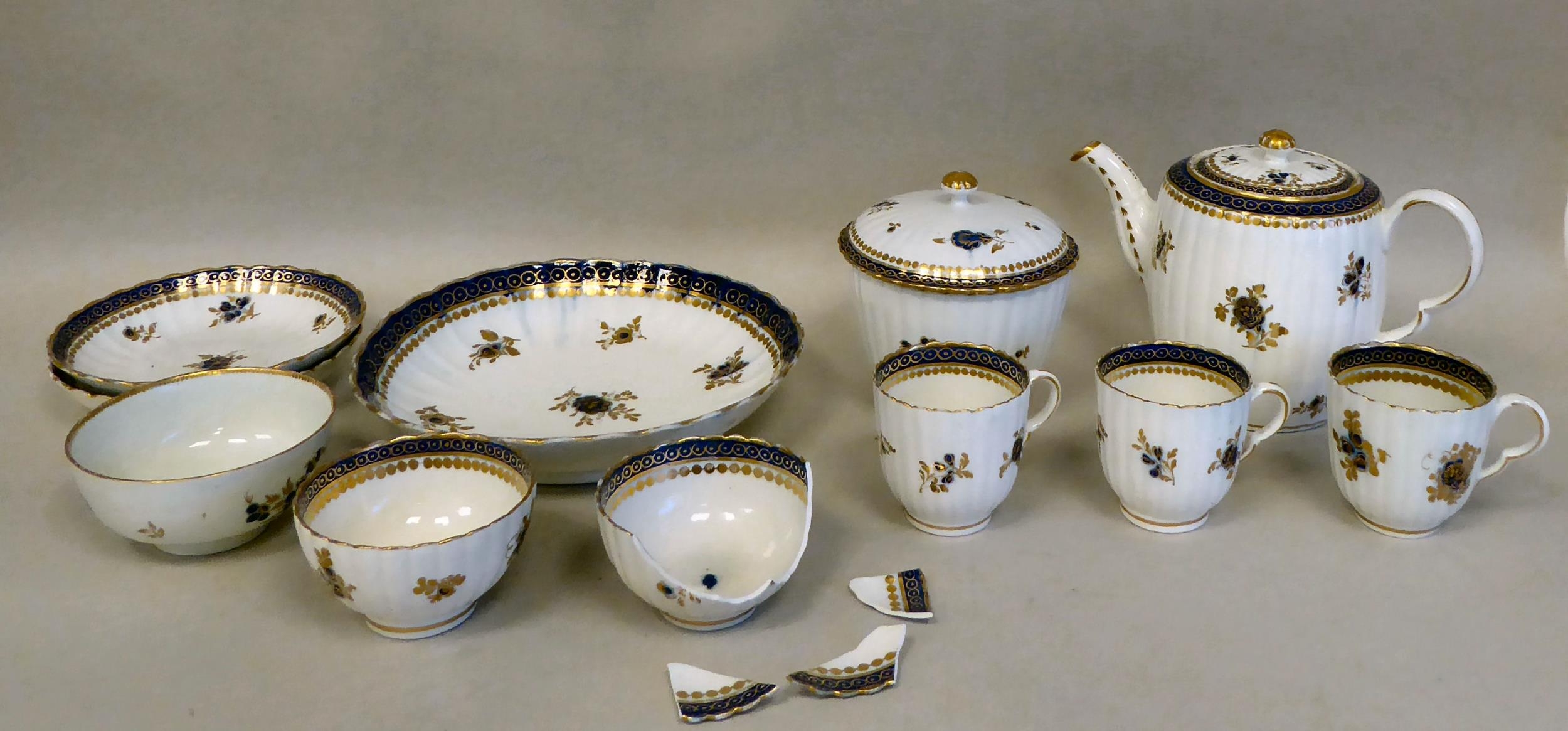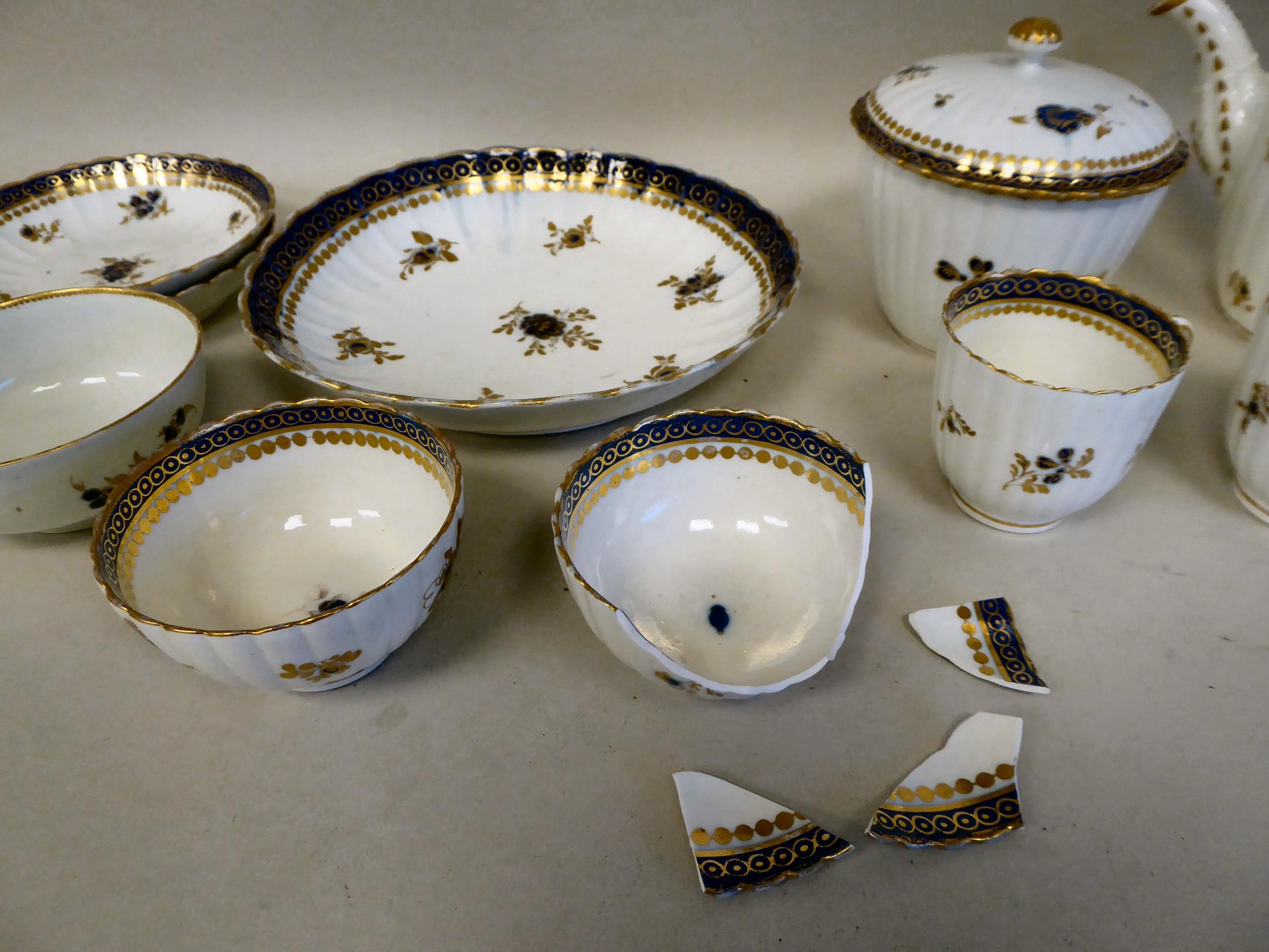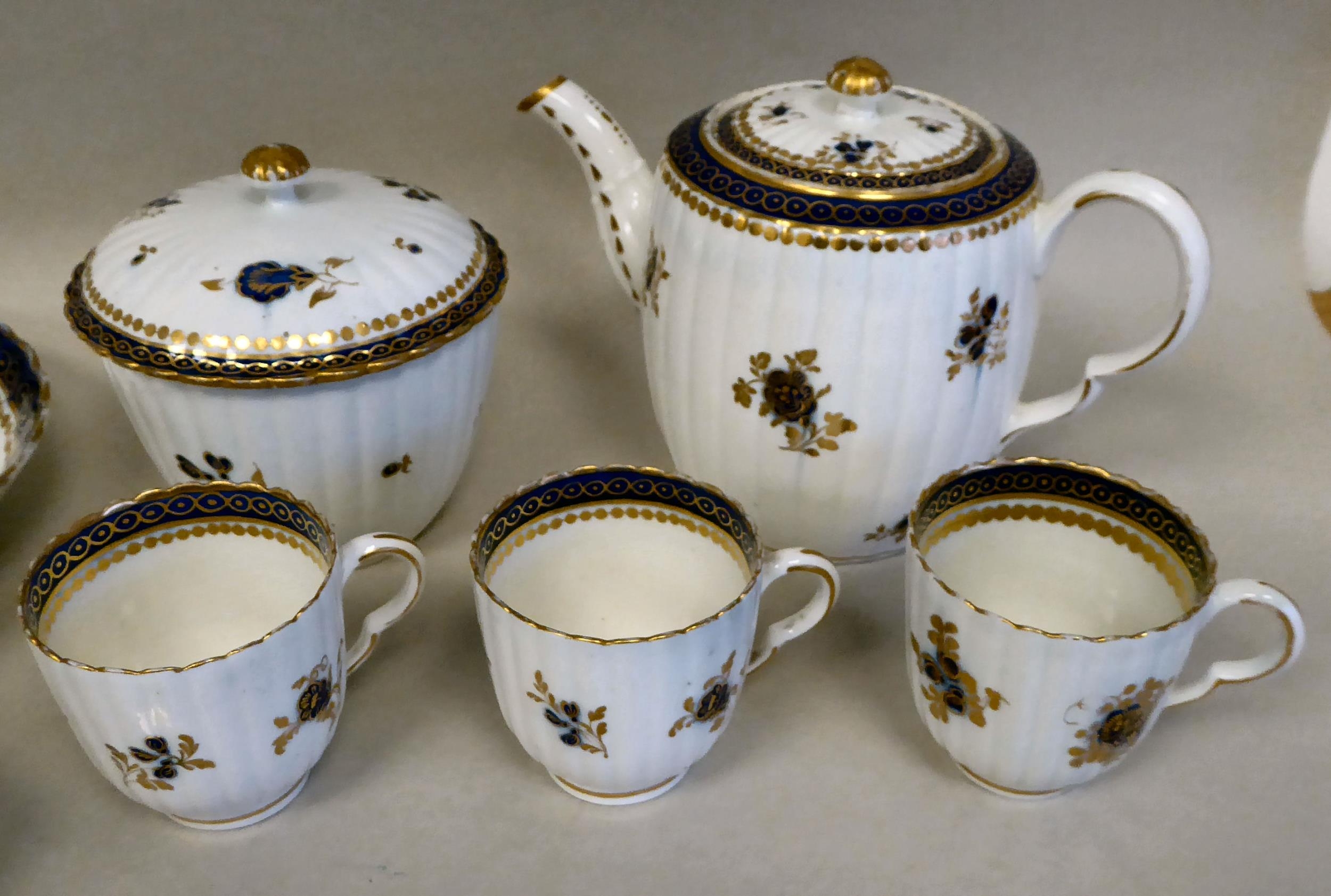 Late 18thC Caughley porcelain teaware, decorated in gilded blue and white with floral sprigs and other ornament comprising a teapot, a covered sucriere, tea bowls and saucers, a plate 8"dia and two small bowls