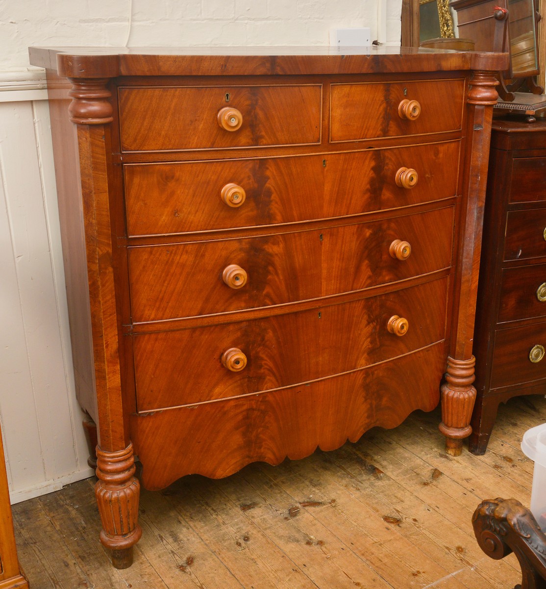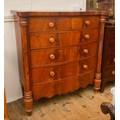 A North Country Cuban Flame Veneered Bow Fronted & Pillared Chest of Drawers. Measuring: 130cms across x 53cms deep x 134cms high.