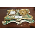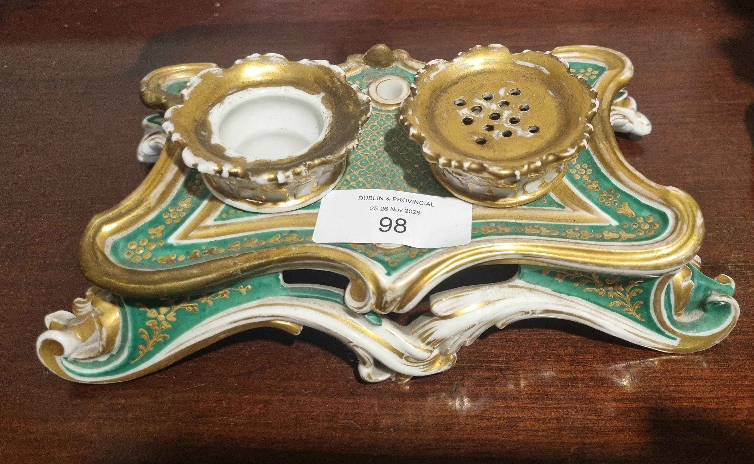 Elaborate porcelain ink stand in gilt and turquoise tones with ornate scrollwork and twin pots, attributed to Joseph Petit, Paris, 19th century. 8 cm. high; 20 cm. wide; 12 cm. deep PORCELAIN Tuesday 25th November 2025 11:03:03