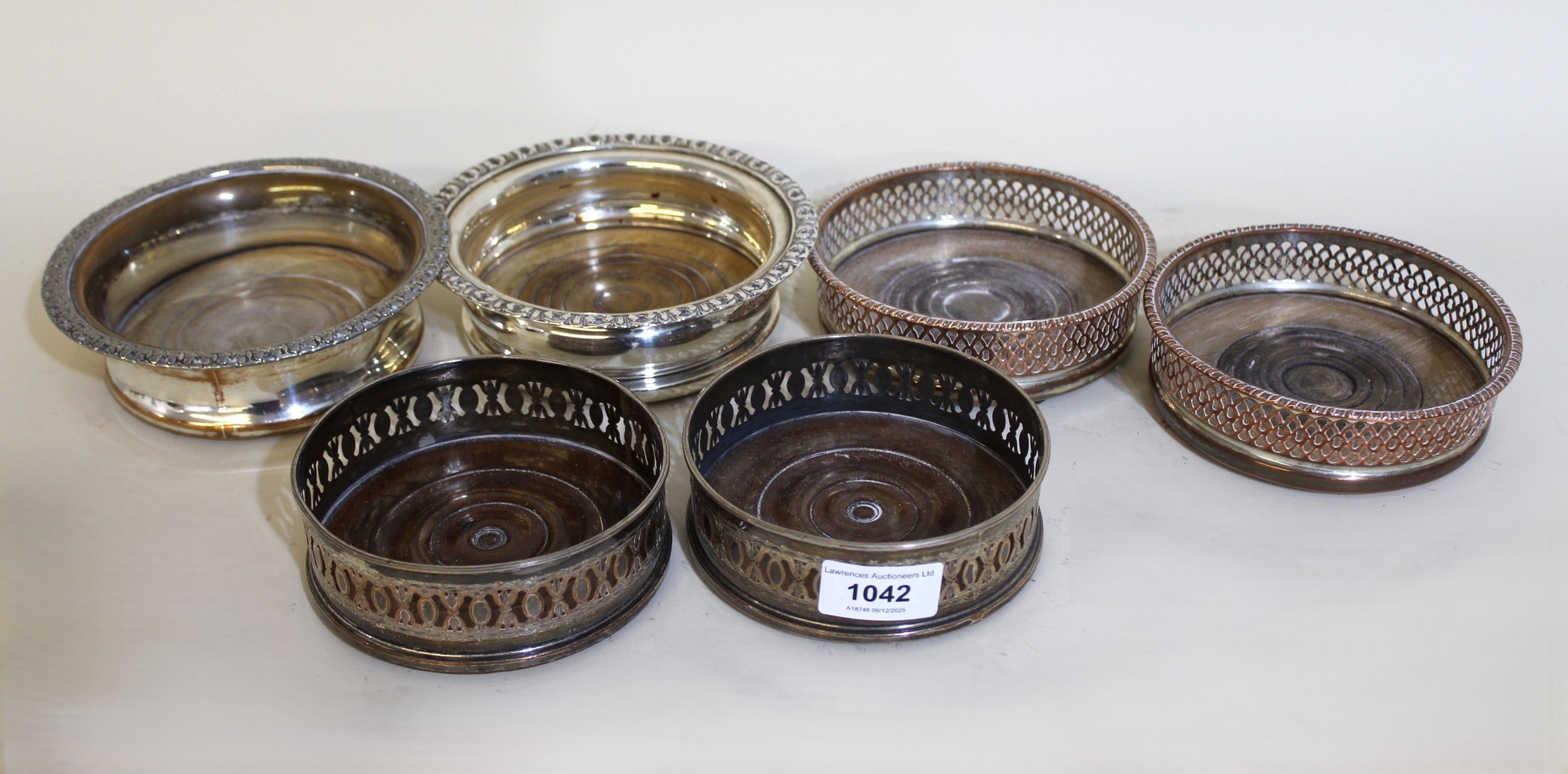 Two pairs of 19th Century plate on copper bottle coasters, together with two similar