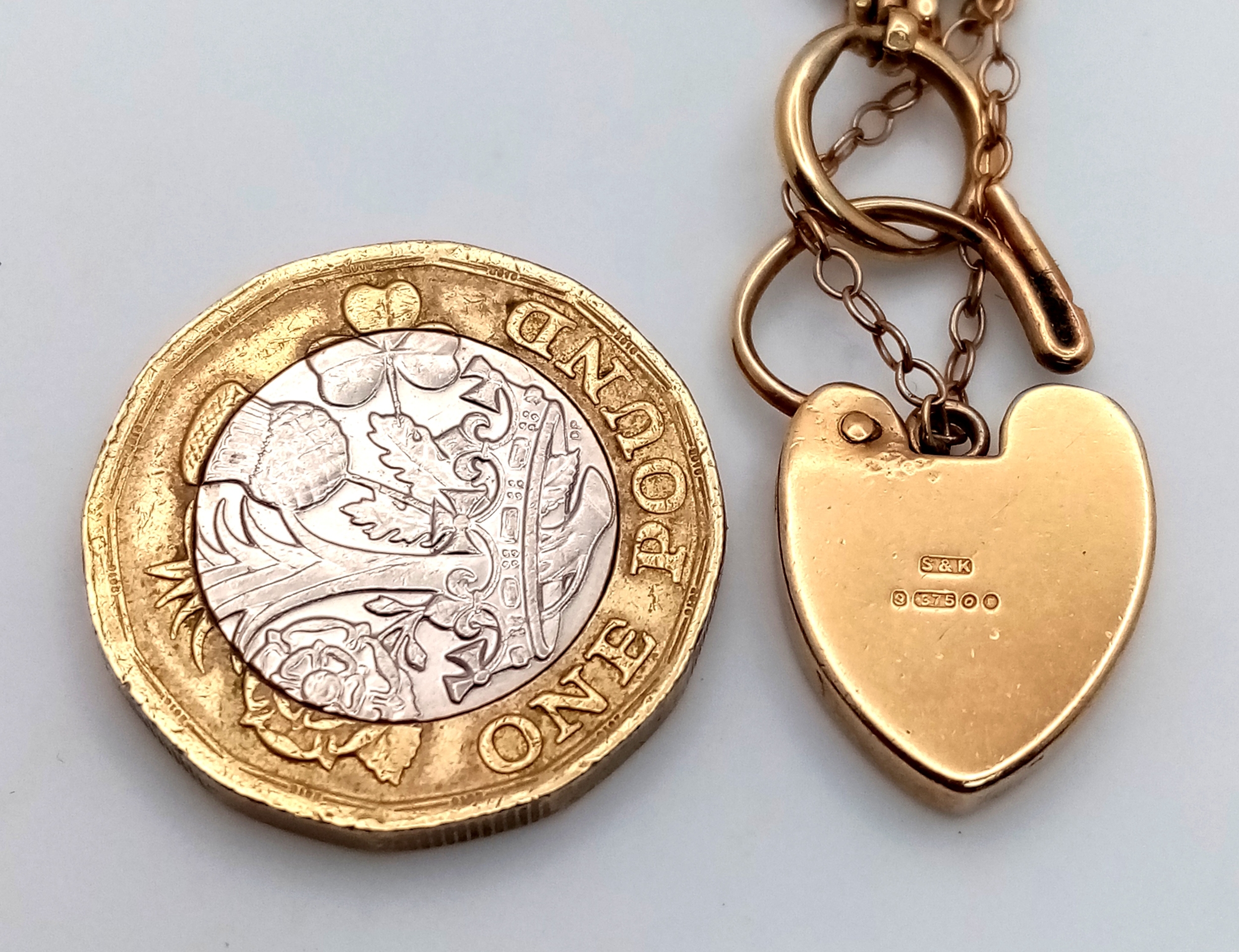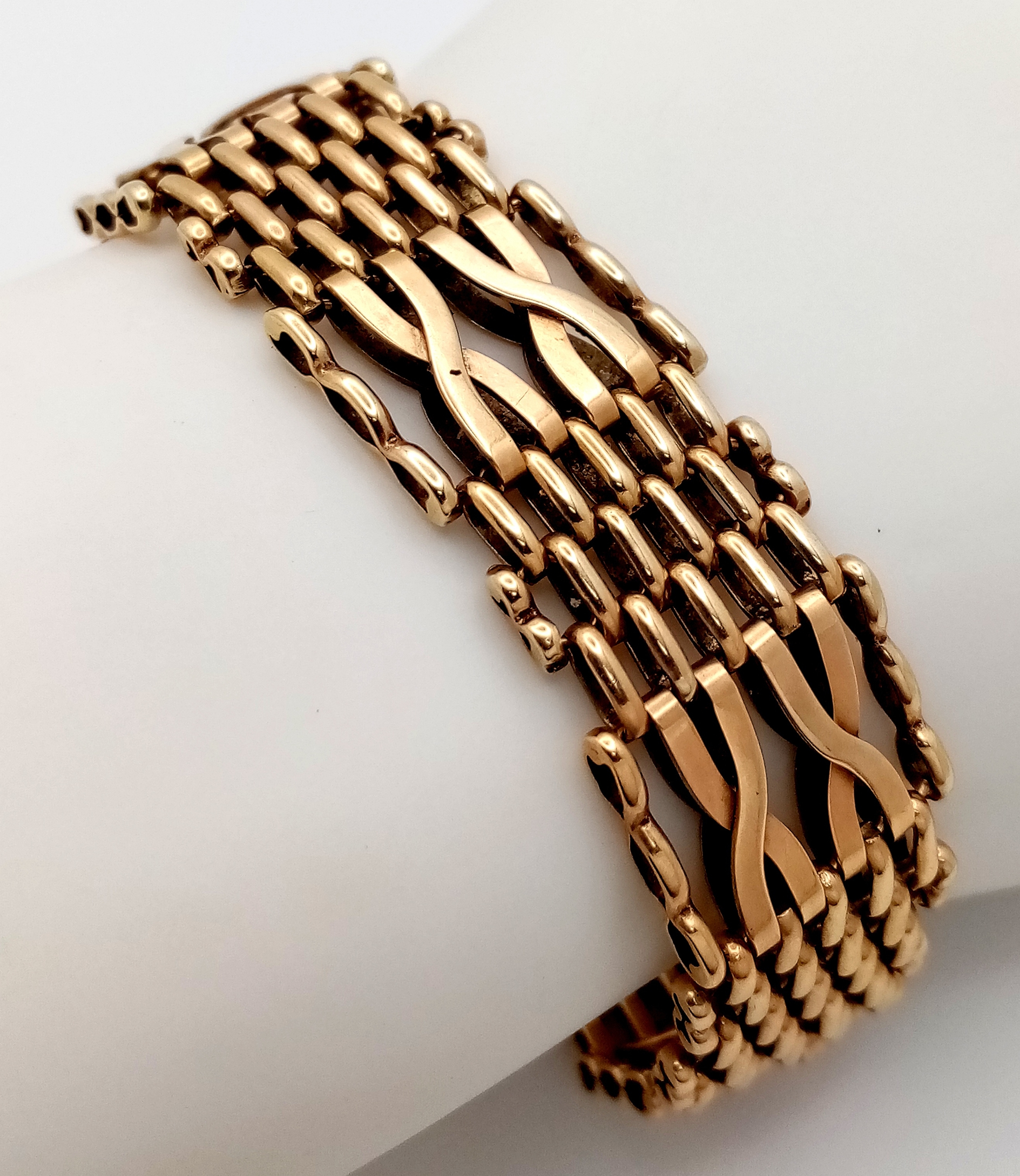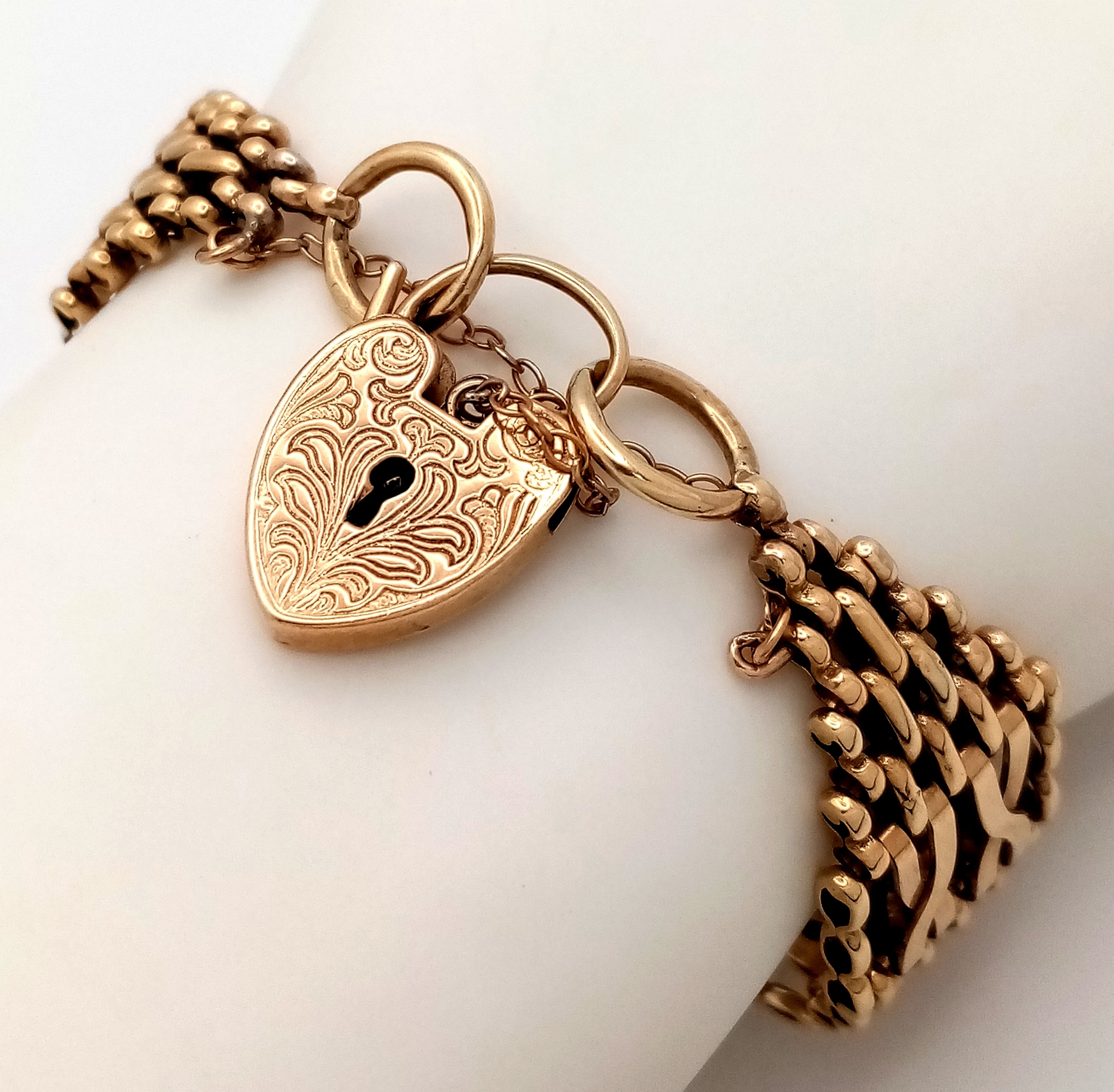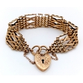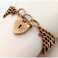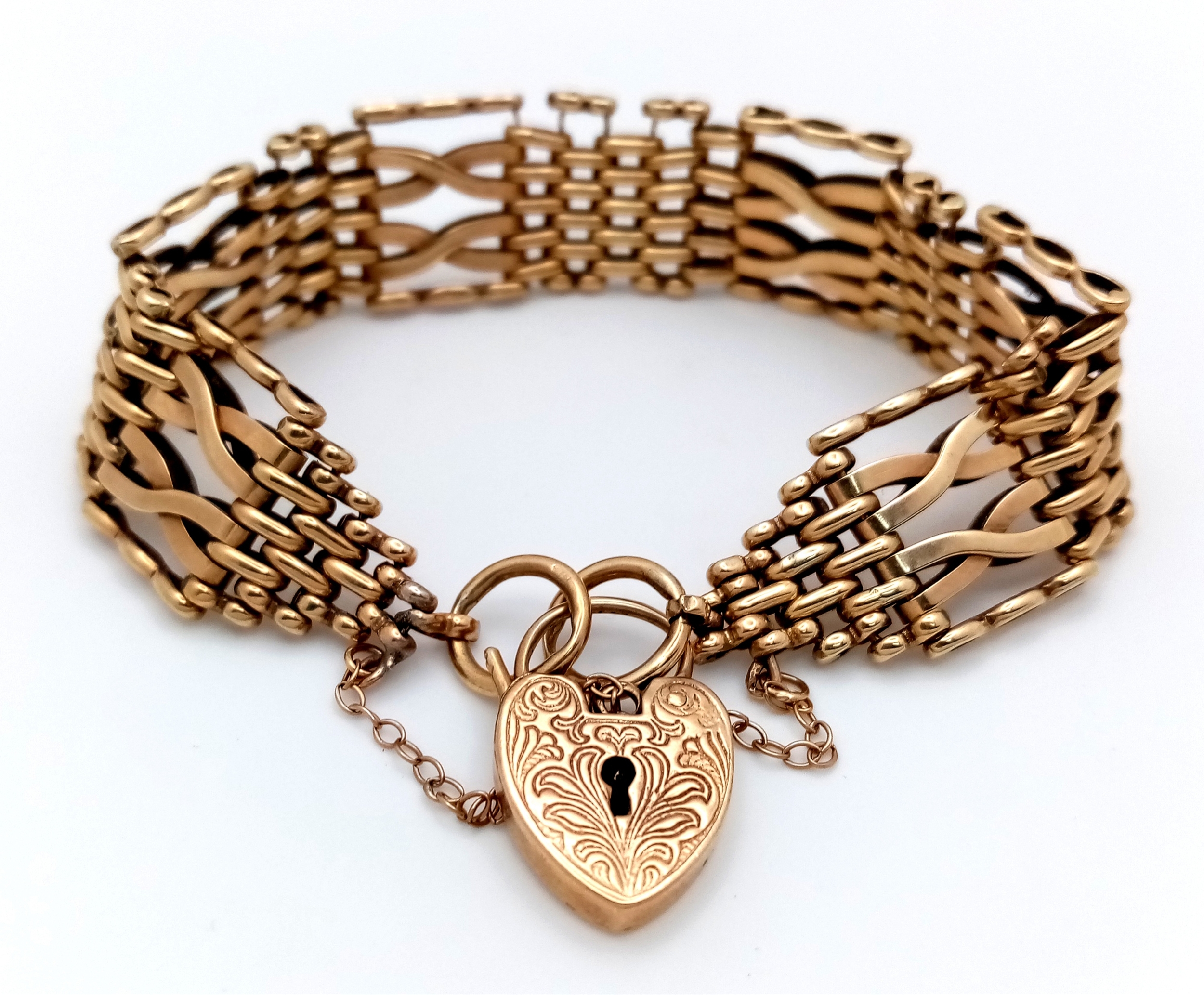 A 9K Yellow Gold Gate Bracelet with Heart Clasp. 17mm width. 25.4g. Very good condition.
