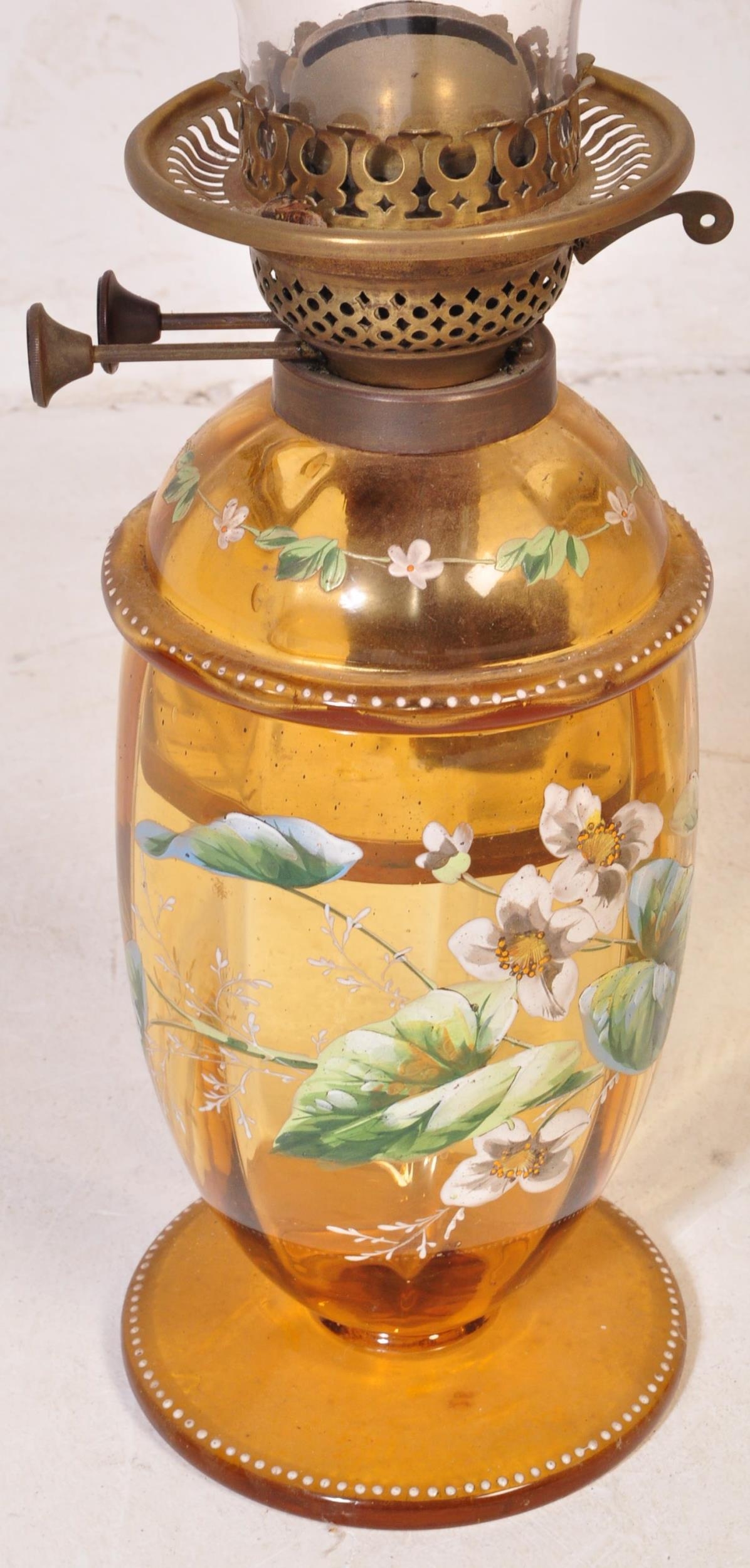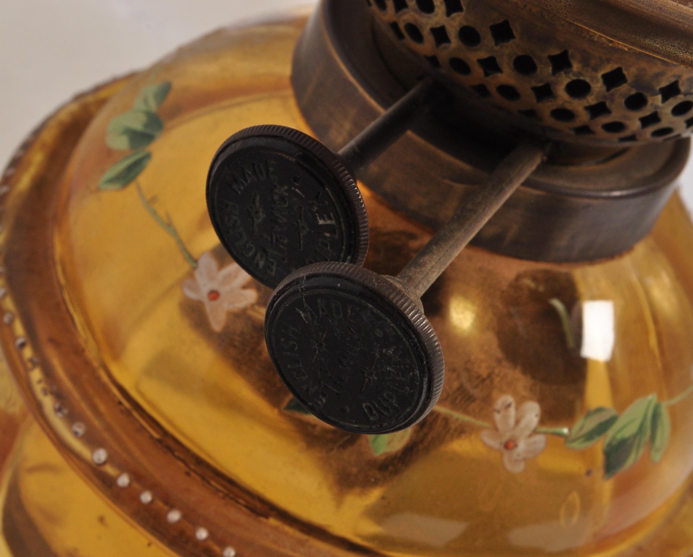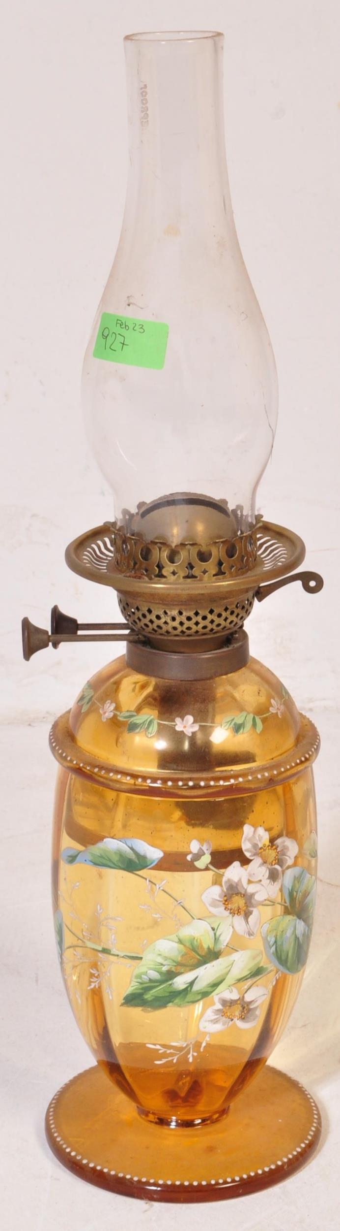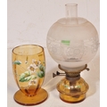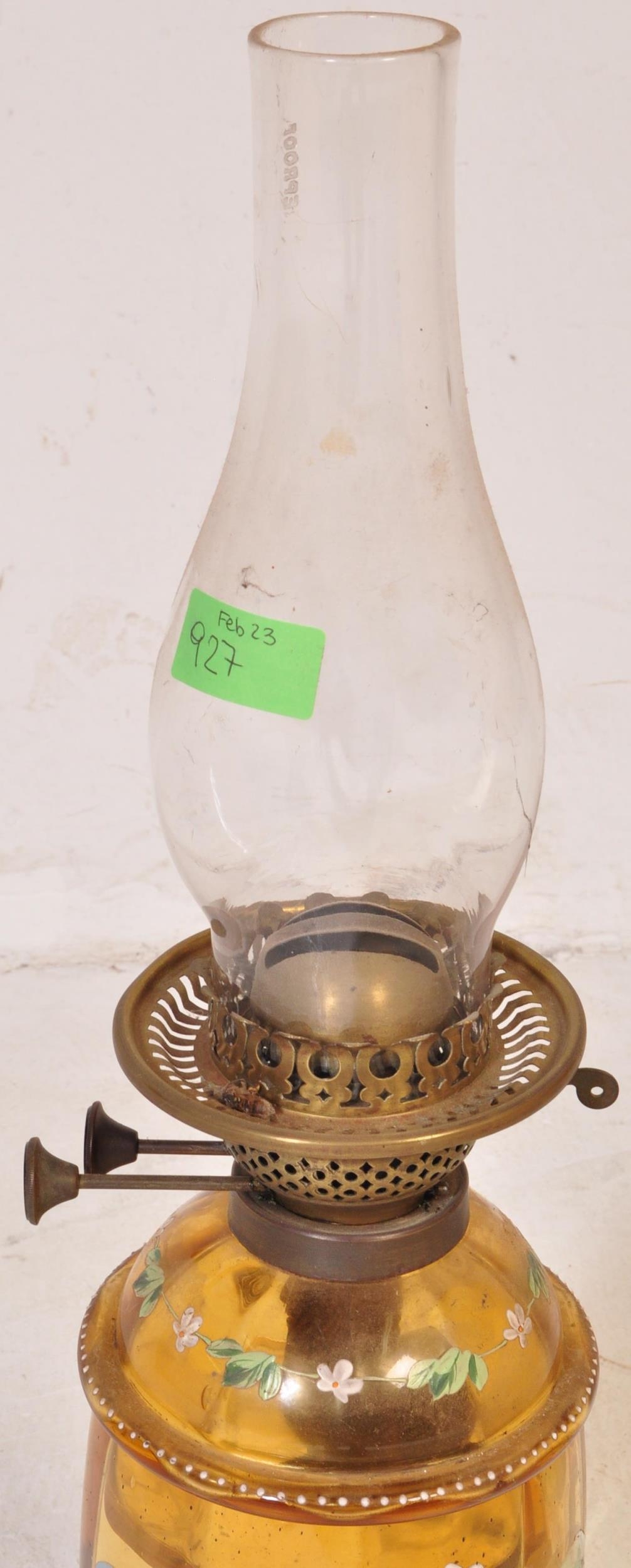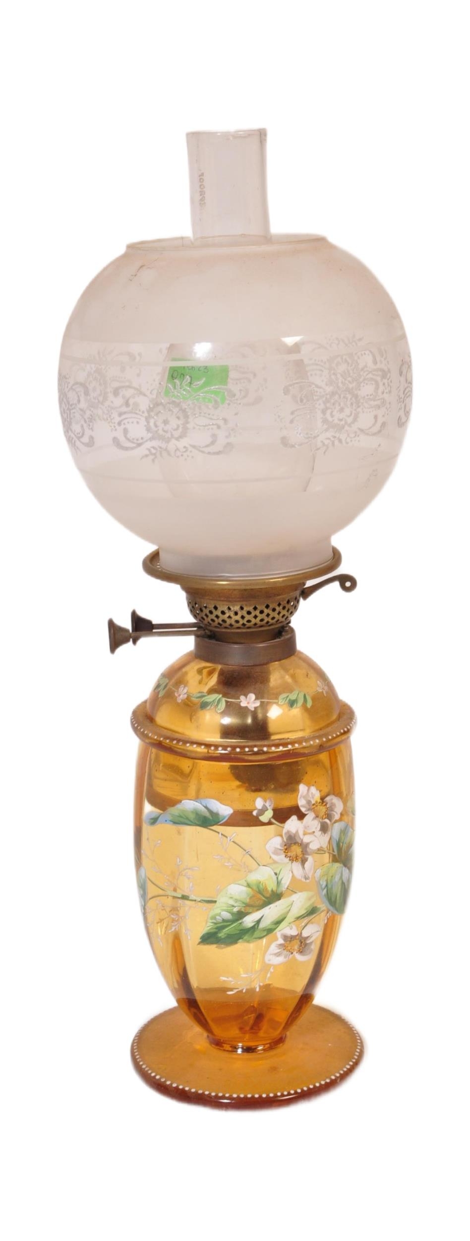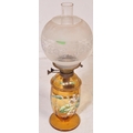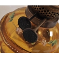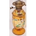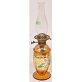 An early 20th century glass oil lamp having a enamelled decorated reservoir in yellow colourway, with funnel & opaline spherical shade. Measures approx; 55cm x 13cm diameter.