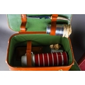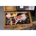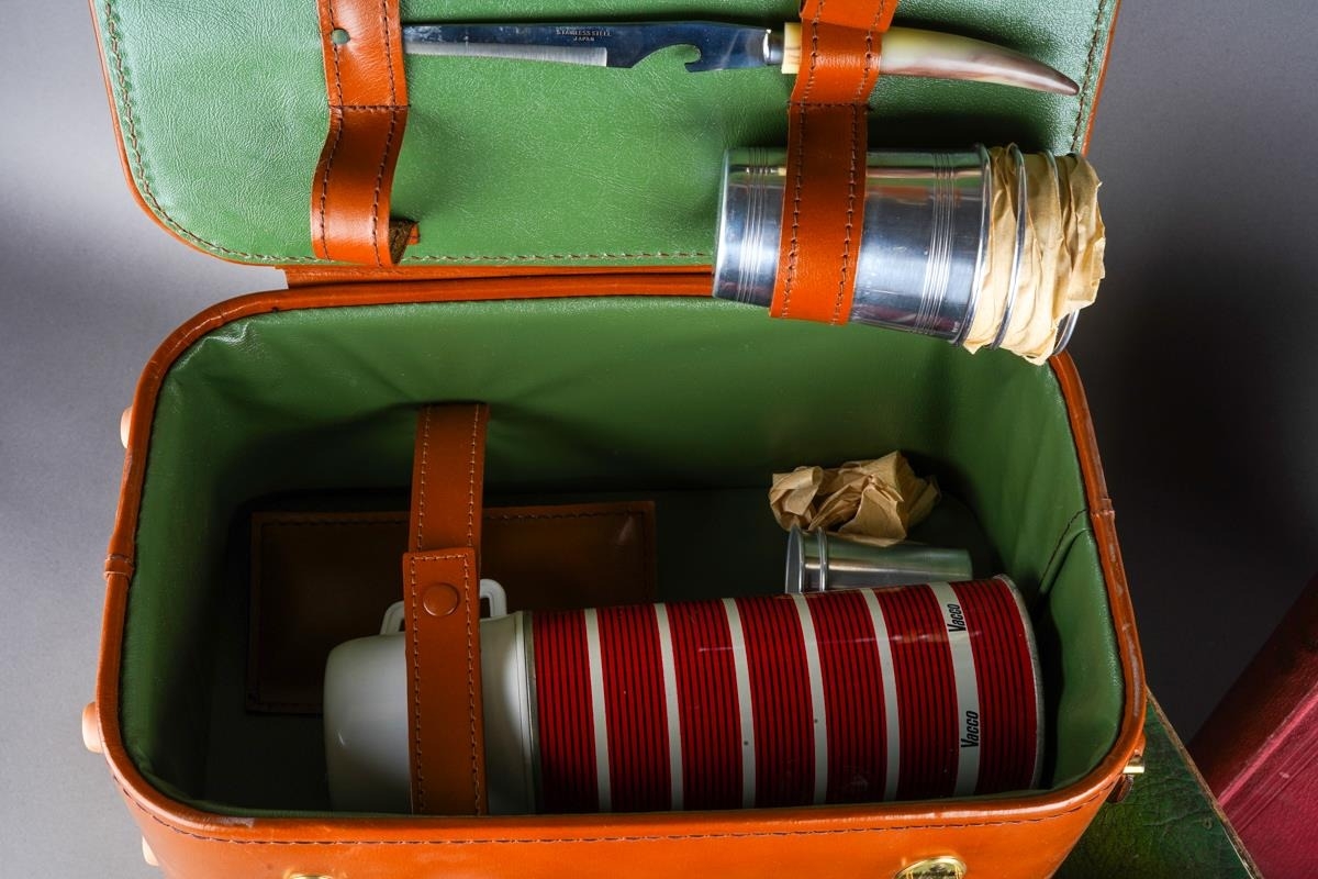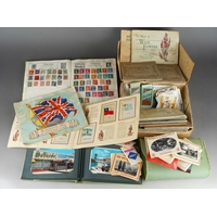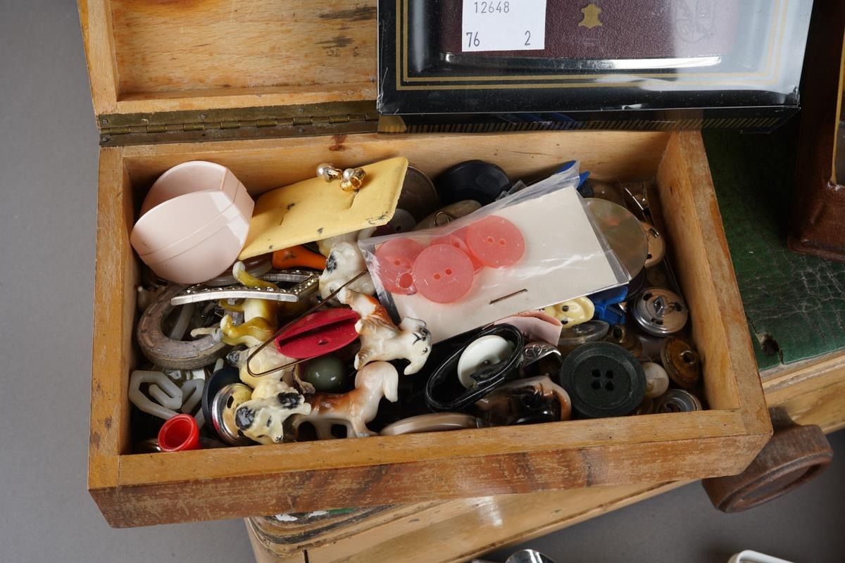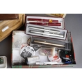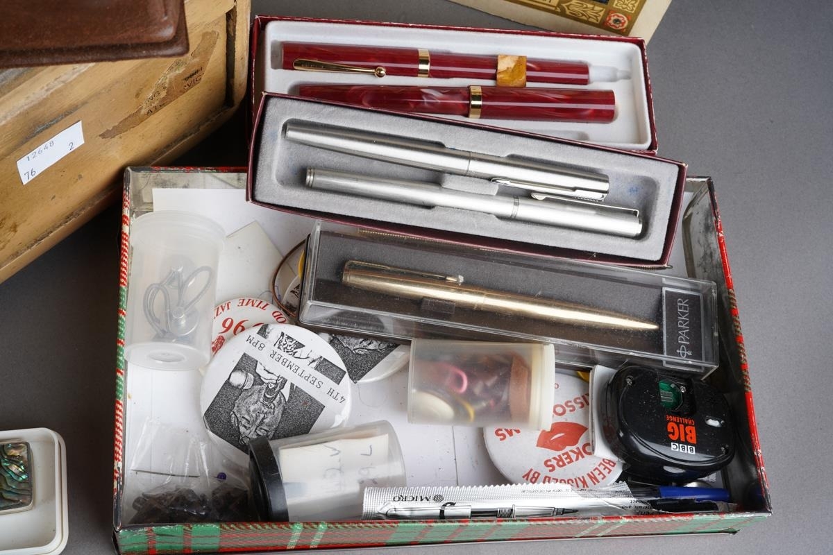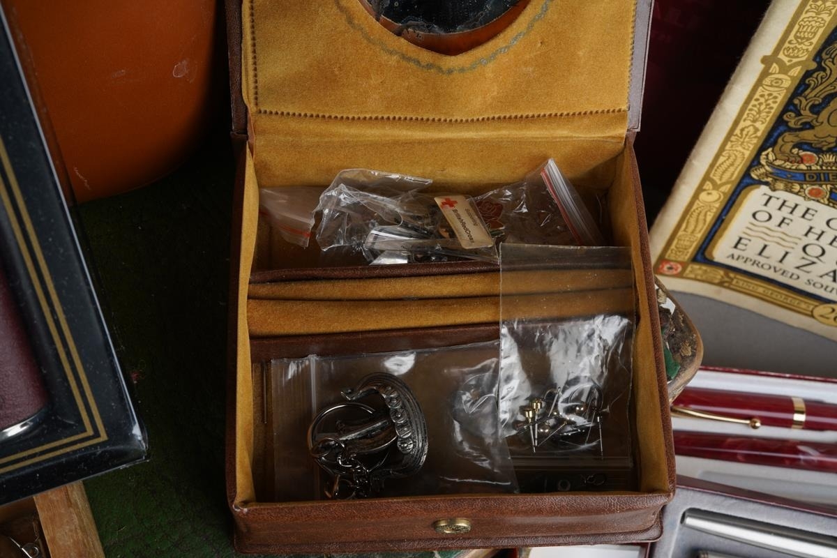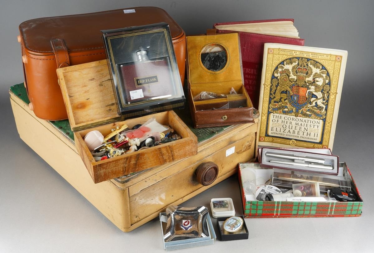 Assorted lot to include: vintage leather picnic case, various buttons, a Triumph Stamp Album including GB Victorian to George VI stamps, a Parker and a Ronson gold plated ball point pen, Sheaffer fountain pen, souvenir oval box, white metal mounted pill box, a drawer cash box, an Elizabeth II Coronation 2 June 1953 Souvenir programme [2]