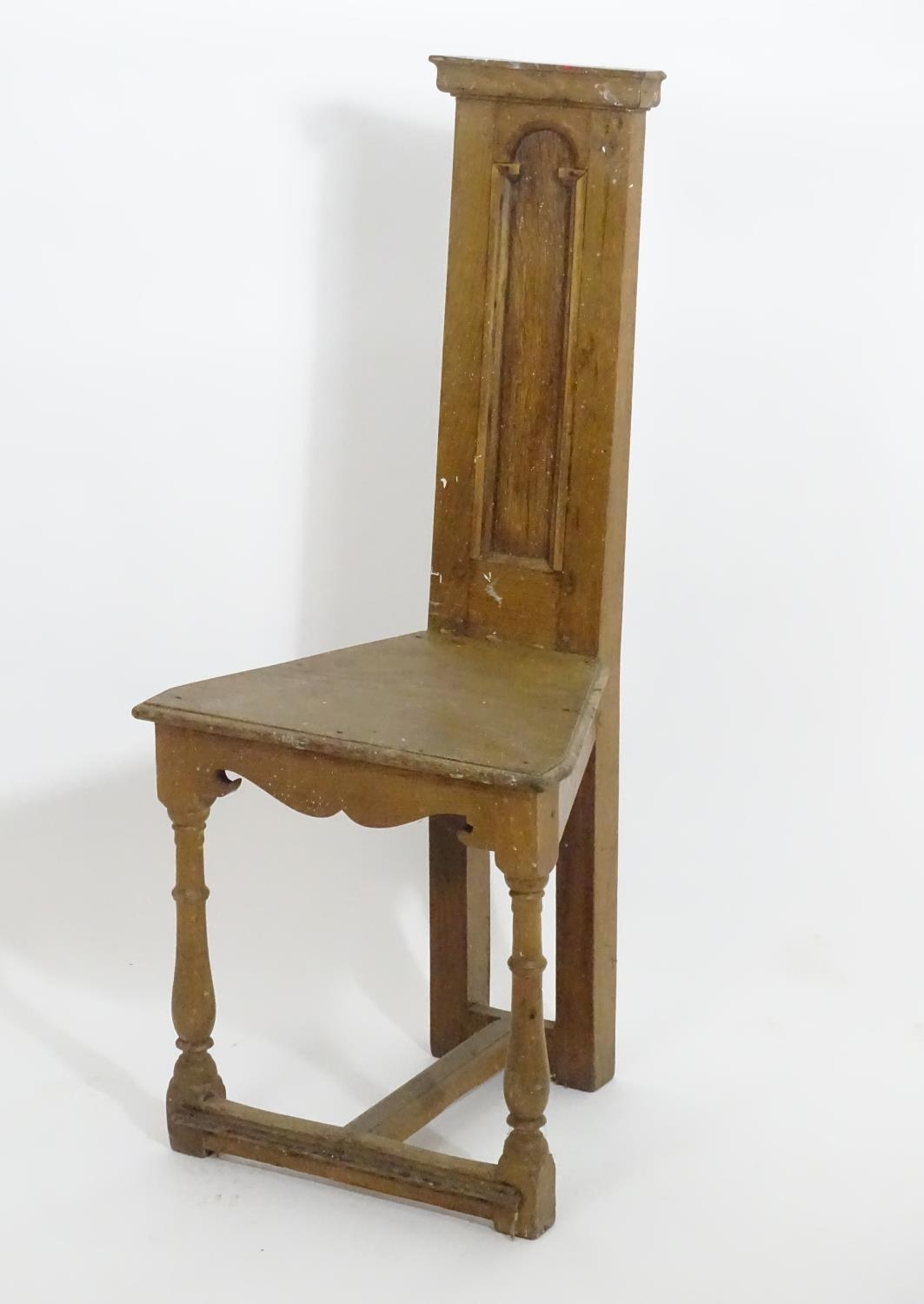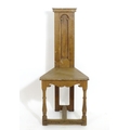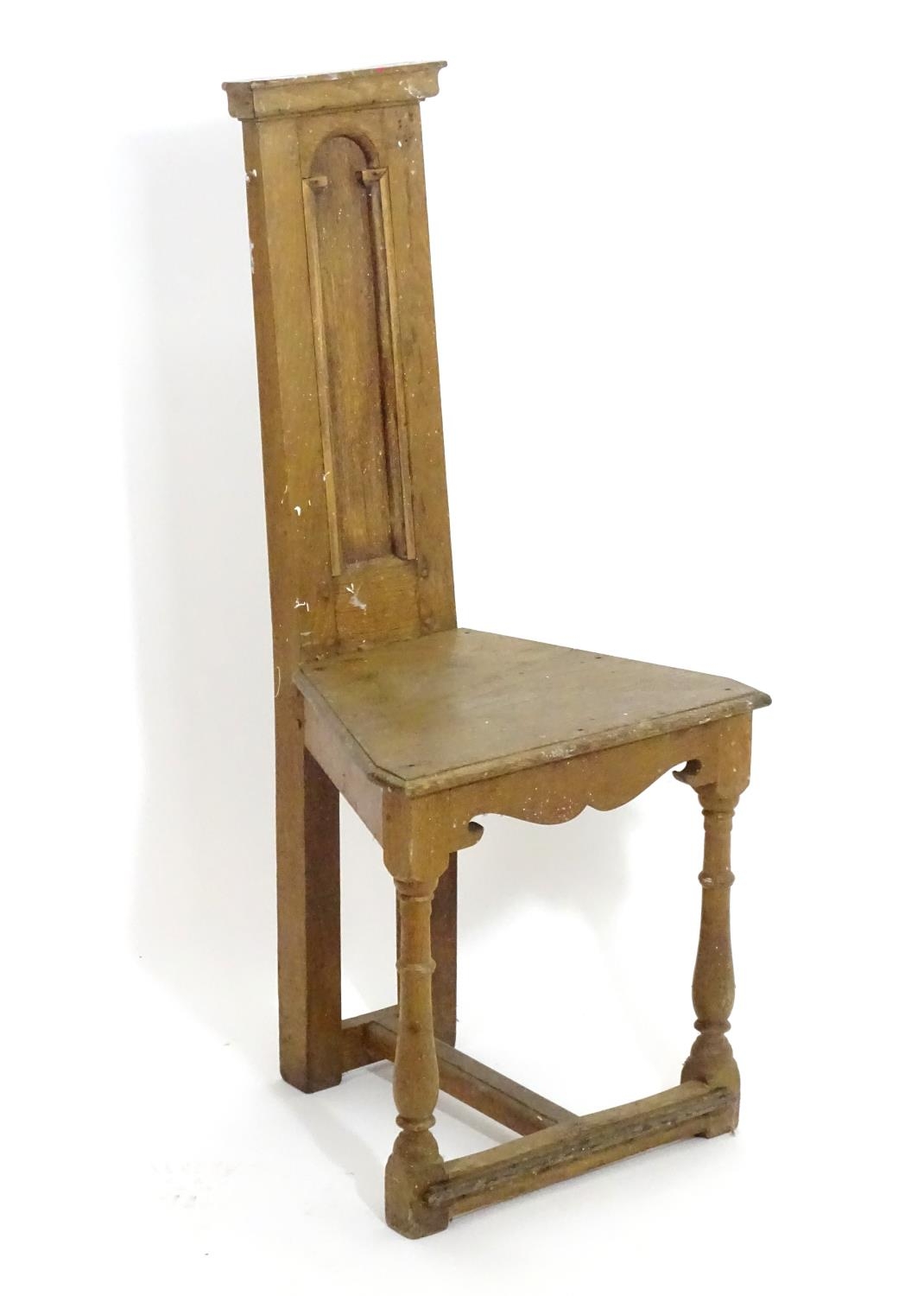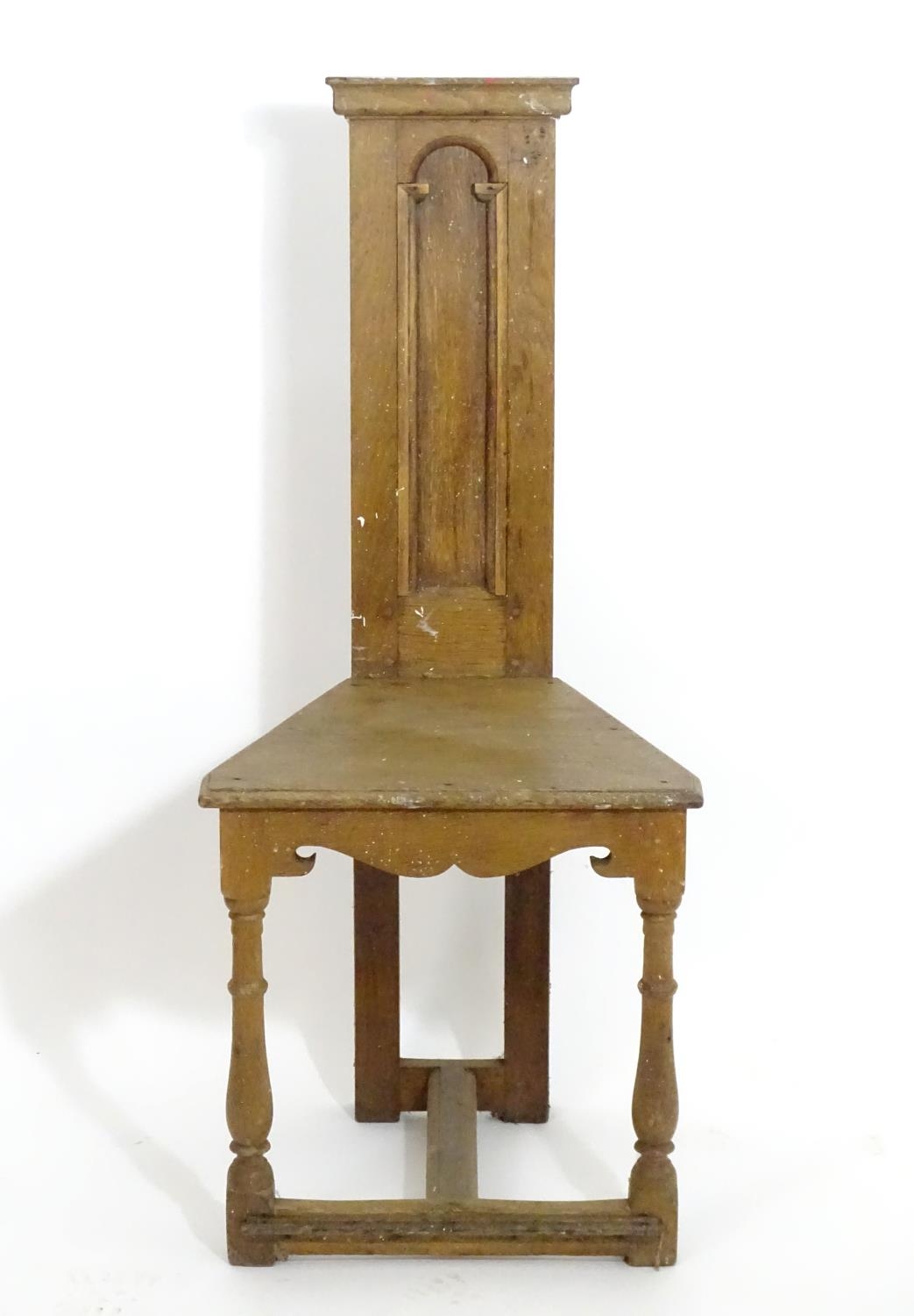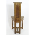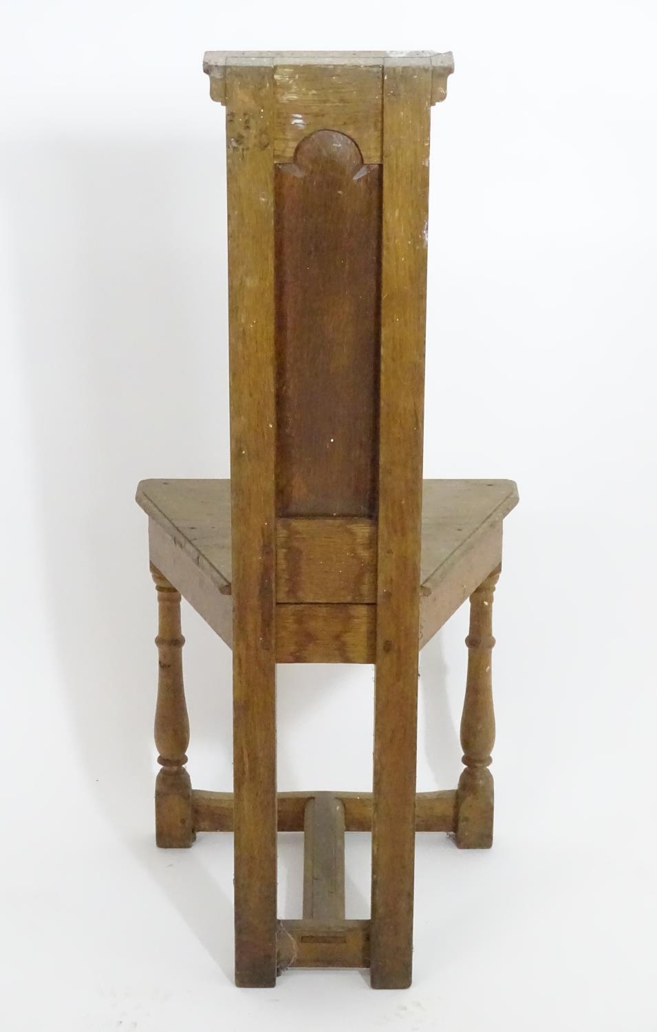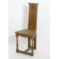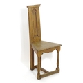 An early 20thC Arts and Crafts Shakespeare chair of oak construction , with a narrow panelled back above turned tapering front legs and squared back legs. 18" wide x 16" deep x