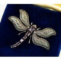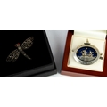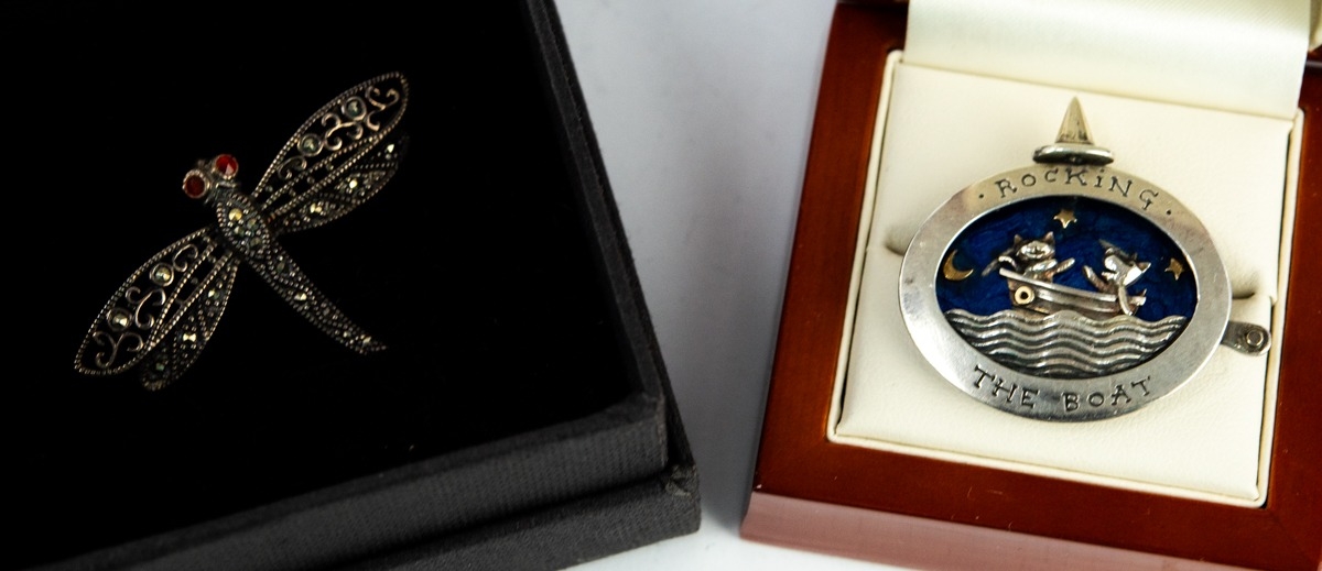 SMALL SILVER AND MARCASITE DRAGONFLY BROOCH with faceted ruby eyes, 1¾" wide (4.5cm); and a SILVER OVAL BROOCH inscribed 'Rocking the Boat' on border, cat and dog in a boat on a rough sea, activated by a lever to the side of the brooch, blue sky background with moon and stars, Birmingham hallmark (2)