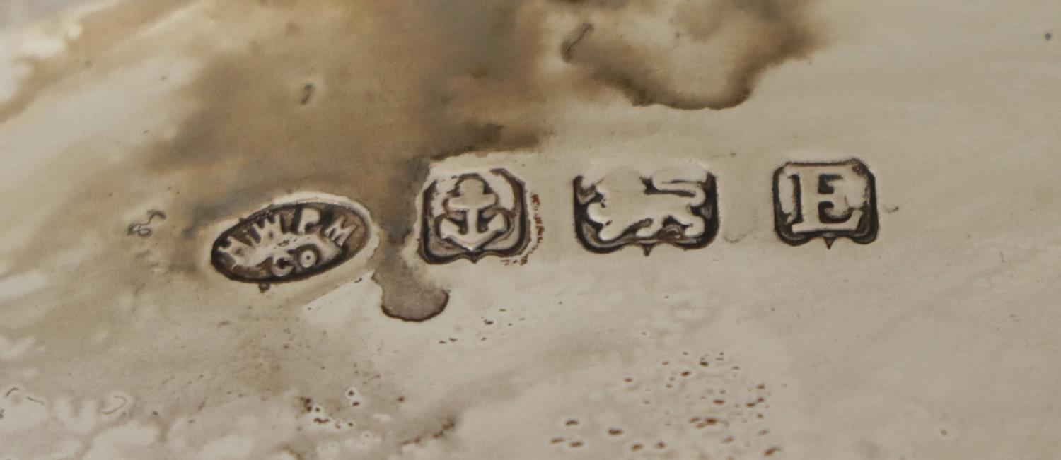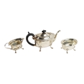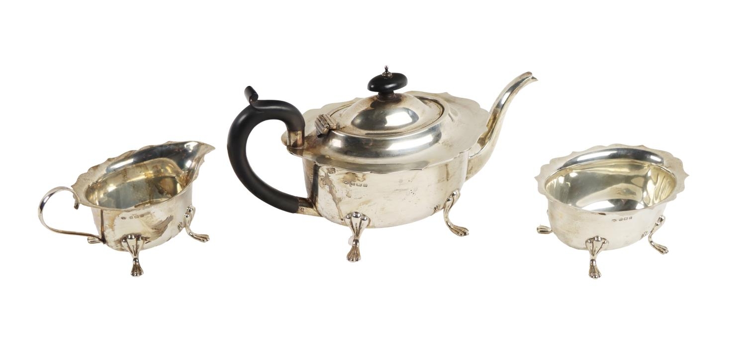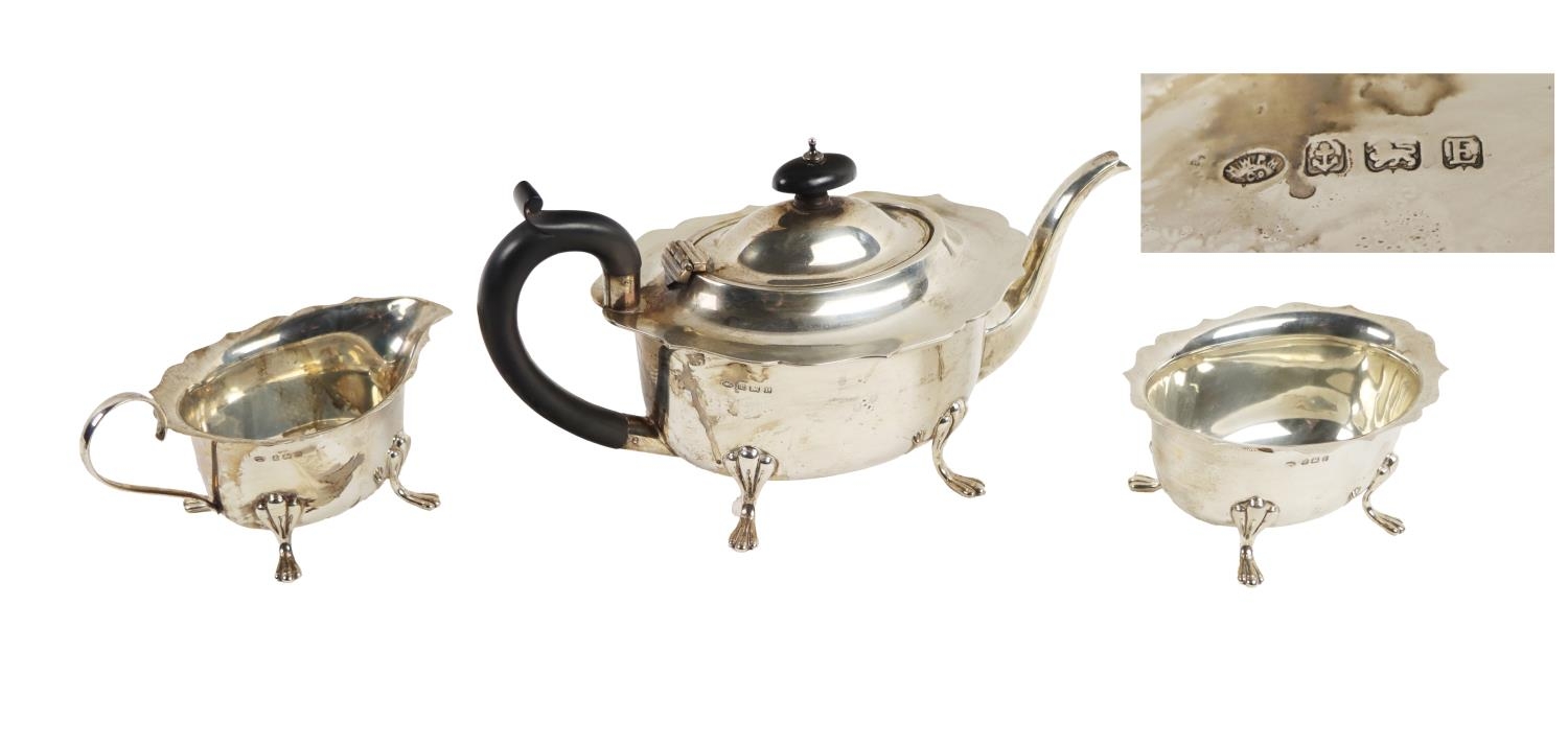 A three piece Edwardian silver Tea Service, comprising teapot, cream jug and sugar bowl, each with shaped edge on paw feet, hallmarked Birmingham, by H.W. Plate Manufacturing Co., c. 1929, approx. 34.6 ounces (all together). (3)