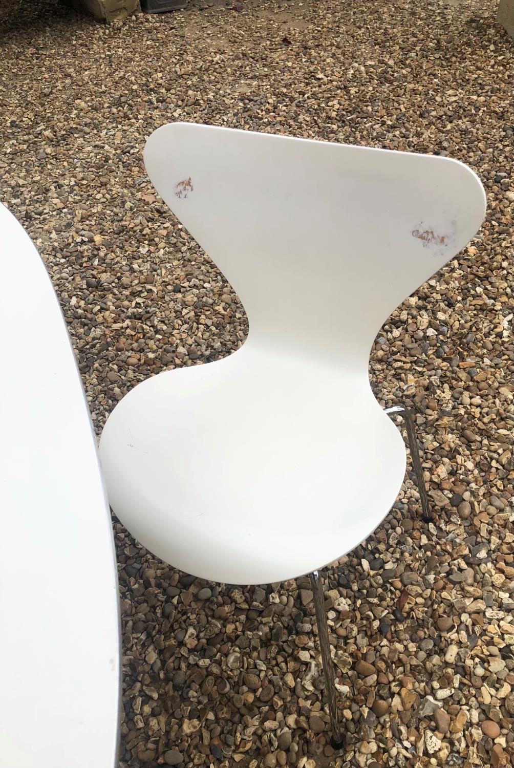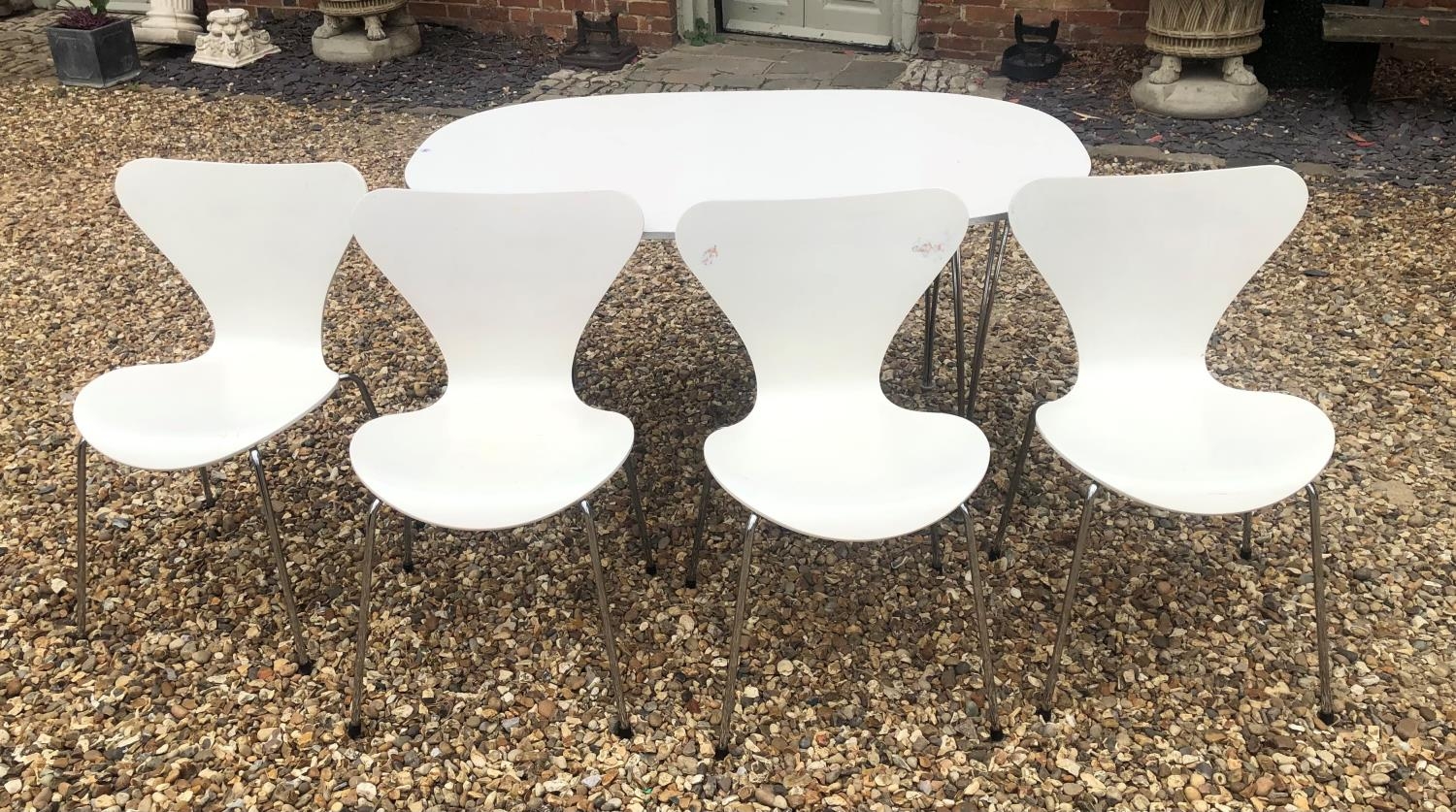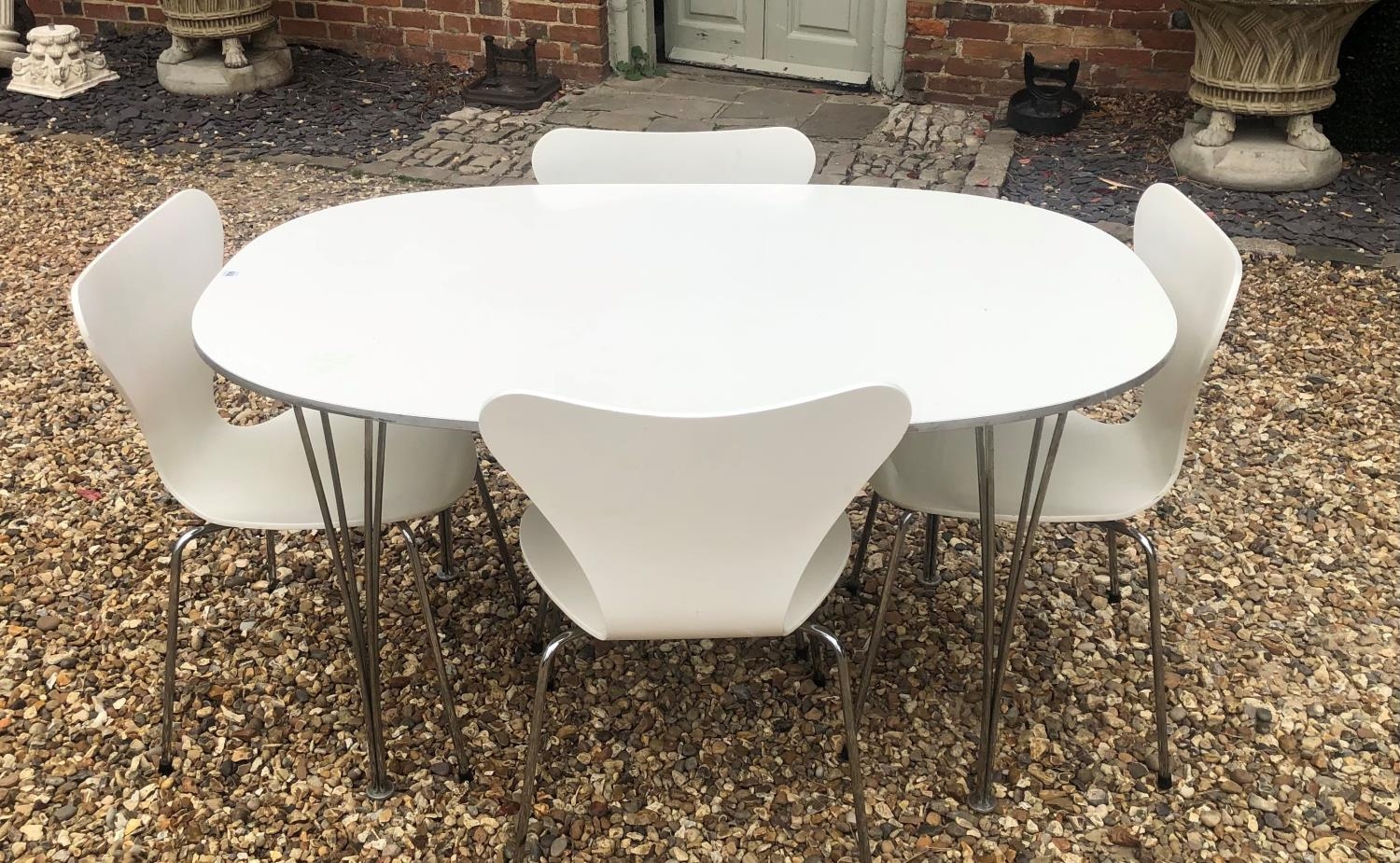 FRITZ HANSEN, DESIGNED BY ARNIE JACOBSEN, AN OVAL WHITE LACQUERED DINING TABLE AND FOUR MATCHING CHAIRS
