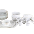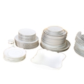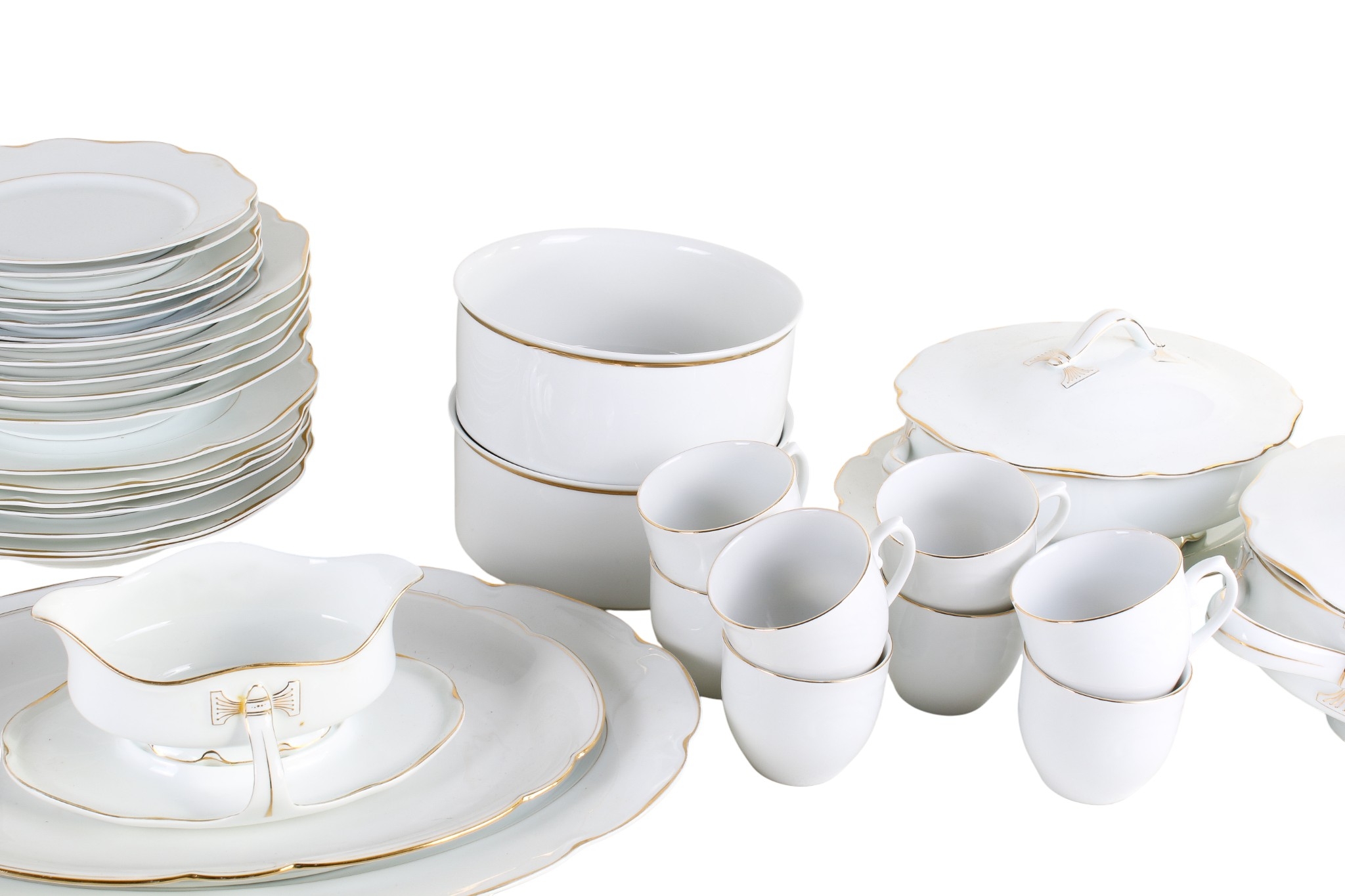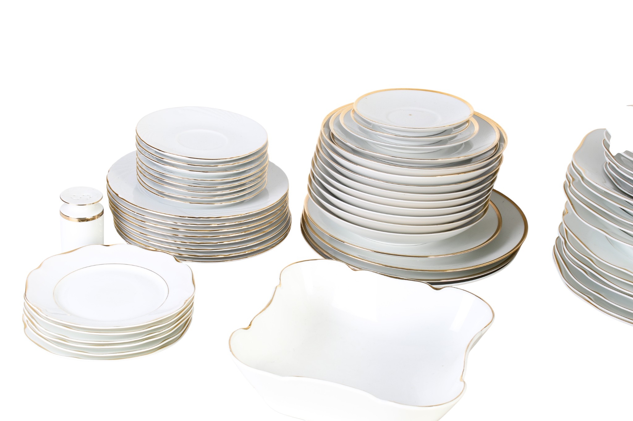 A matched porcelain tea and dinner service. Glazed in white with gilt details, consisting of pieces from Thomas, Iris and Rosenthal, including tureens, a sauceboat, etc.