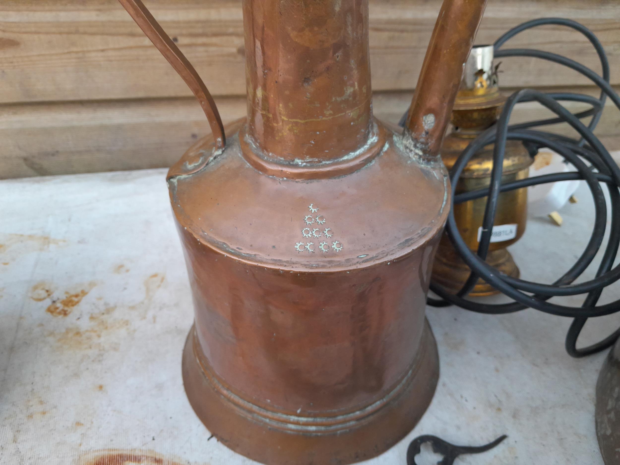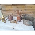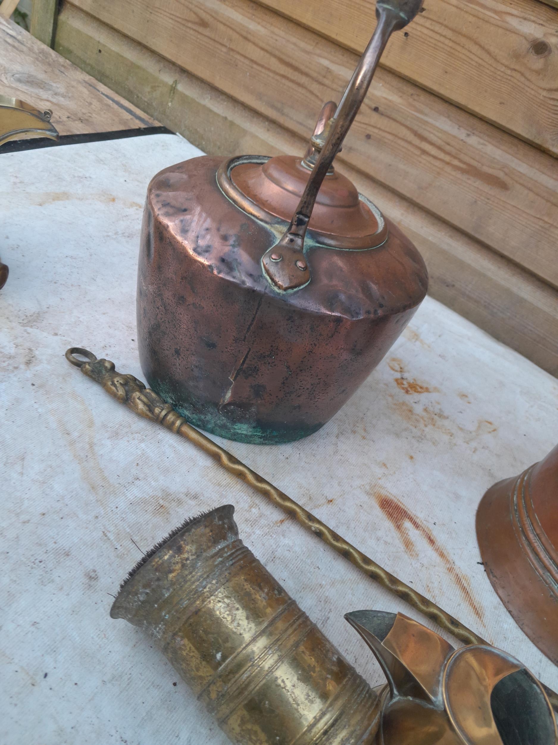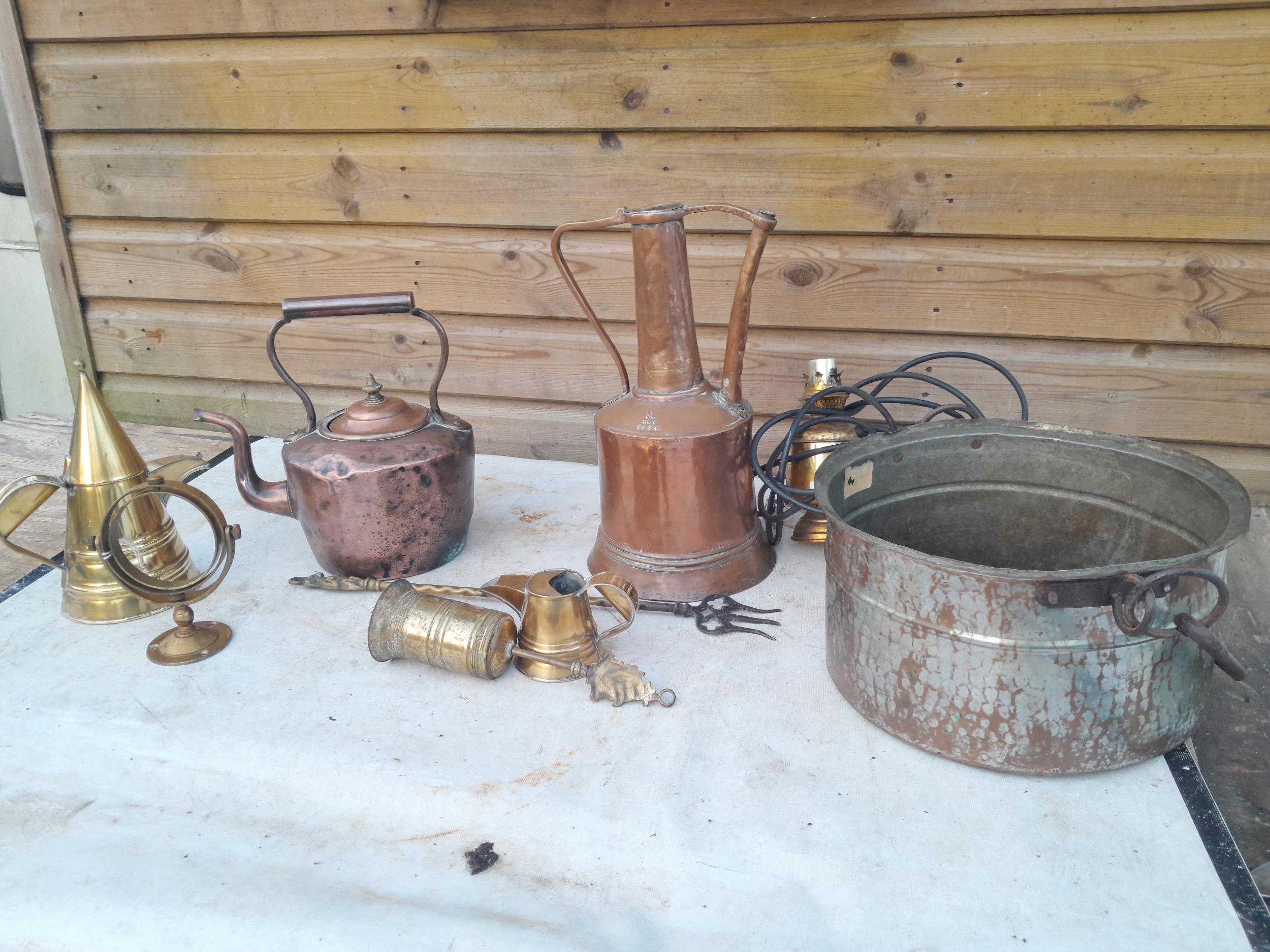 Mixed era brass and copper ware : vintage Indian copper cooking pot and water vessel