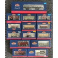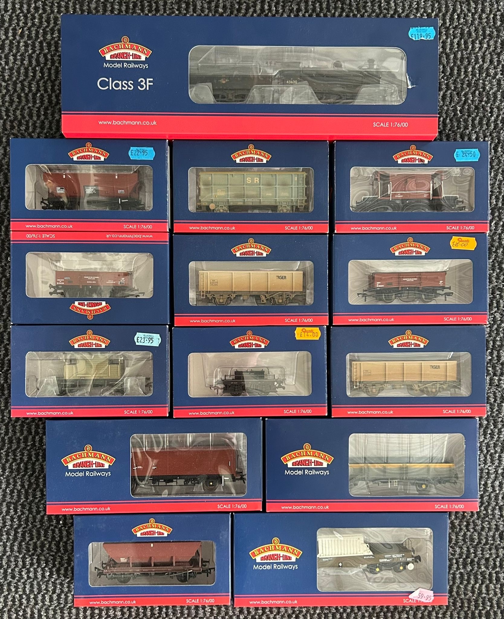 Bachmann Branch-Line OO Railway. A Steam Locomotive. A BR Class 3F 0-6-0 tender locomotive, 43620 (31-628DC) In weathered black livery, with late crest. Together with 13 various freight wagons including BR FNA Nuclear Flask Wagon, GWR Shunters Truck, Margam-Junc weathered, POA Mineral wagon, Yeoman, weathered. 20T Break Van, Bauxite weathered, plus a VAA Box van BR Railfreight, brown, etc. All boxed. Contents looks to be as new.