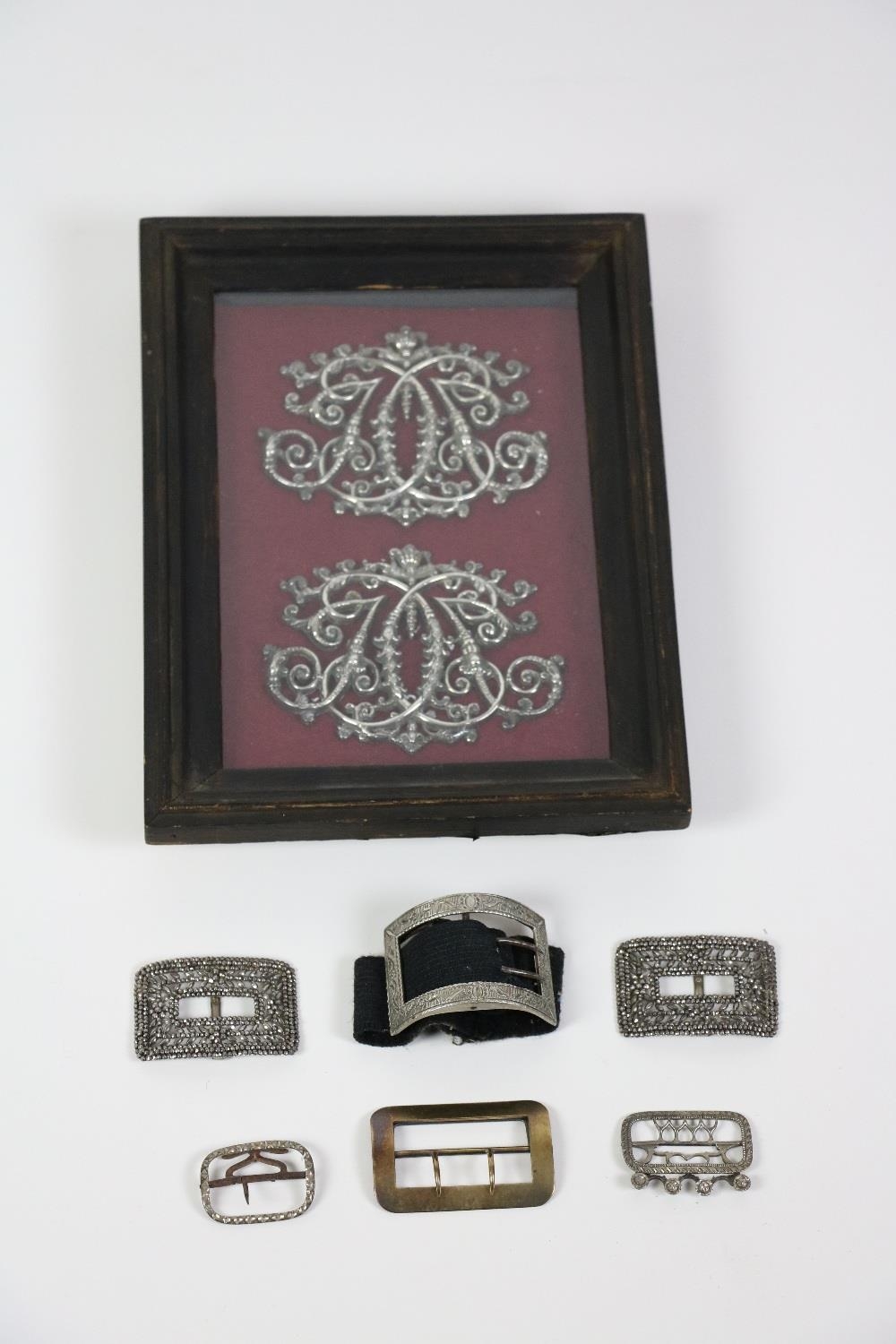 A rare and unusual pair of elaborately decorated silver plated 19th Century Coach Ornaments, mounted framed; and a collection of silver and silver plated antique Shoe Buckles; and a pair of mother-o-pearl Opera Glasses. (a lot)