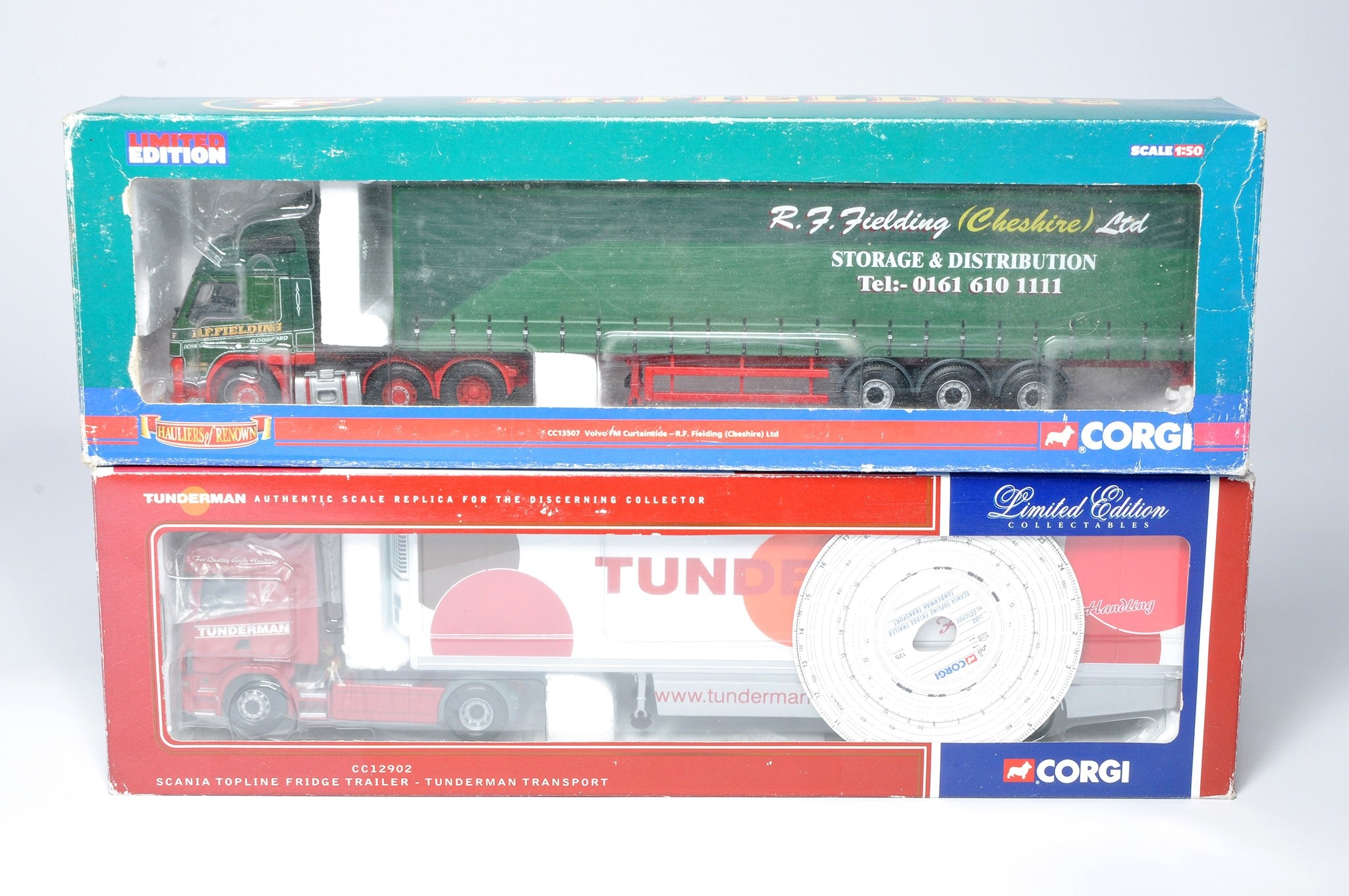 Corgi (boxed) 1/50 diecast model truck issues comprising sets in the livery of Fielding and Tunderman. Look to be without obvious sign of notable fault, albeit, not checked for absolute completeness.