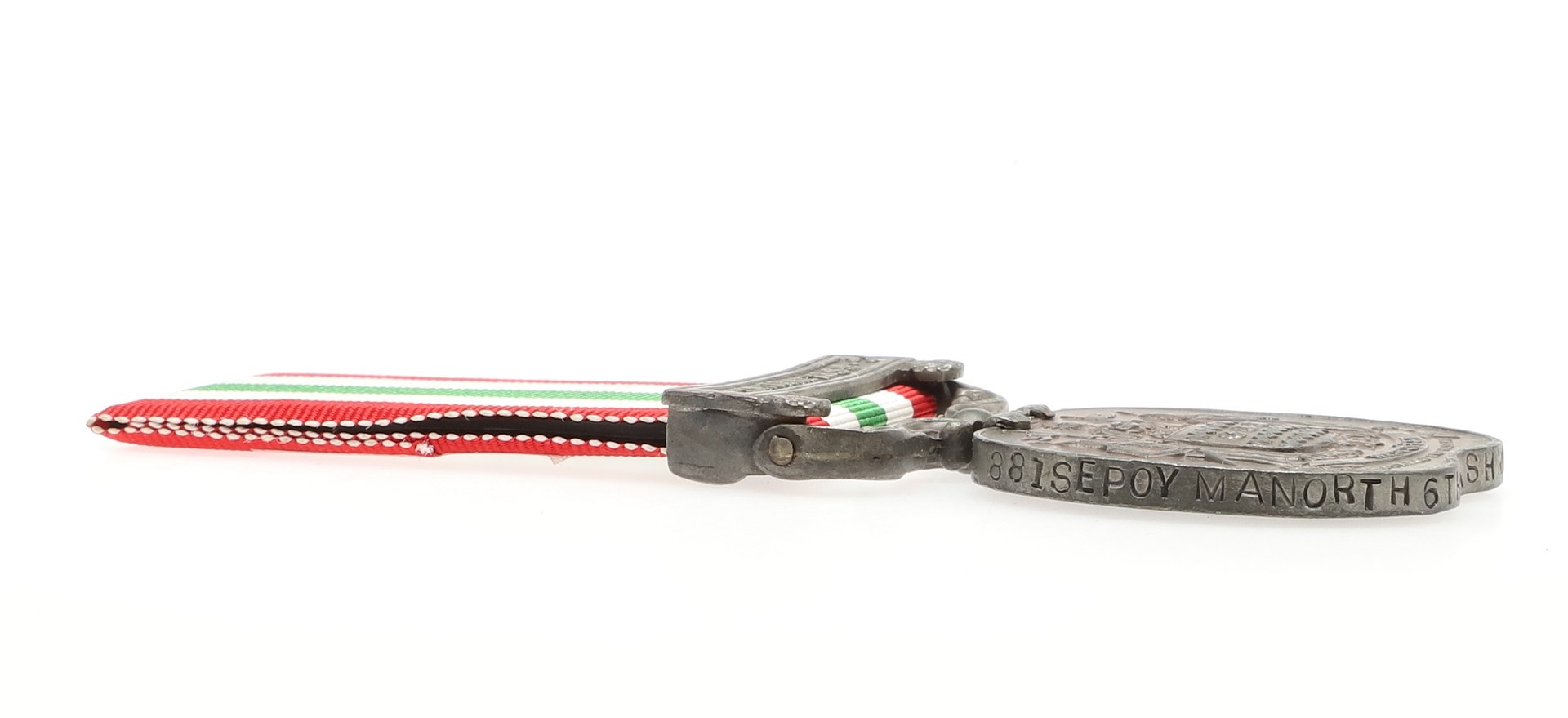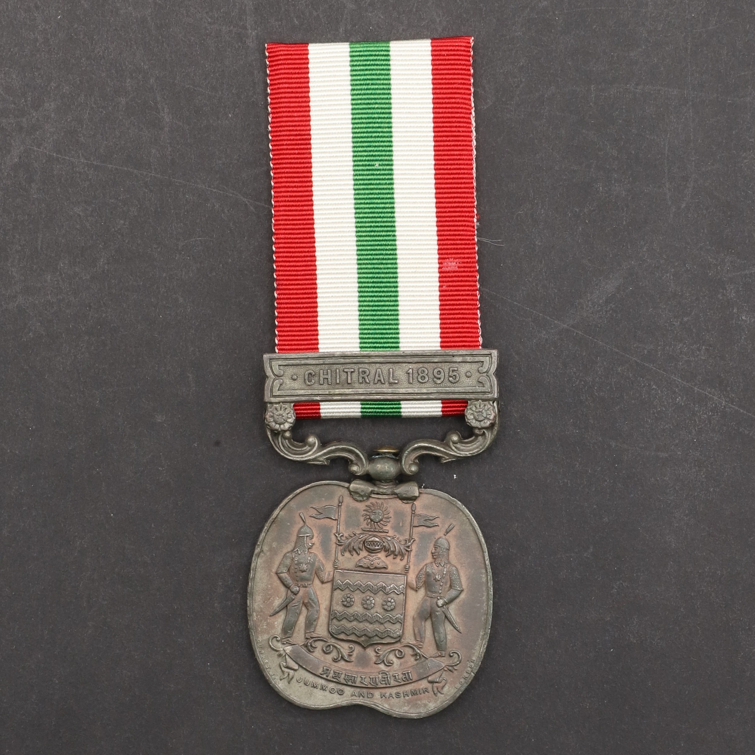 A JUMMOO AND KASHMIR MEDAL 1895 WITH CHITRAL 1895 CLASP TO THE 6th KASHMIR LIGHT INFANTRY. A Jummoo and Kahmir medal with Chitral 1895 clasp named to 881 Sepoy Manorth 6th Kashmir L.I.' The reverse if the clasp stamped 'Gurney London'. The 6th Kashmir Light Infantry were disbanded in 1896, at this time they had a strength of about 625 men. This medal was awarded by the Maharajah of Jummoo and Kahmir upon his native troops who took part in the defence and relief of Chitral in 1895. Provenance Noonans 2019.
