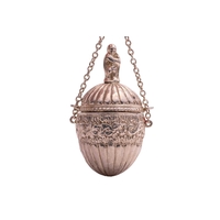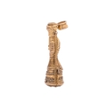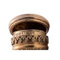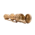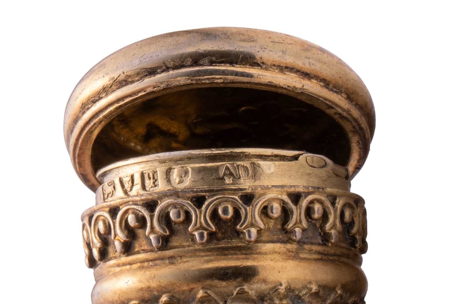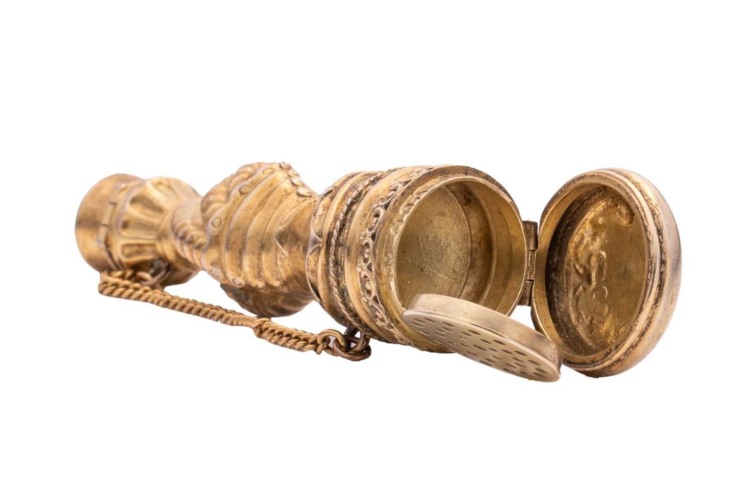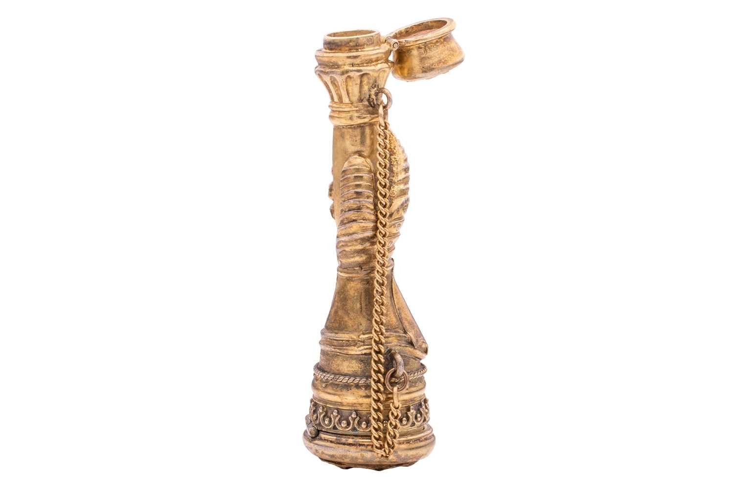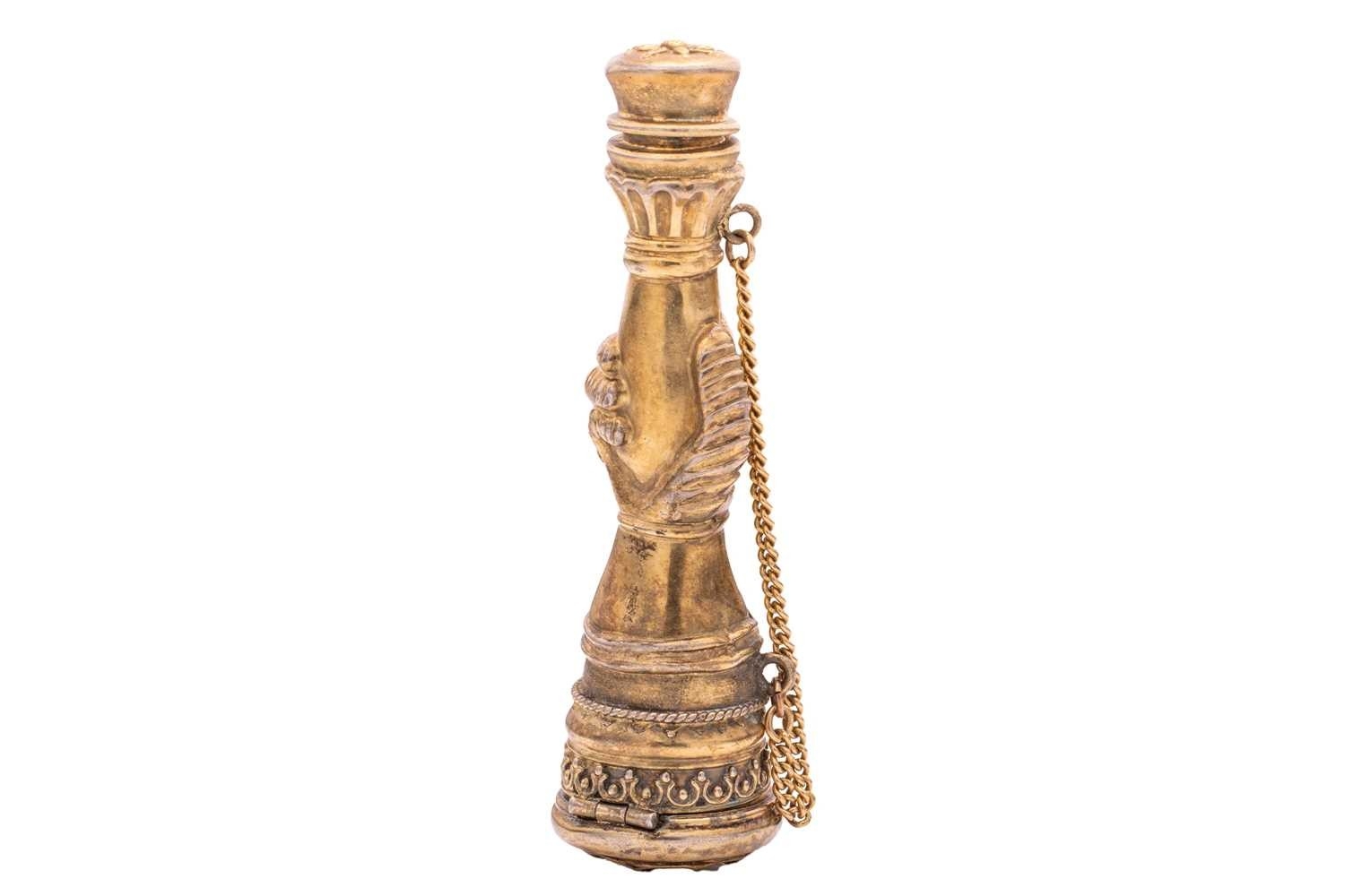 A Victorian silver gilt combined vinaigrette and scent bottle, in the form of an armoured gauntlet, by Archibald Douglas, London 1871, applied with vacant shield cartouche, one end terminated with a scent bottle compartment, the other end with hinged cover open to reveal drilled grille, attached with suspension loop and chain, 7.6 cm long, 17.9 grams.