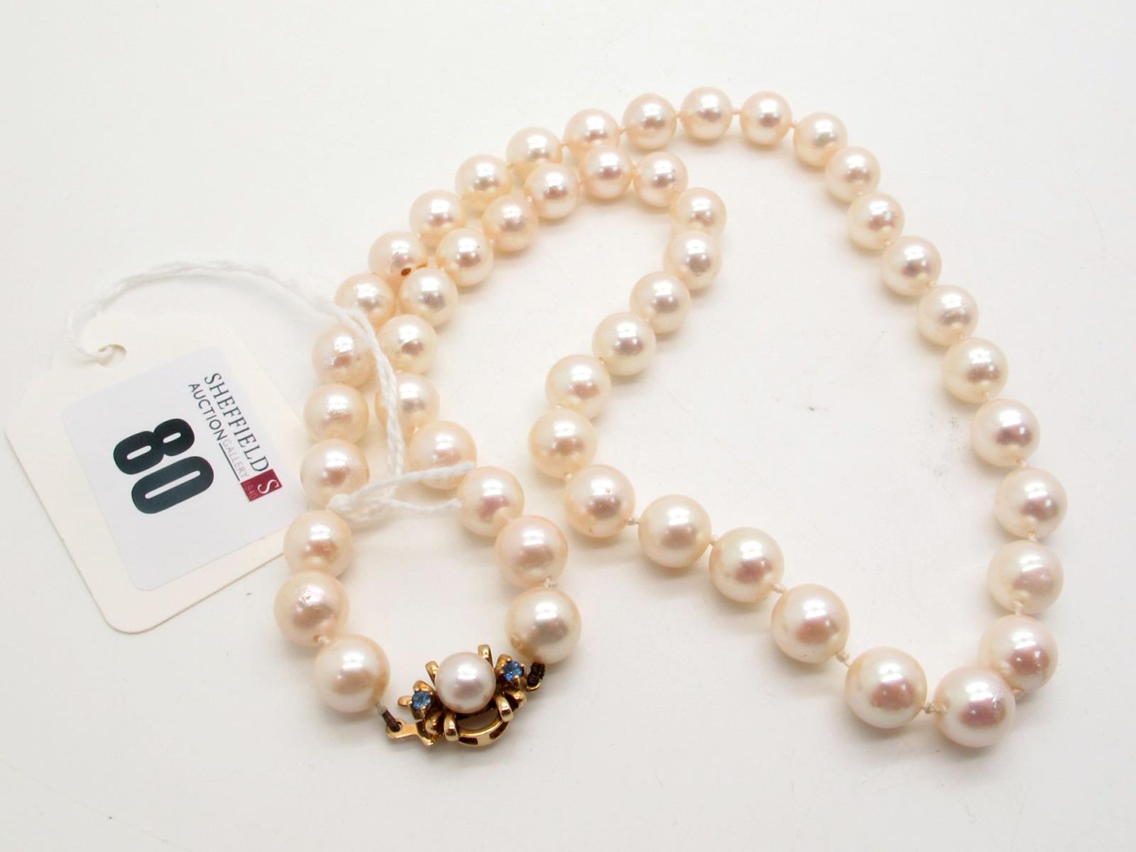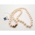 A Single Strand Uniform Pearl Bead Necklace, knotted to 9ct gold pearl set clasp.