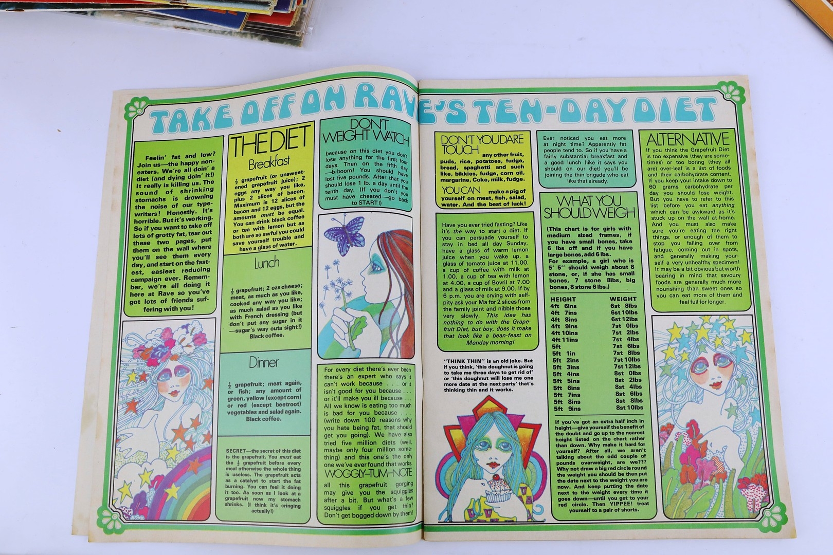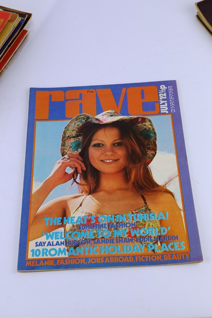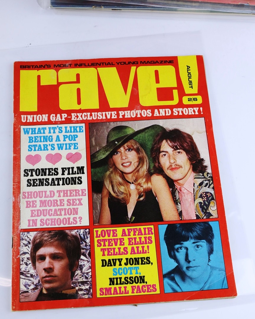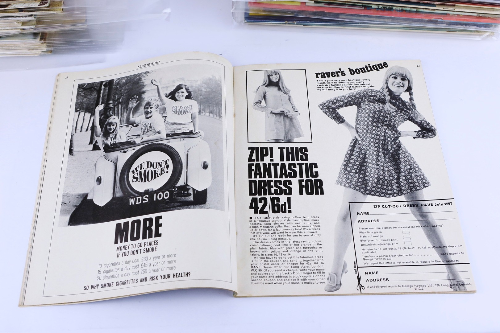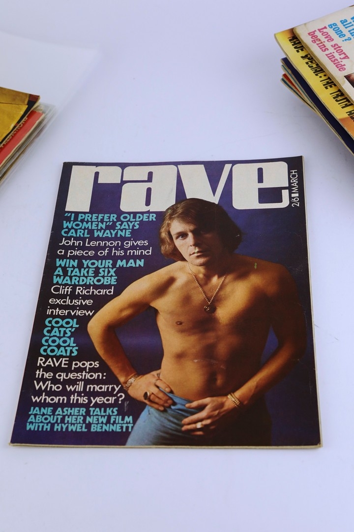VINTAGE RAVE MAGAZINES, NEAR FULL RUN OF 72 ISSUES, 1964-71. Rave Magazines, 72 issues of the UK's iconic pop magazine published by George Newnes Ltd during the 1960s. The collection contains issues dating from 1964-1971, with cover features by The Beatles, Mick Jagger, Twiggy, Cilla Black, Jimi Hendrix, Bob Dylan, John Voight, Marianne Faithfull, and Steve Ellis, among others. Most notably, the collection includes Issue No. 1 from 1964, featuring the Beatles and 007.