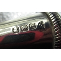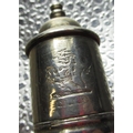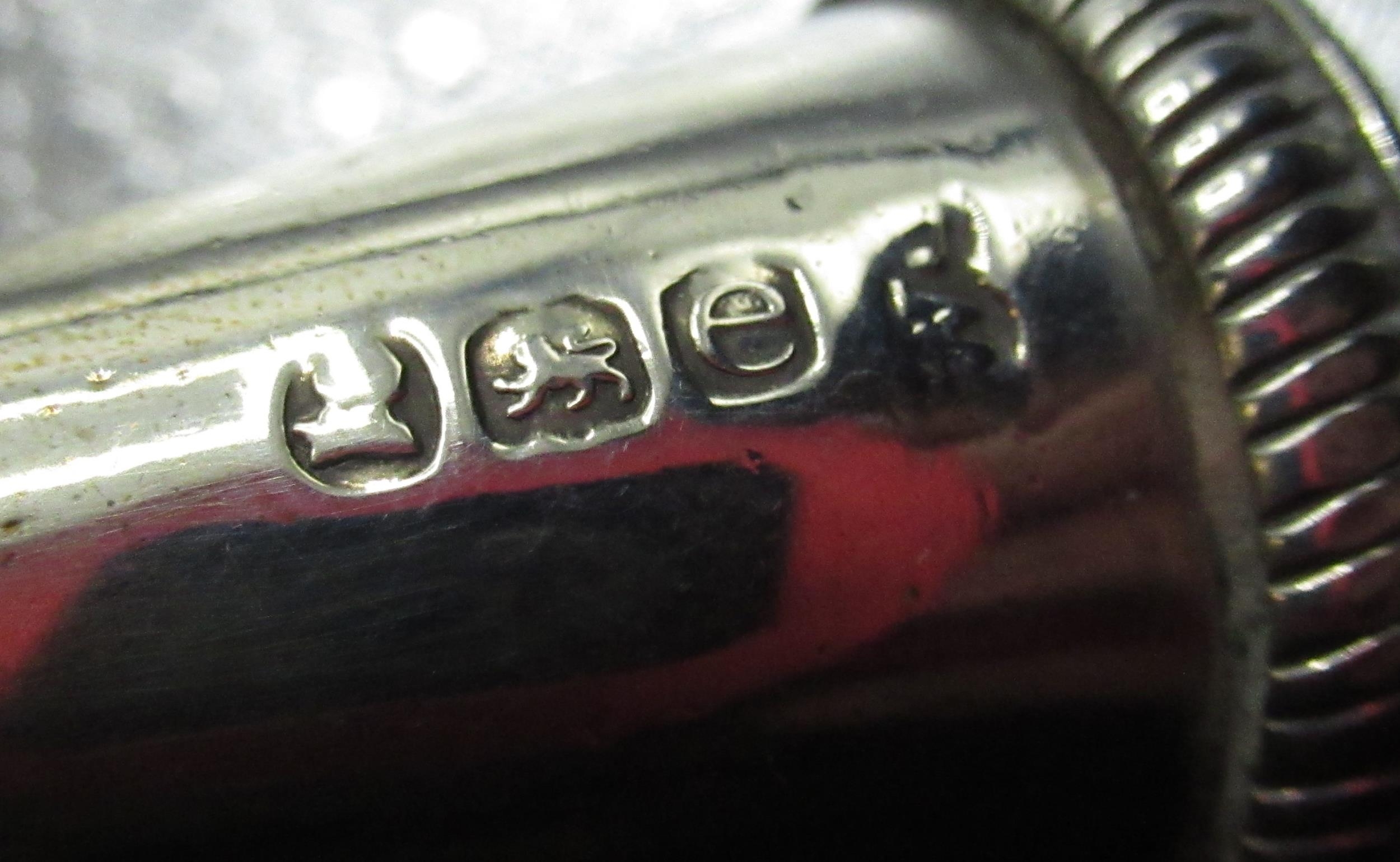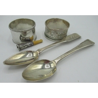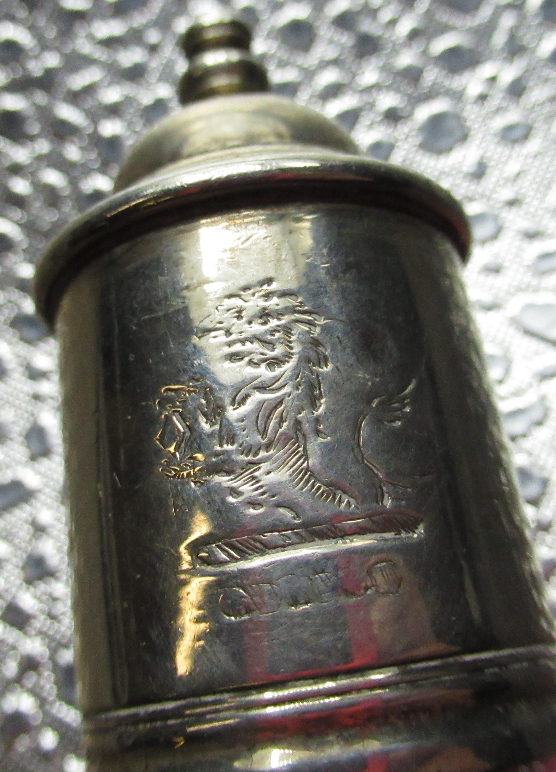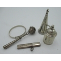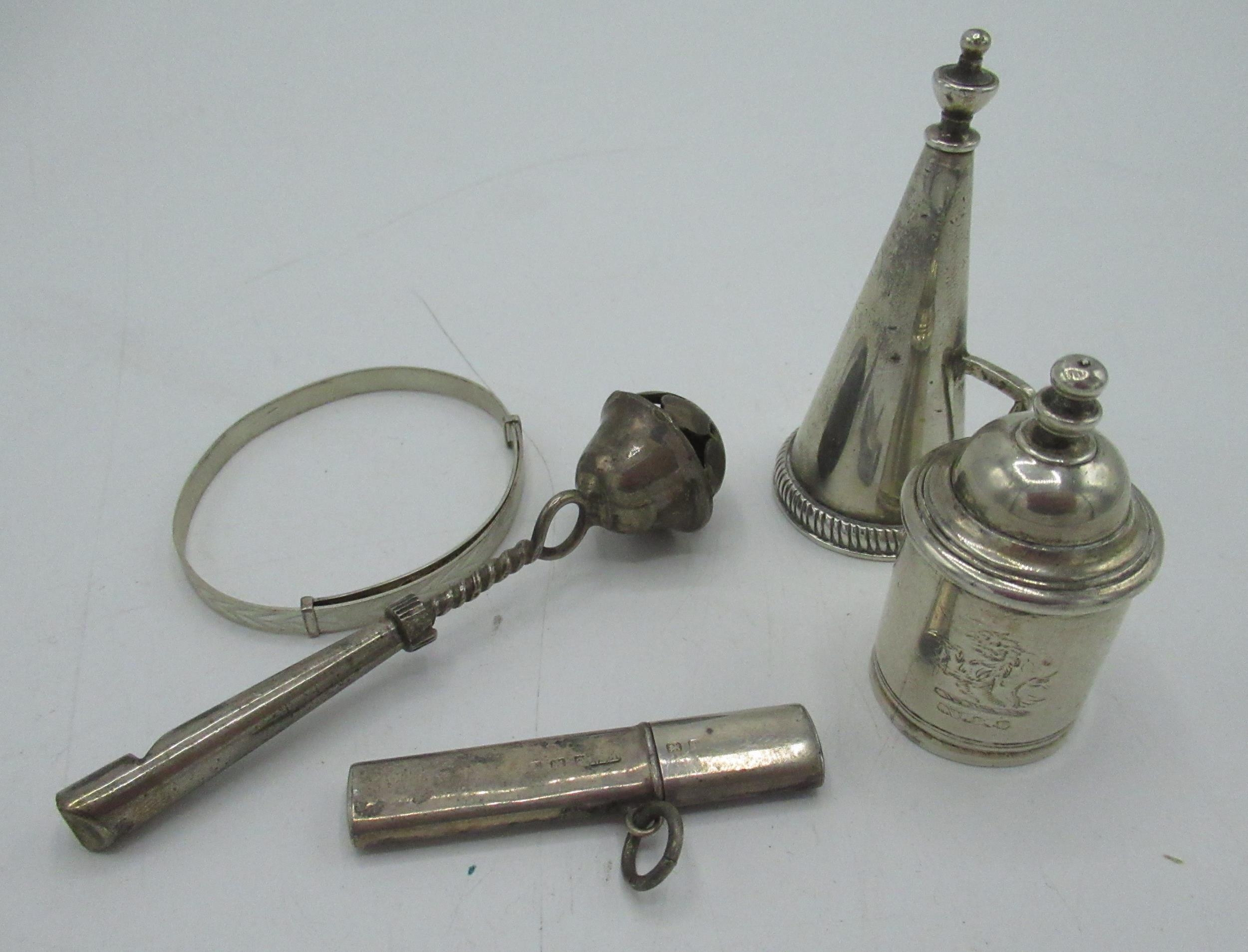 Edw.VII hallmarked Sterling silver needle case by Francis Webb, Birmingham, 1905 and unmarked white metal babies rattle, a hallmarked sterling silver snuff (marks rubbed), 1820, a child's bangle stamped silver and an unmarked white metal mount baring crest 2.4ozt
