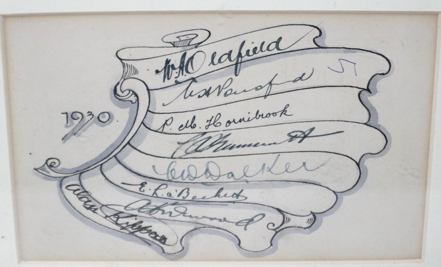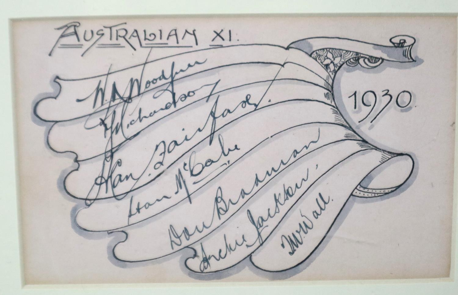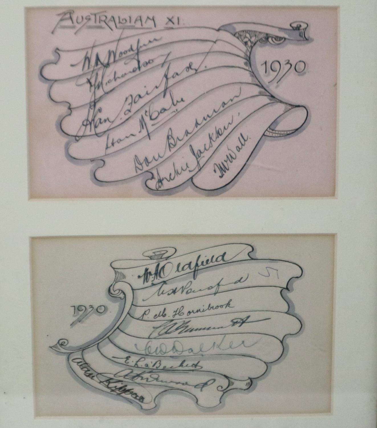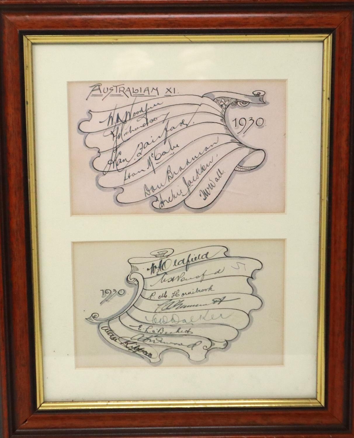 1930 Australia XI team signatures, including Wall, Jackson, McBale and others, across two pages later mounted and framed. P&P Group 3 (£25+VAT for the first lot and £5+VAT for subsequent lots)
