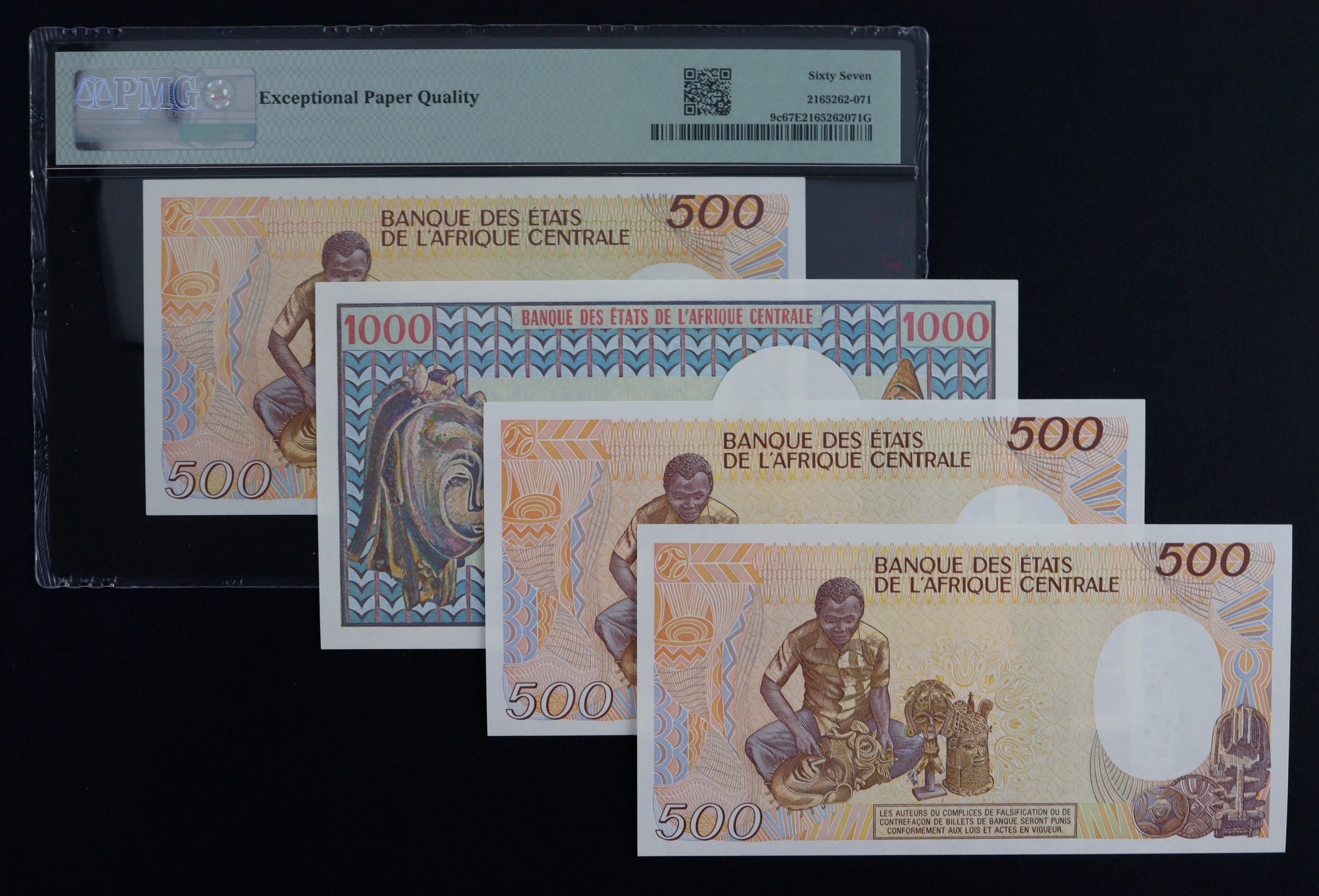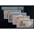 Chad (4), 1000 Francs dated 1st June 1980 serial O.14 10701 (BNB B206a, Pick7), 500 Francs dated 1st January 1987 serial Z.02 672146 & Z.02 673248 (BNB B208c, Pick9b), 500 Francs dated 1st January 1990 serial C.04 575518 (BNB B208d, Pick9bc) in PMG holder graded 67 EPQ Superb Gem Uncirculated, currently TOP POP the highest graded example in PMG population report, all Uncirculated