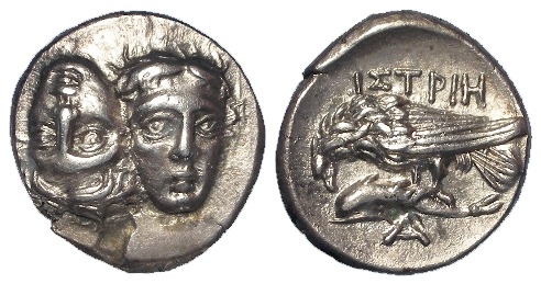 Ancient Greek: Moesia, Istros silver Drachm c.313-280 BC. Two facing youthful male heads facing, the left inverted. Rev. ΙΣΤΡΙH Sea-eagle standing to left, grasping dolphin with its talons; below, A. 5.25g. AEF, a good example in fine style.