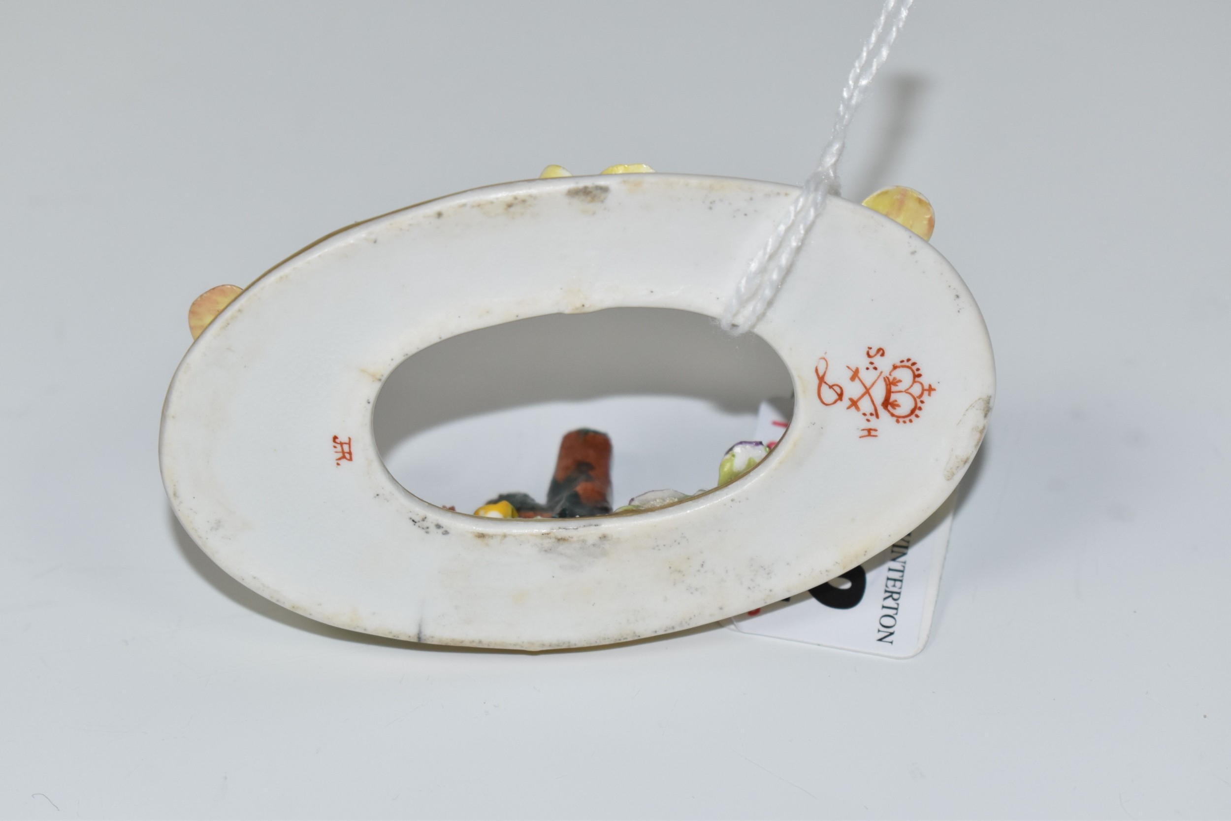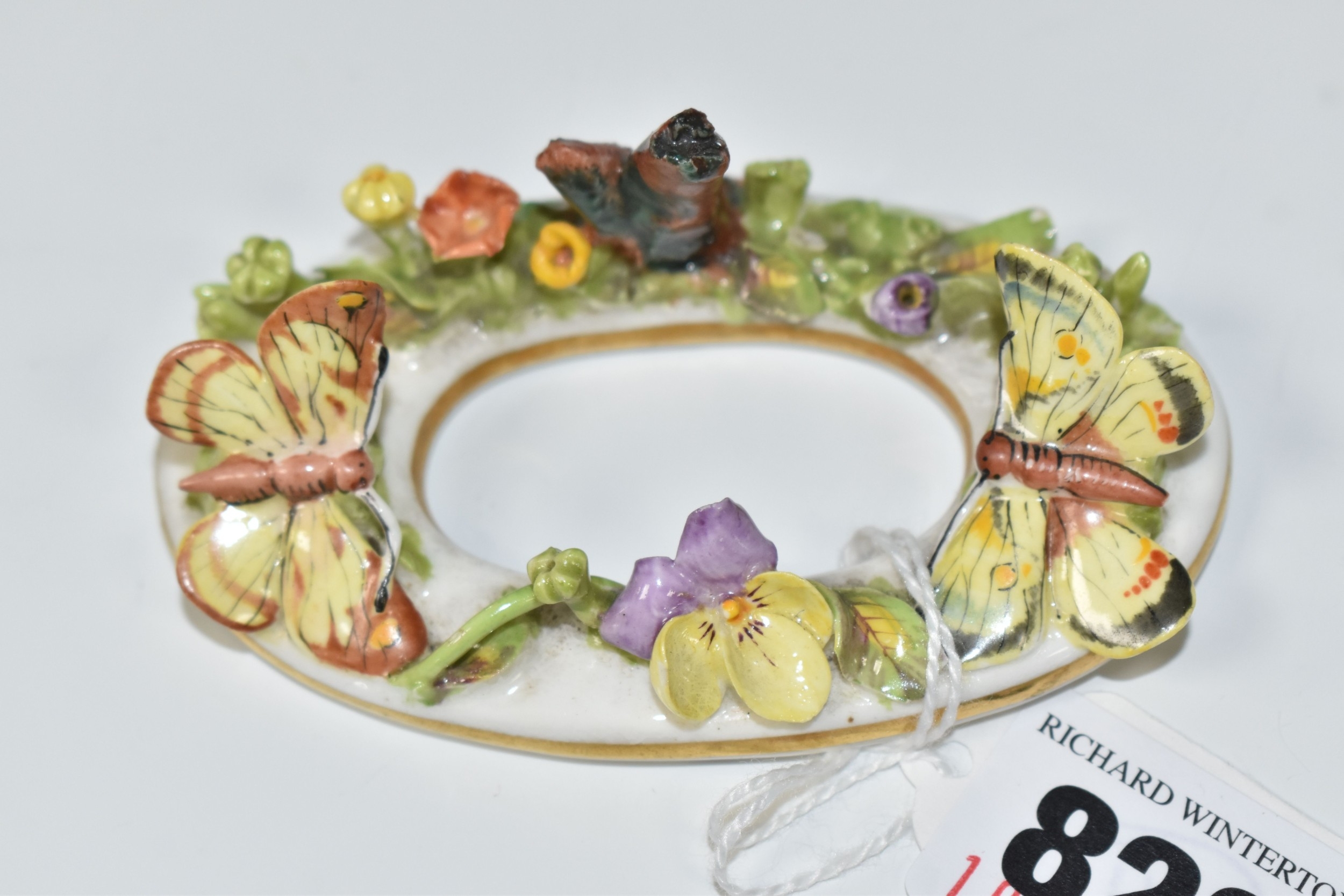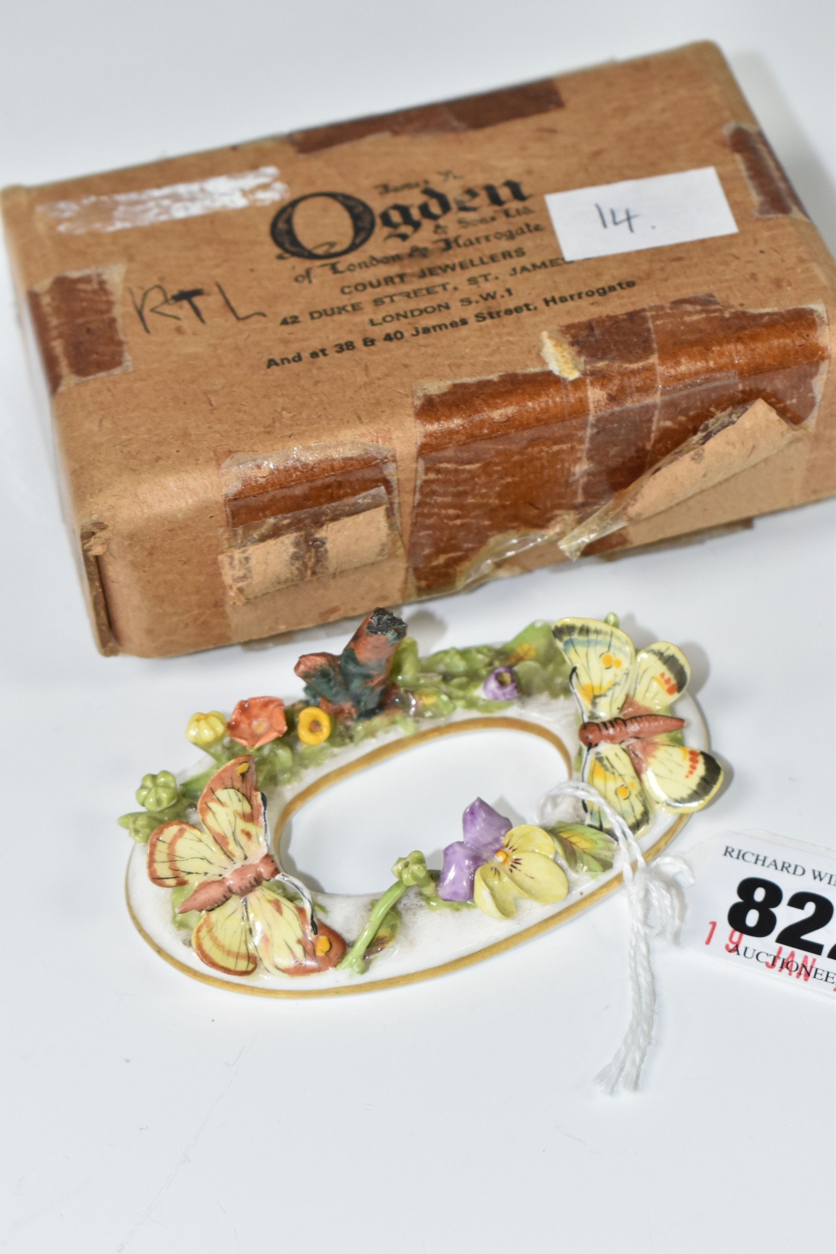 A LATE NINETEENTH STEVENSON AND HANCOCK MENU CARD HOLDER, modelled with flowers and butterflies, painted marks to base, width approximately 8.5cm, with a cardboard box marked 'James Ogden & Sons Ltd of London & Harrogate, Court Jewellers...' (1 + 1 box) (Condition Report: a few losses and chips to flowers and foliage, small partial hairlines visible underneath the base, light crazing, otherwise appears ok, box af)
