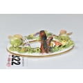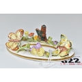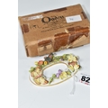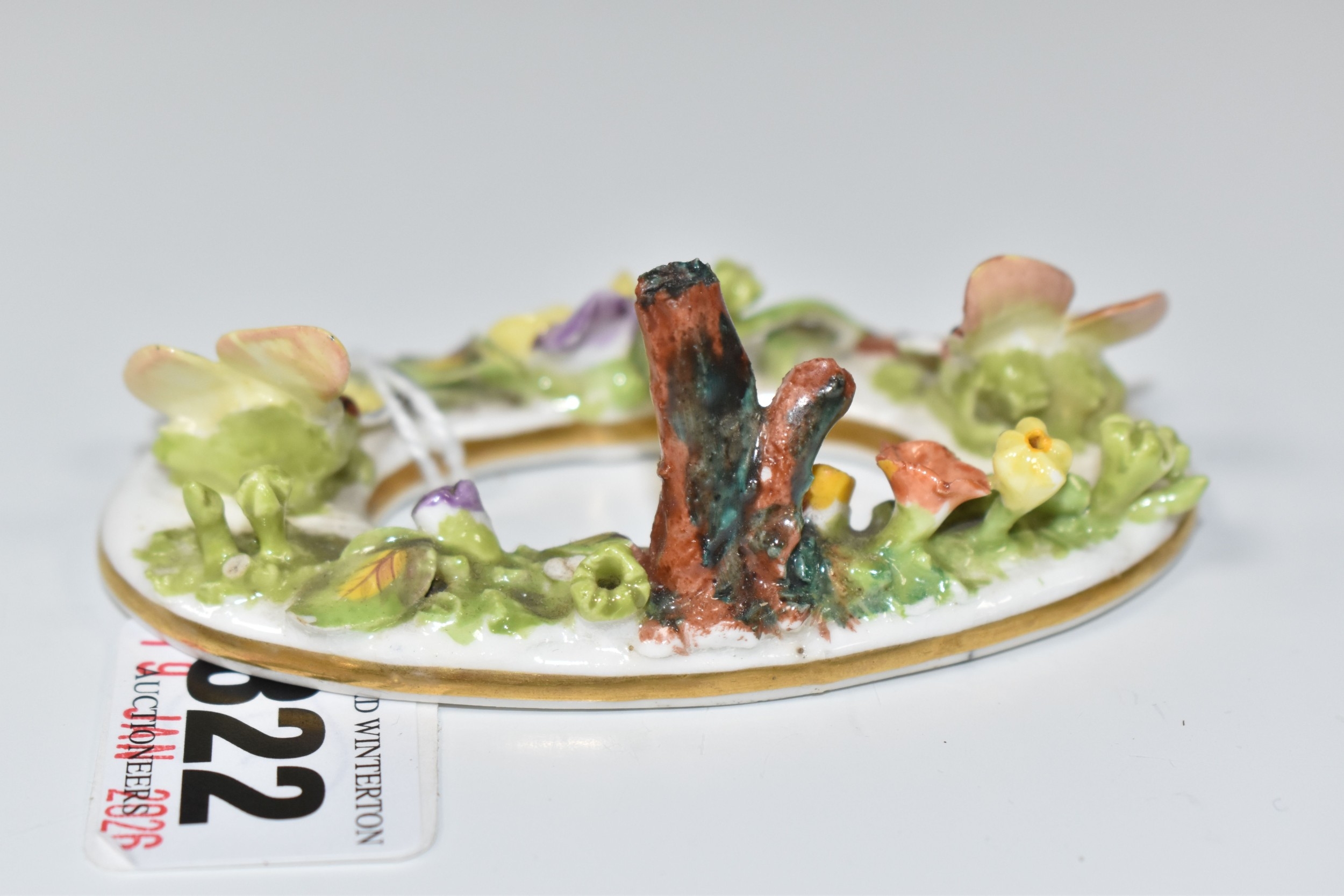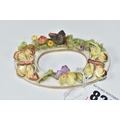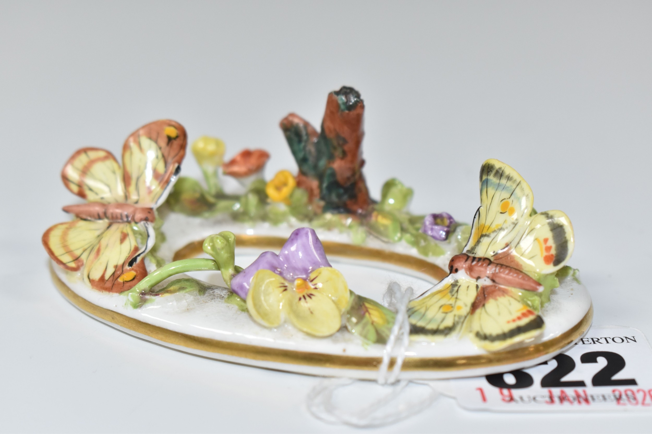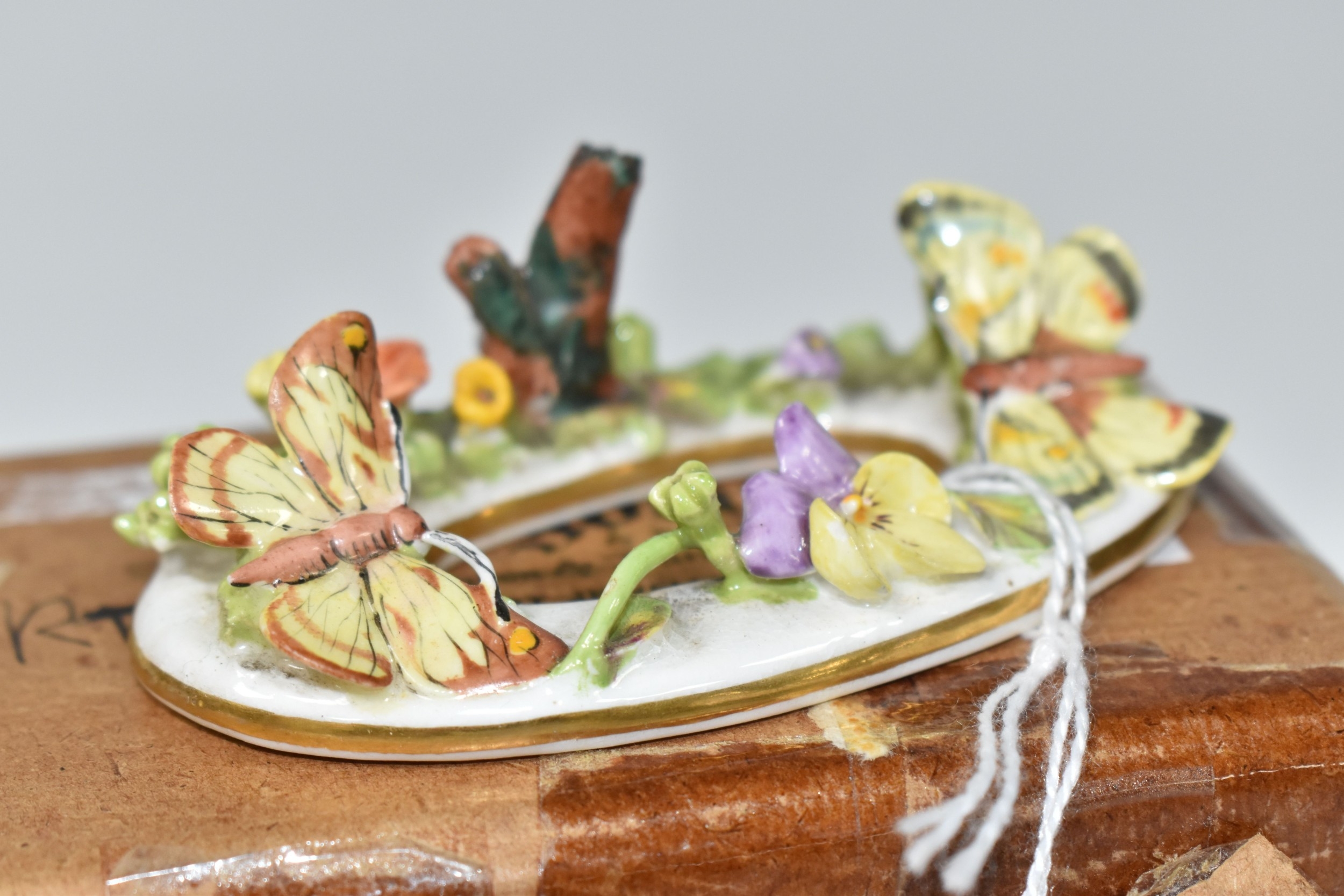 A LATE NINETEENTH STEVENSON AND HANCOCK MENU CARD HOLDER, modelled with flowers and butterflies, painted marks to base, width approximately 8.5cm, with a cardboard box marked 'James Ogden & Sons Ltd of London & Harrogate, Court Jewellers...' (1 + 1 box) (Condition Report: a few losses and chips to flowers and foliage, small partial hairlines visible underneath the base, light crazing, otherwise appears ok, box af)