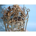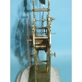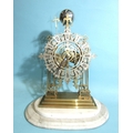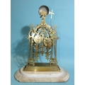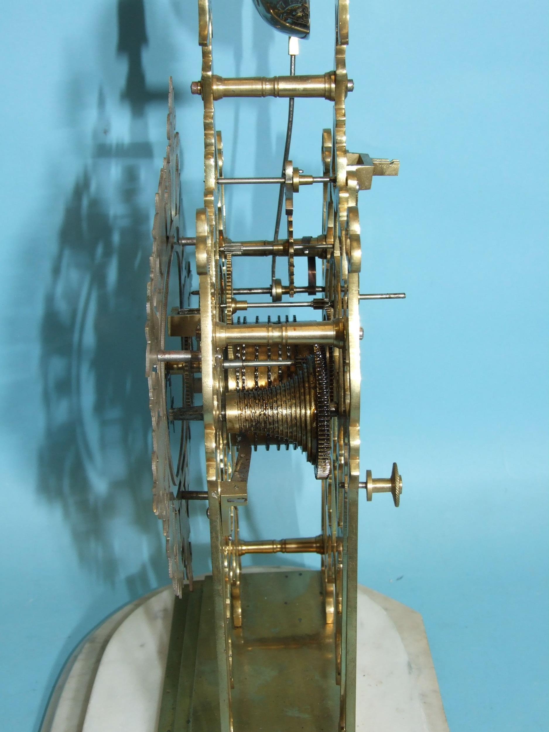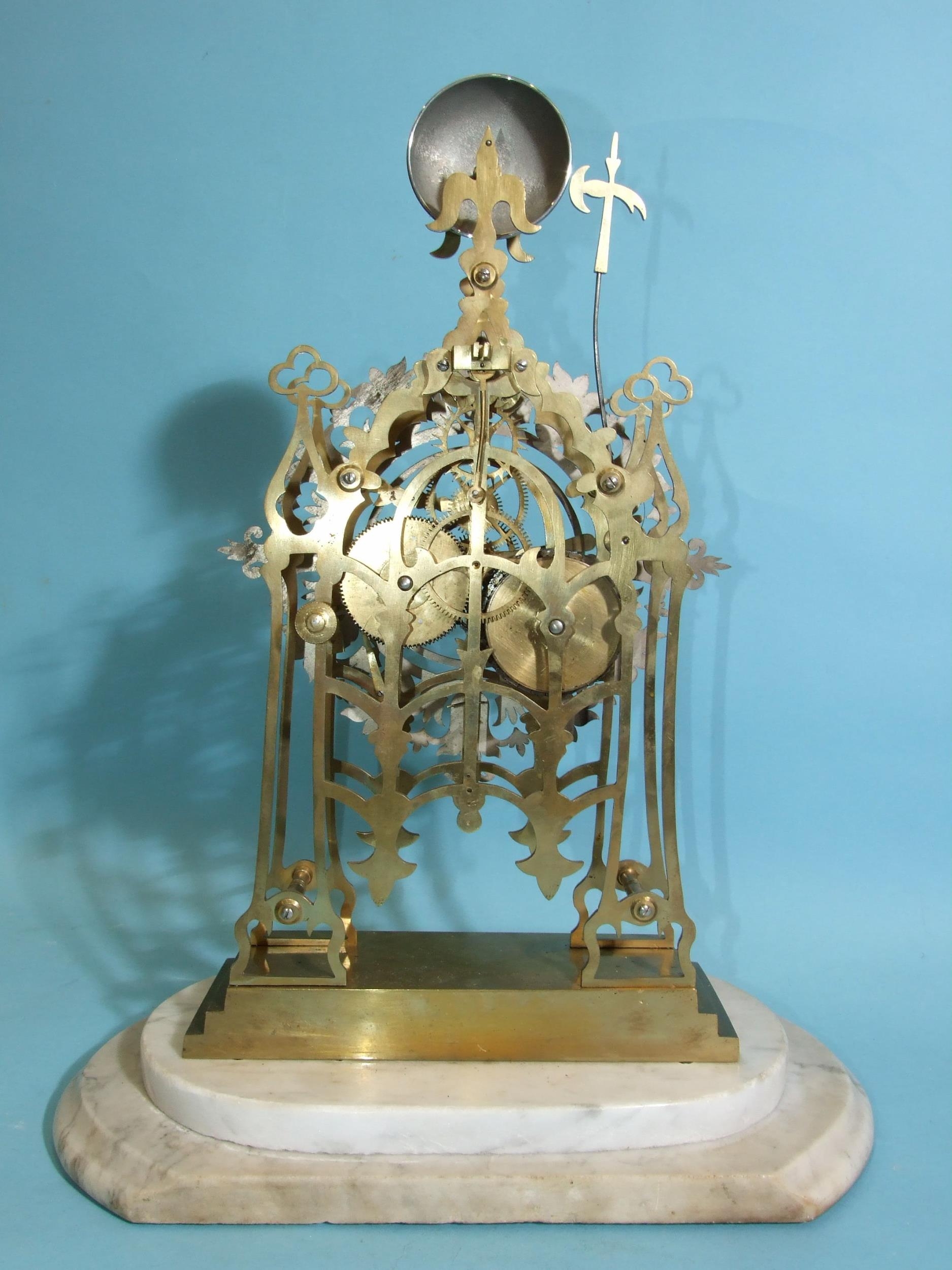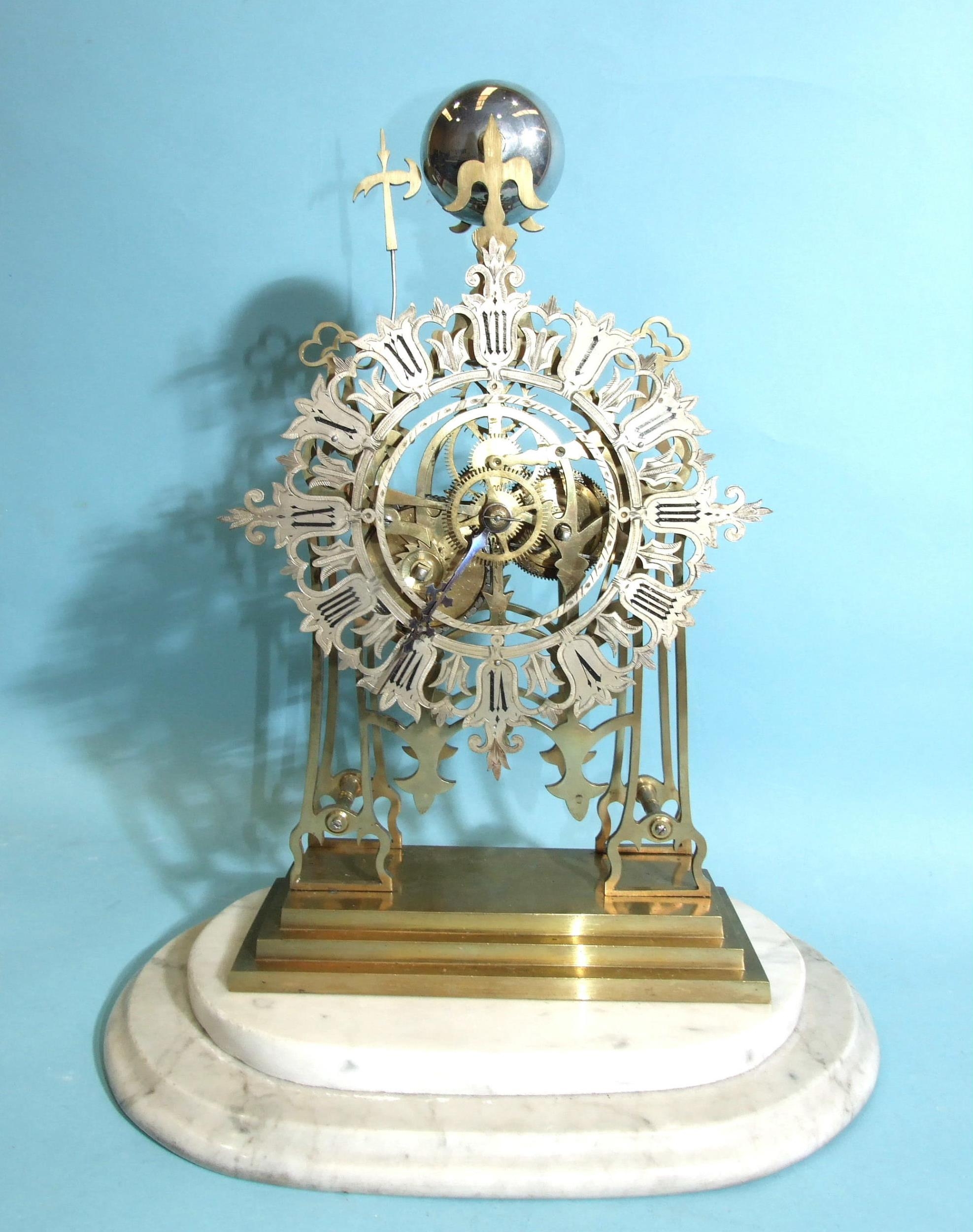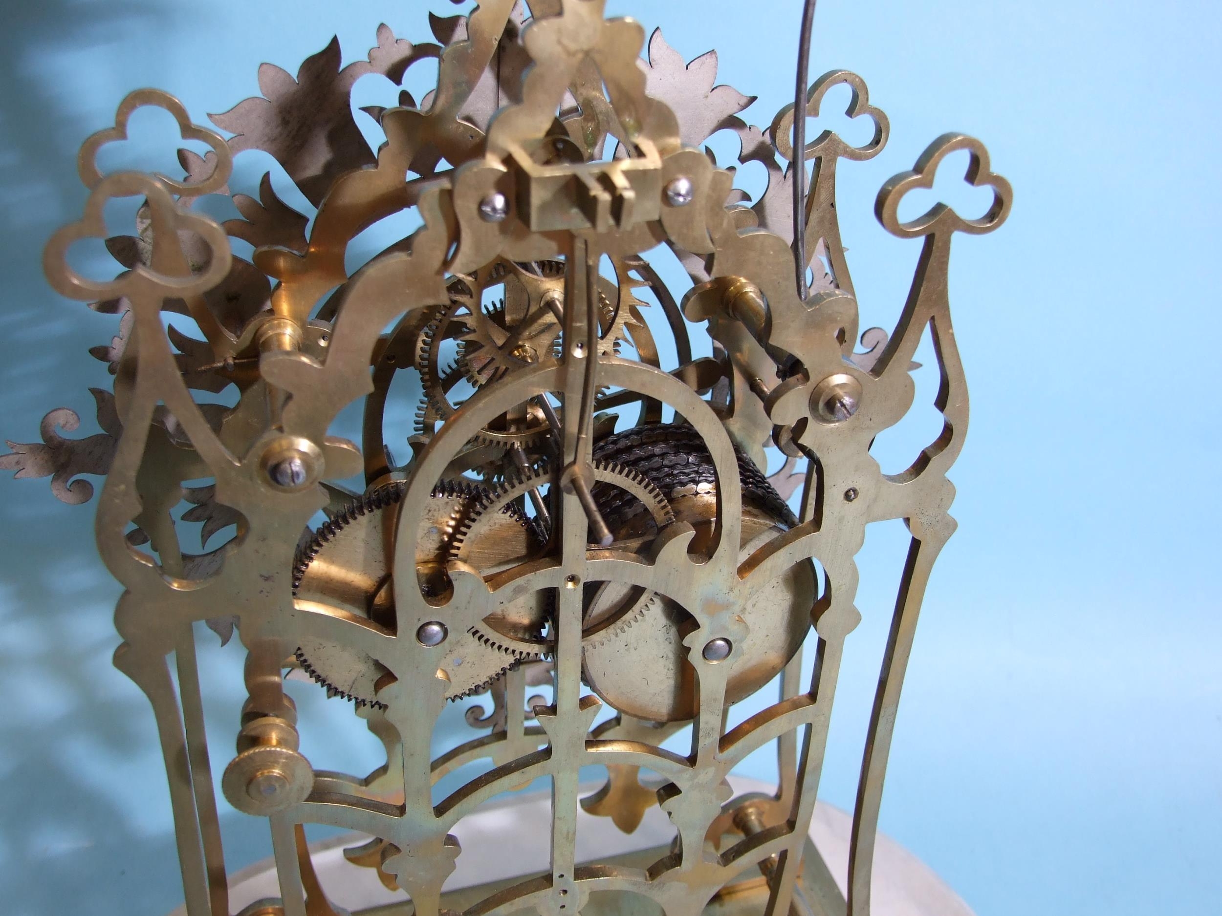 A 19th century brass skeleton clock, the frame of simple Gothic design surmounted by trefoils and raised on stepped brass plinth and marble base, the 24cm pierced silvered dial inscribed with Roman numerals, the fusée movement striking on a bell, on oval white marble base, 42cm high, 47cm including base, under glass dome.