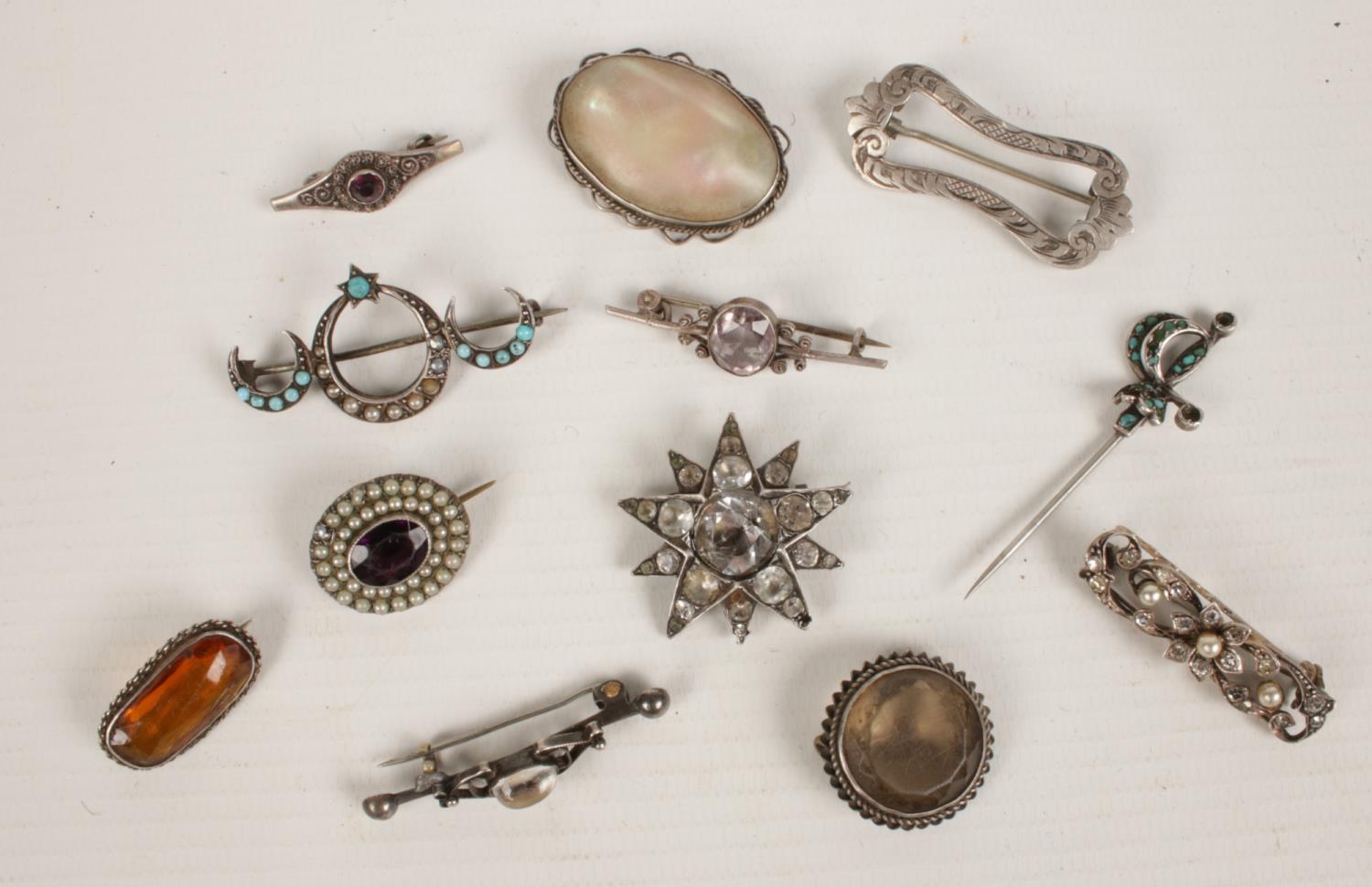 12 silver brooches. Paste set examples etc.