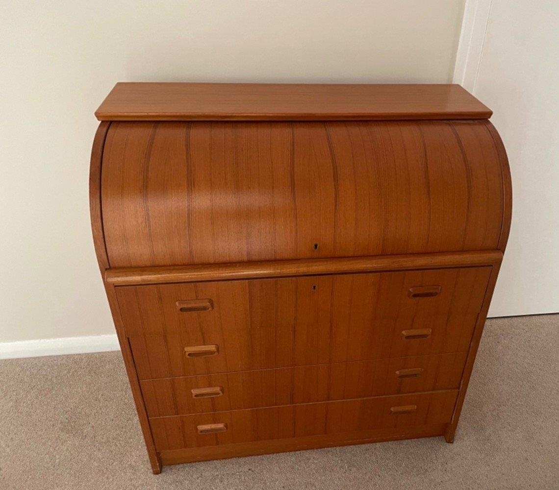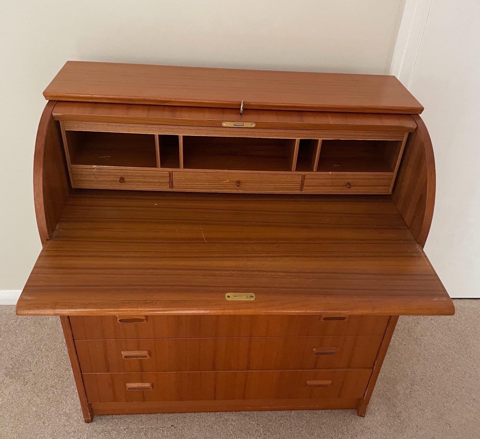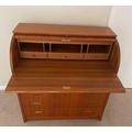 A RETRO teak roller top bureau with two keys 3ft length x 18”depth approx