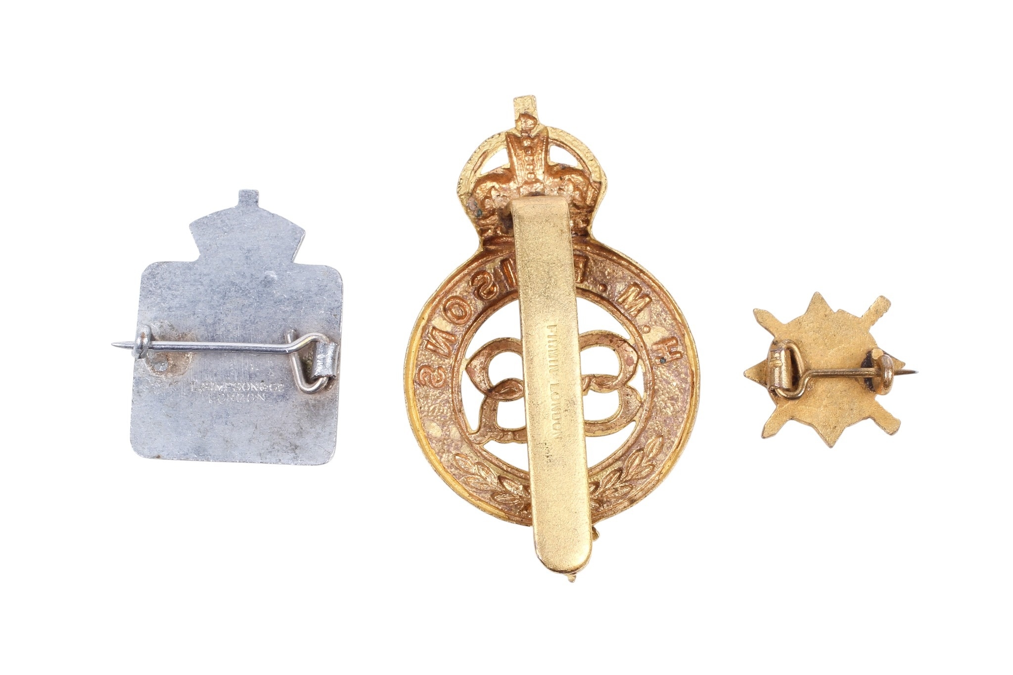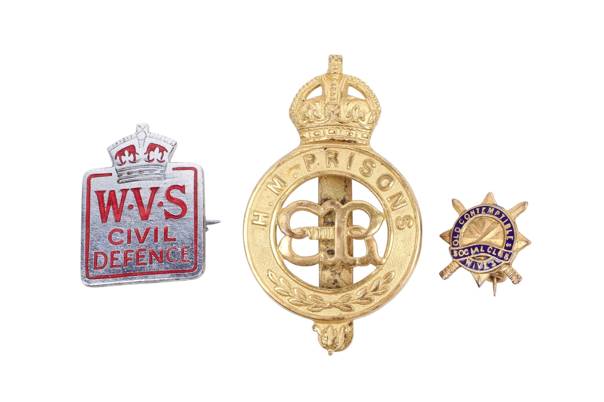 Three military and civil badges. Comprising an Edward VIII HM Prisons badge, a small blue enamelled 'Old Contemptibles Wives Social Club' brooch, and a WVS Civil Defence brooch. The Old Contemptibles Wives Social Club was formed to support the wives of the Old Contemptibles, who were the survivors of the British Expeditionary Force in France and Flanders during World War I. The first meeting was held in March 1935 and by 1952 groups had formed as far away as New Zealand.