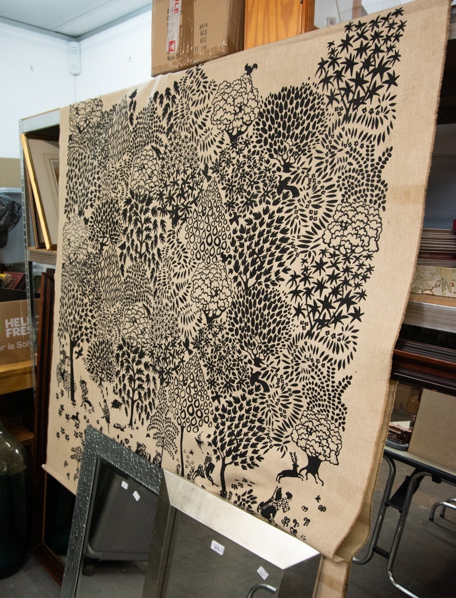 BLACK PRINTED FOREST AND HUNTING SCENE
