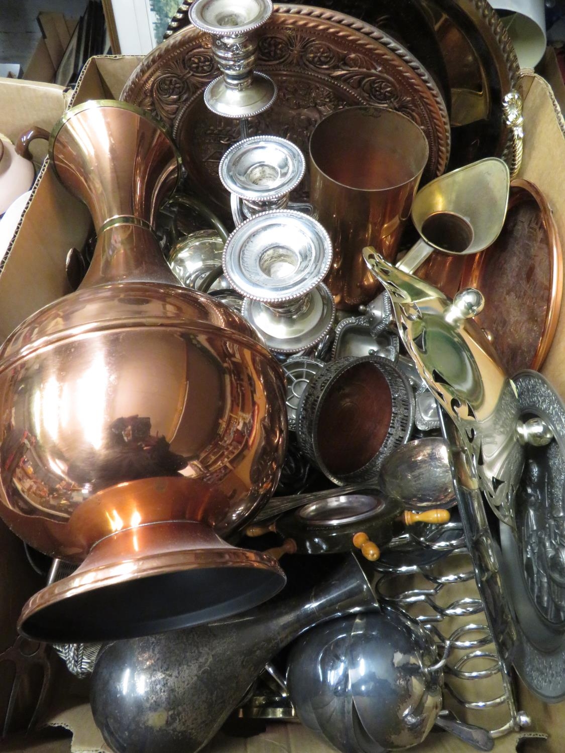 Silver plated three branch candelabra, epns toast rack other silver plated ware and brassware